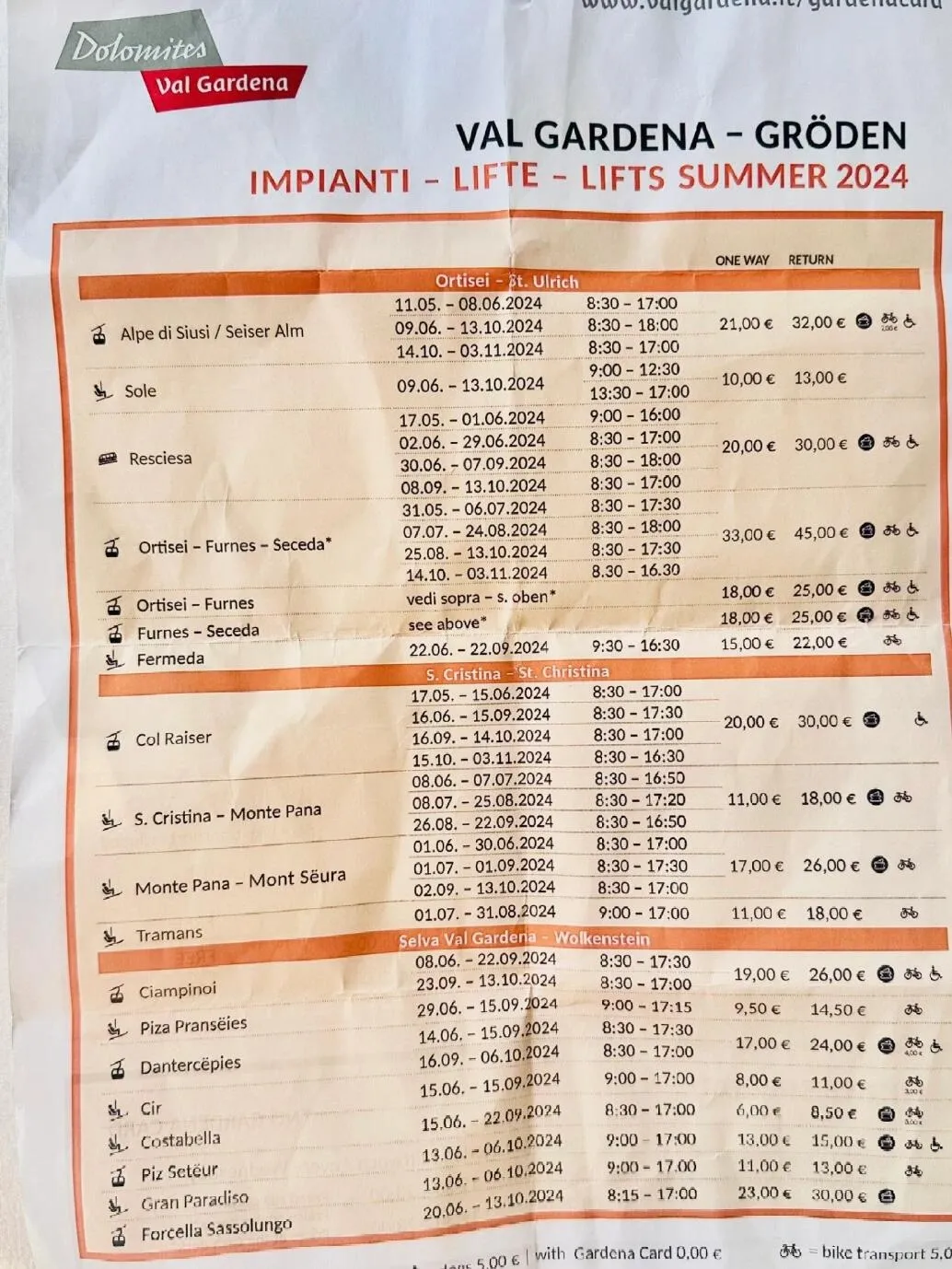 2024年夏季缆车天票价格为62欧元 。如果按照上述路线单独购票,总计花费约154欧元,相比之下天票更加划算。建议提前查询各缆车的具体运营时间,以便合理安排行程。Val Gardena的缆车系统让游客能够轻松领略多洛米蒂山脉的壮丽景色,是一次难忘的高山之旅。
