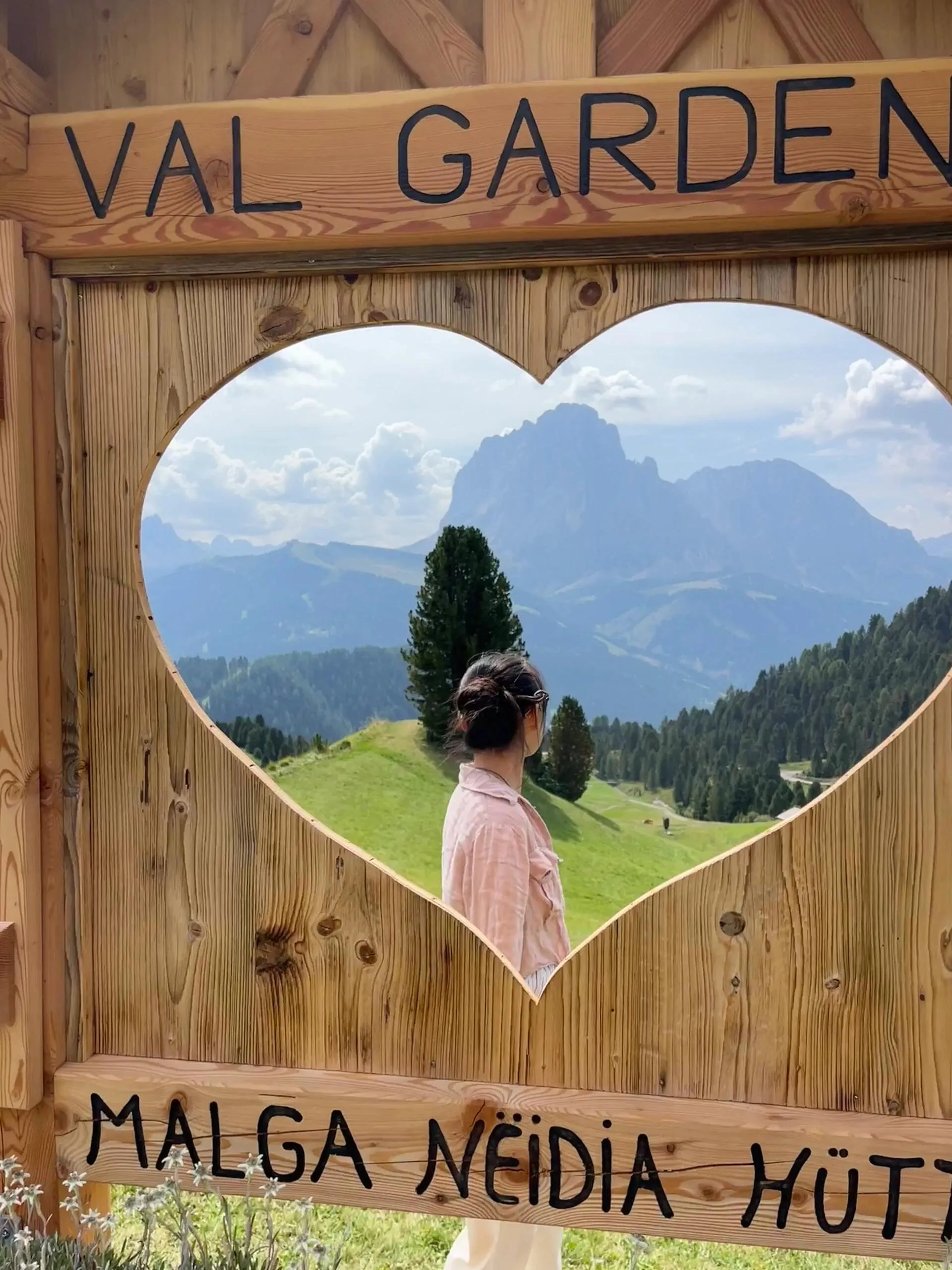 从Ortisei出发,乘坐4号和5号Seceda缆车直达山顶。出站后步行10分钟到达观景台步道。在山顶搭乘开放式滑雪缆车6号下到半山腰,这里有P5/P11的爱心木框,对面可以欣赏休斯高原的美景。从这里步行20分钟(上坡)可到达7号缆车站。