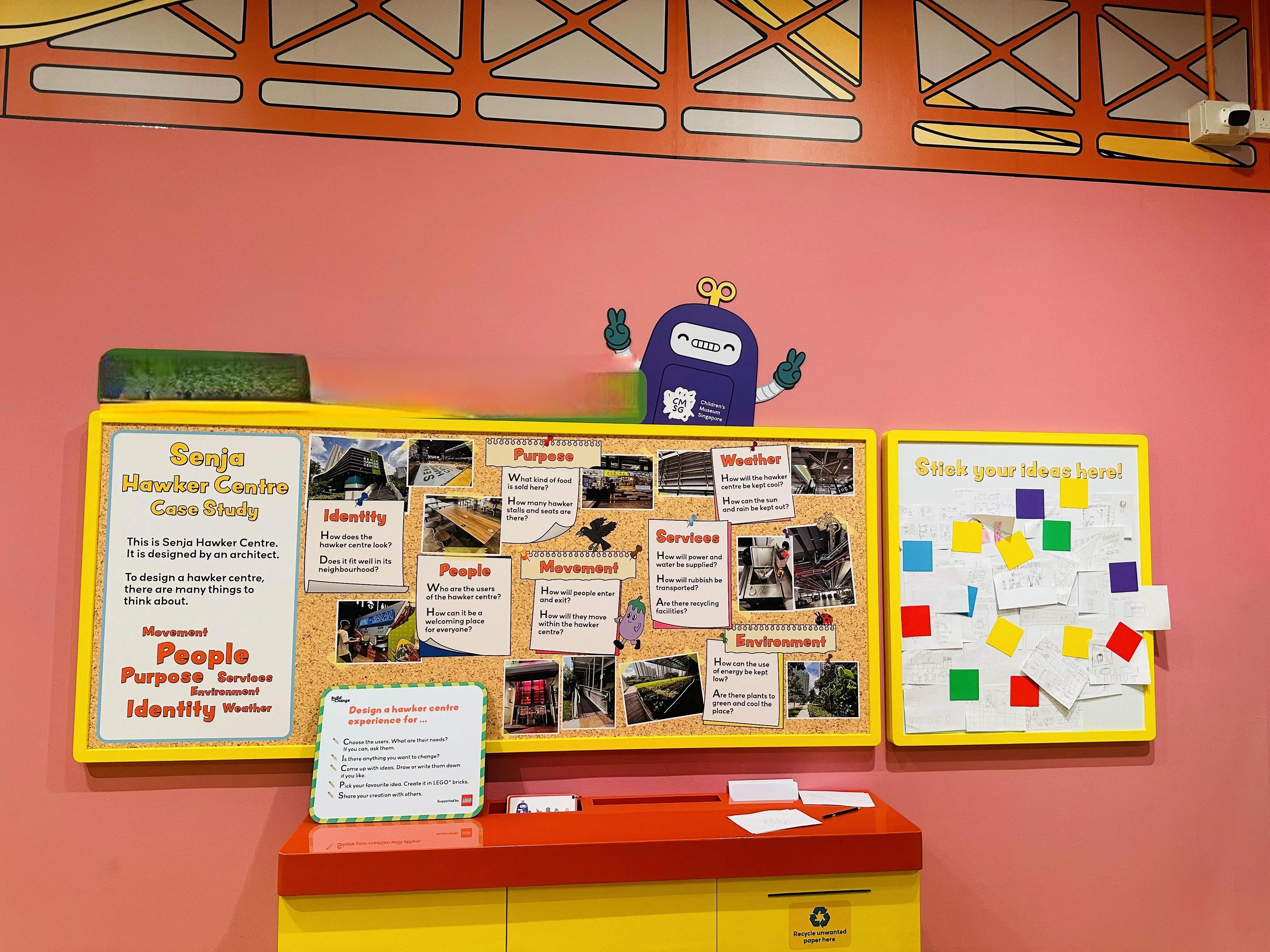 儿童博物馆中展示了新加坡的国民美食,孩子们可以在各个档口模拟当厨师。特别的是,这里还设有乐高桌,鼓励小朋友设计并搭建自己的小贩中心(Hawker Centre)。这种设计让孩子们更深入地理解这些工作及其对生活的影响。