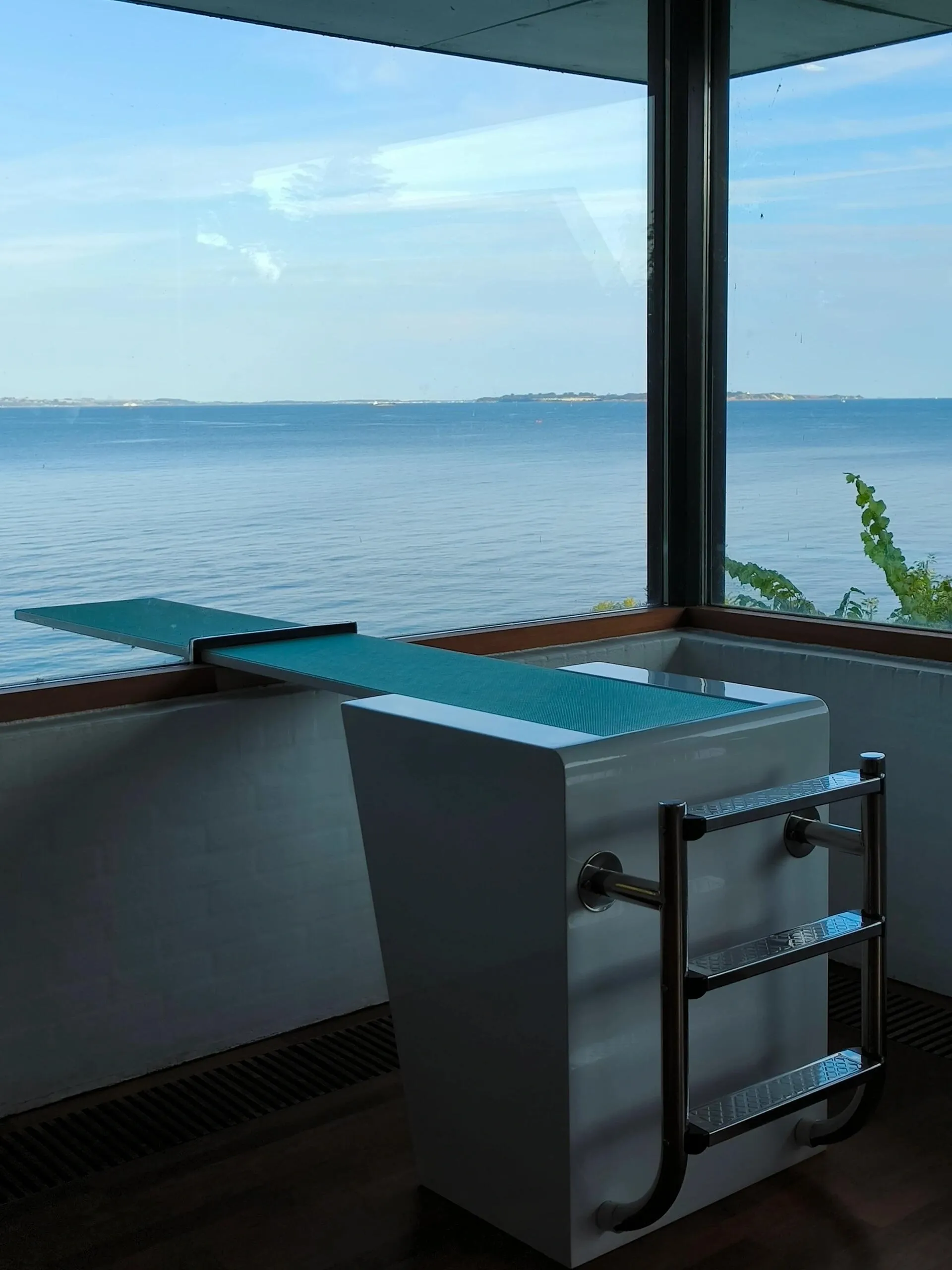 园区内有一个引人注目的装置艺术品 - 一块面向大海的跳板 。站在跳板上,眺望茫茫大海,不禁让人产生一种想要跳入海中的冲动。这个装置恰好位于花园和展览入口的休息区,为游客提供了一个舒适的观景点。