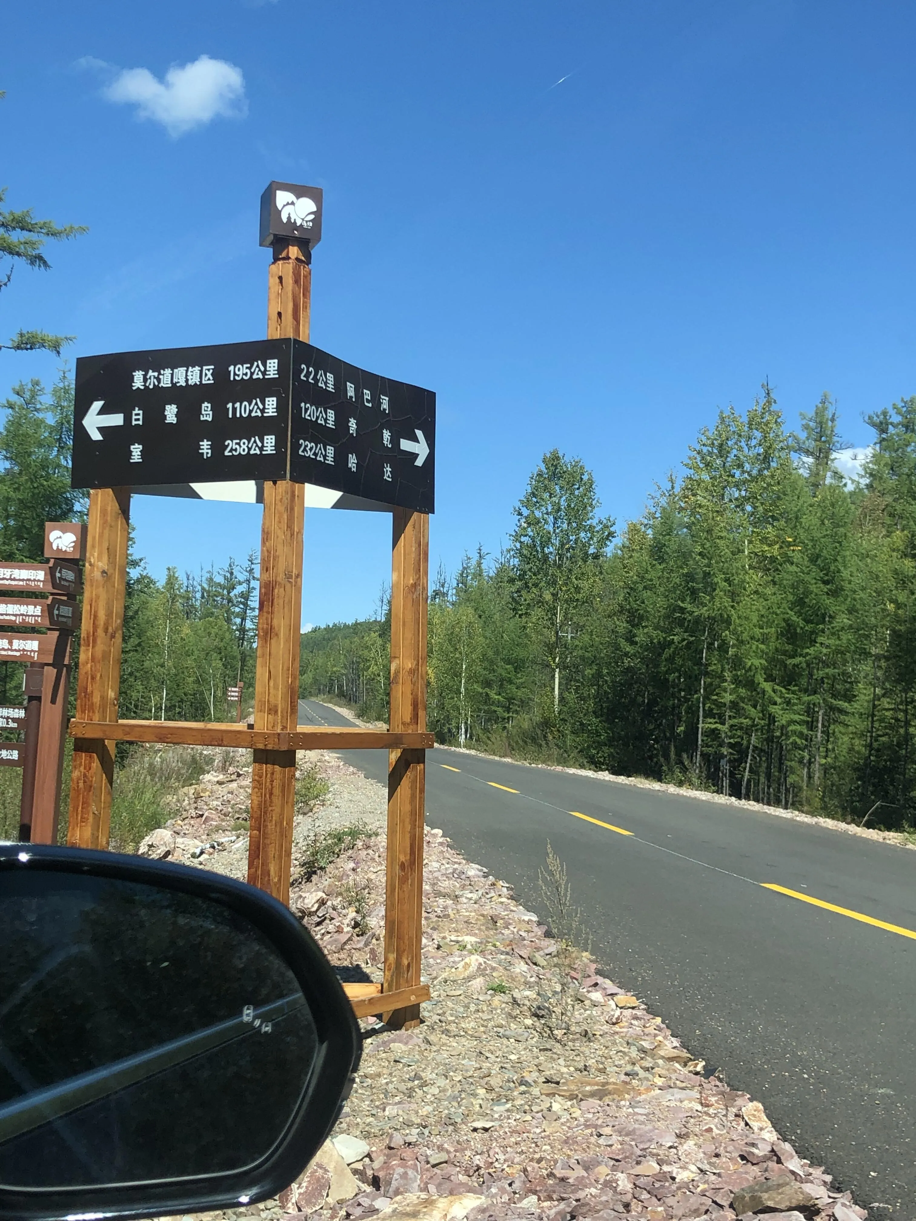 刚进入就能看到指示牌,全程路况良好。途中可以经过莫尔道嘎公园,园内有观光小火车(100元/人,游览时间约1.5小时),可以欣赏林间景色。导航显示6小时到达室韦,实际只用了4.5小时。