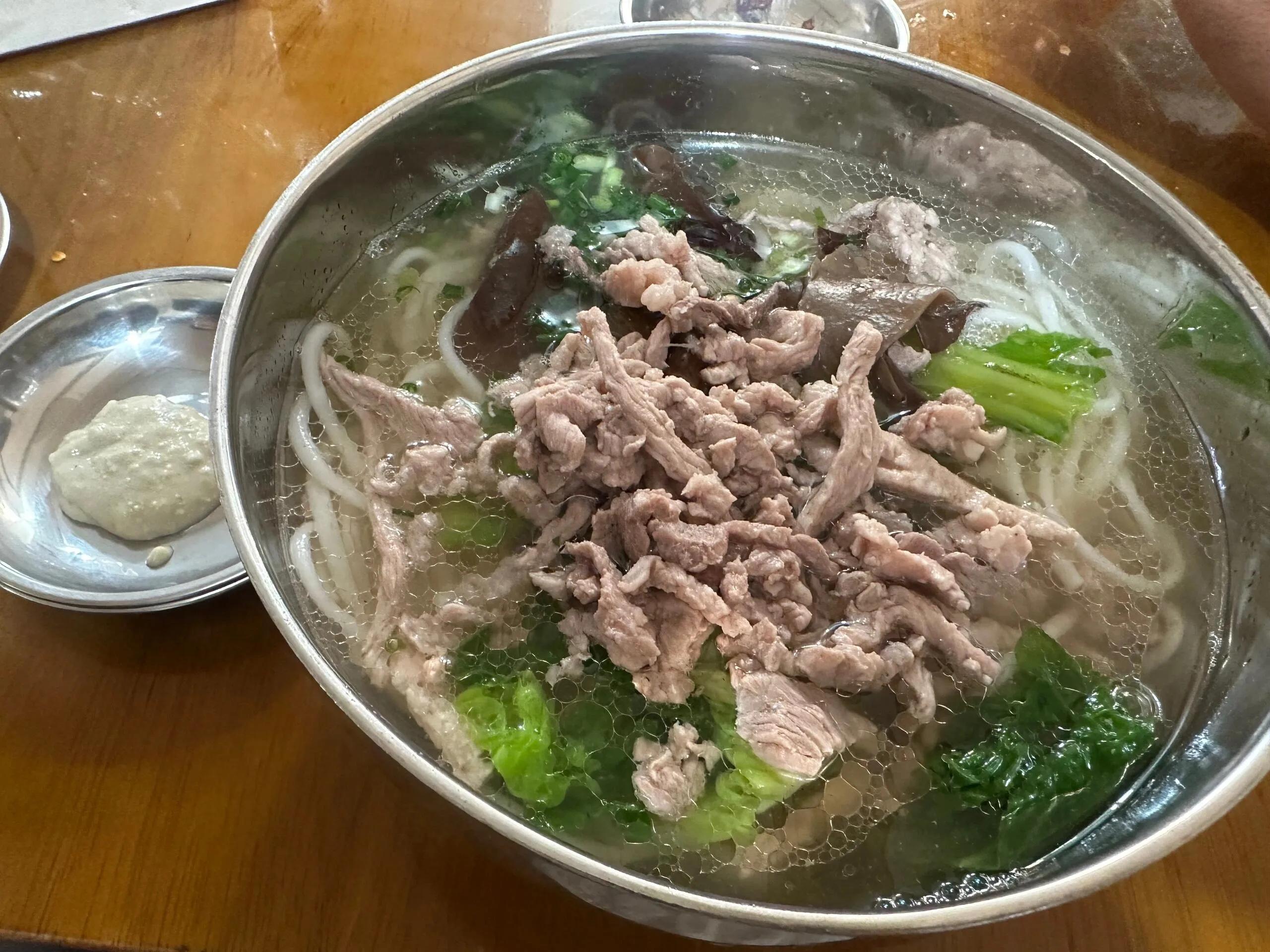 行程从早餐开始,品尝了当地的三鲜粉,鲜美可口。随后前往韭菜坪,途中在附近享用了一顿柴火鸡。值得一提的是, 贵州当地的青菜供应充足,随意取用。 烙在锅旁的玉米饼口感极佳,令人回味无穷。