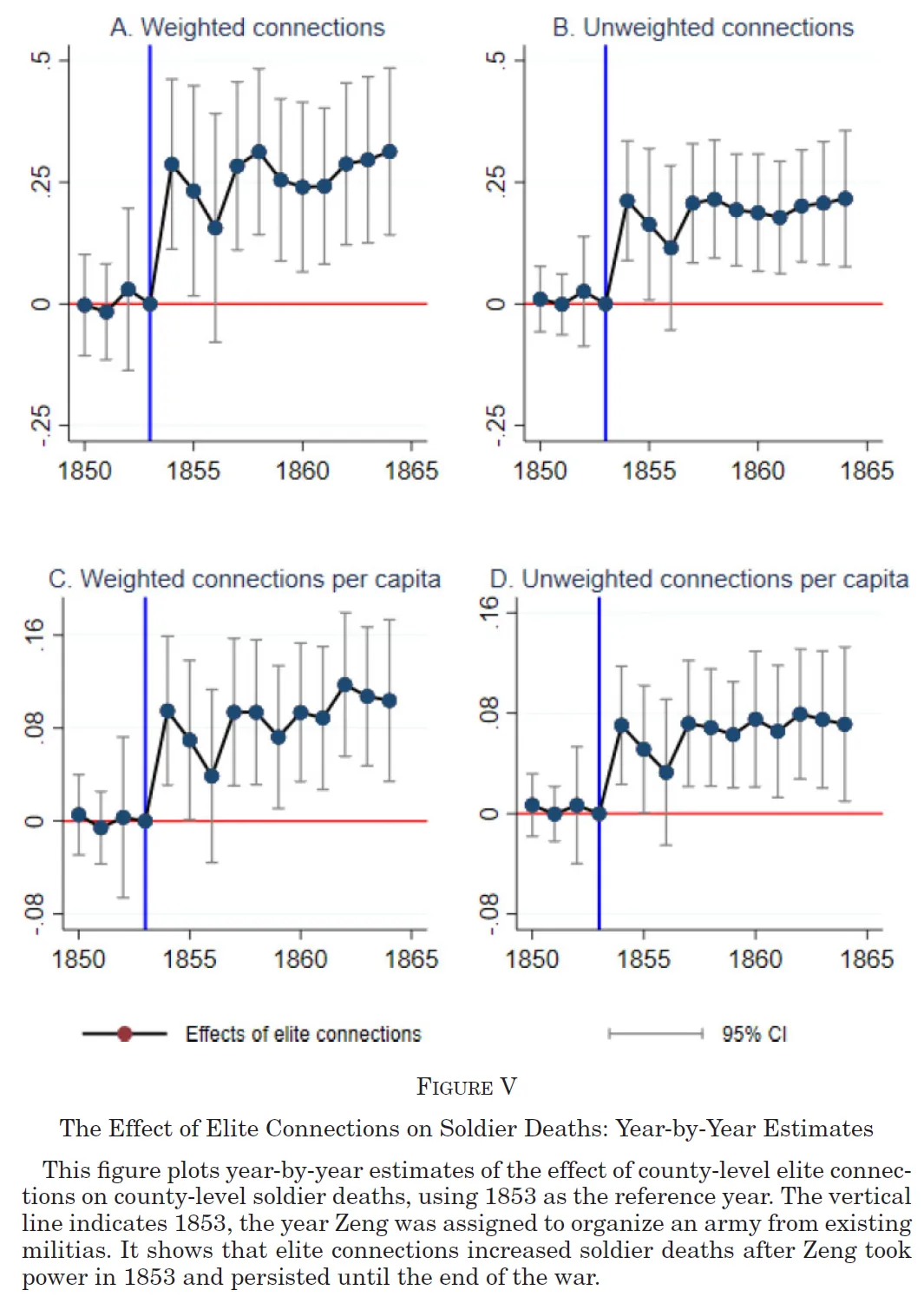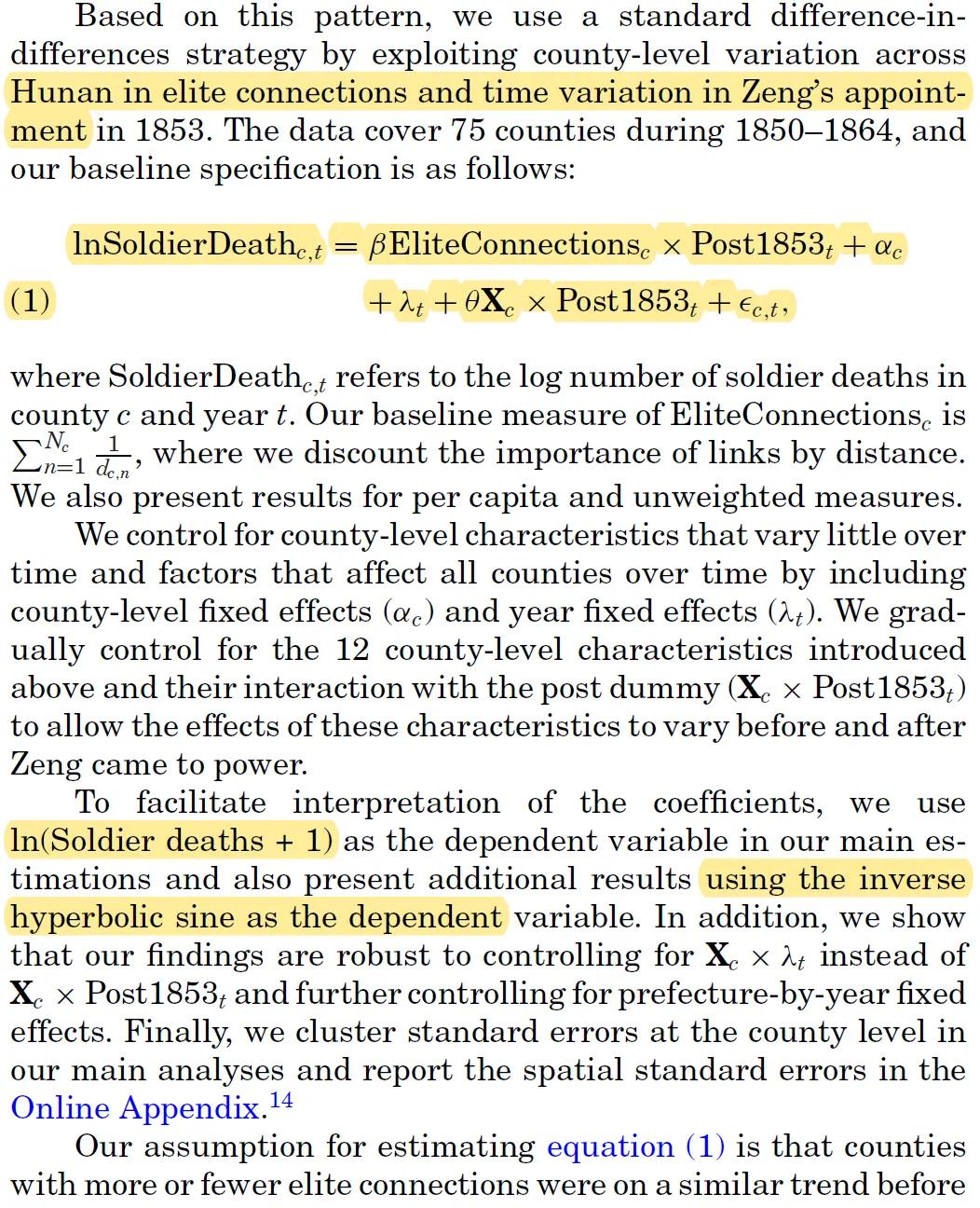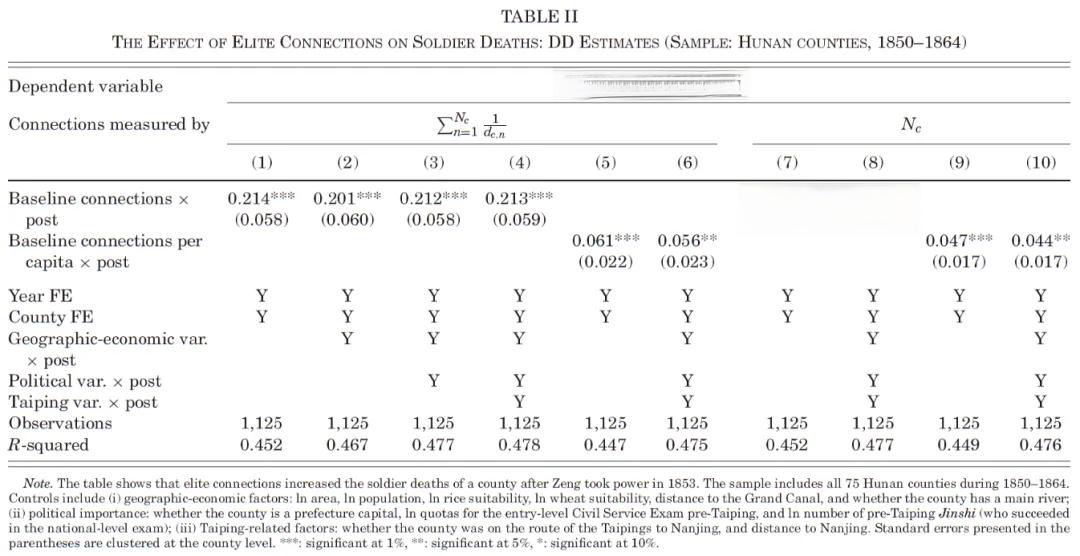 研究发现突出的两点:(i)曾国藩掌权后,那些在其网络中拥有更多战前精英的县,士兵死亡人数有所增加;(ii)战后政治权力明显向这些精英的家乡转移,造成国家层面的权力分配不平衡。