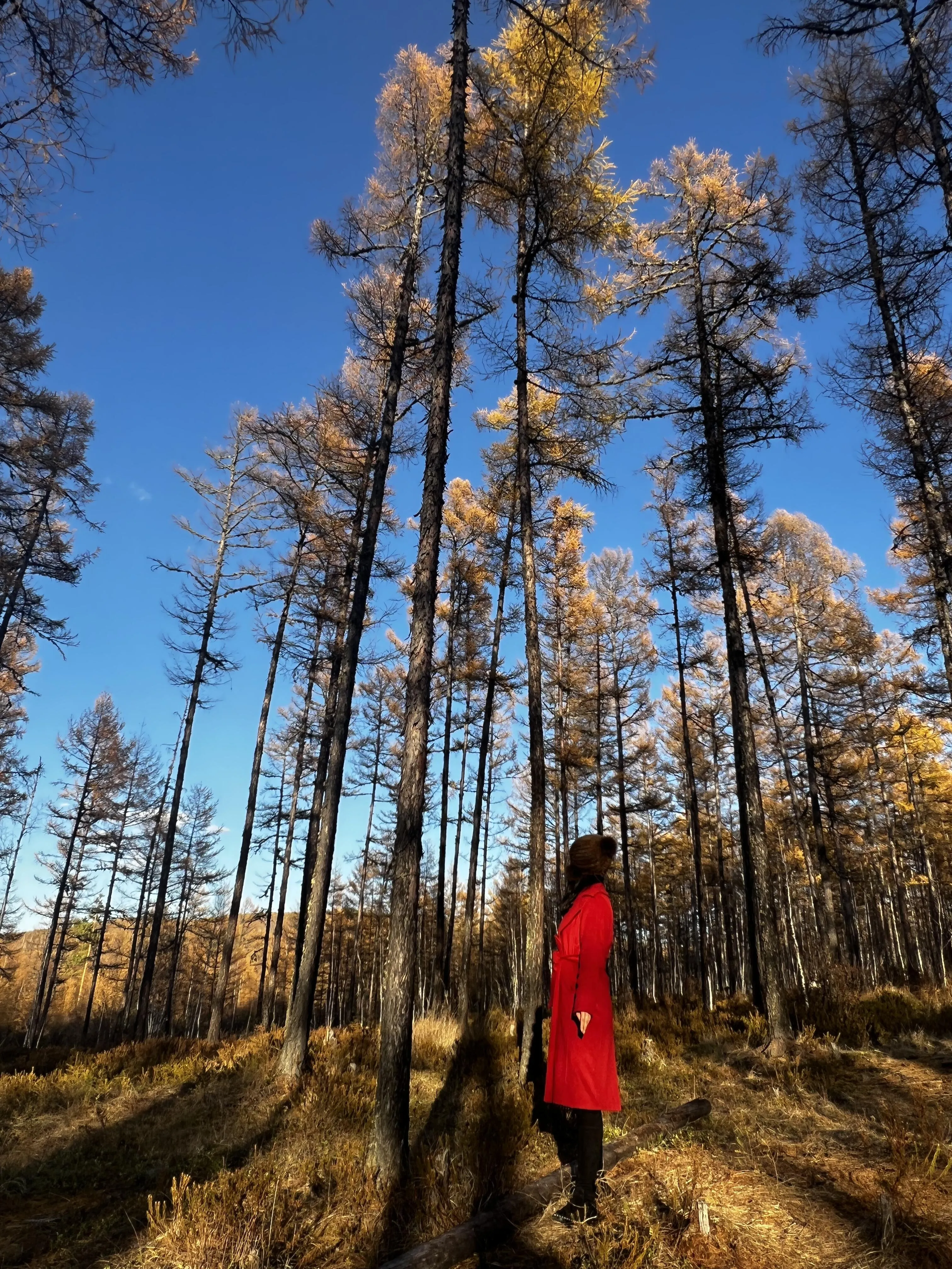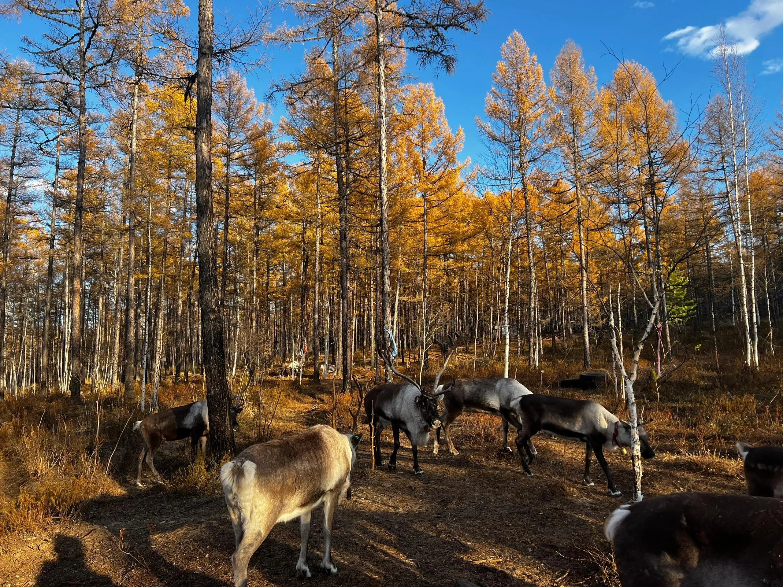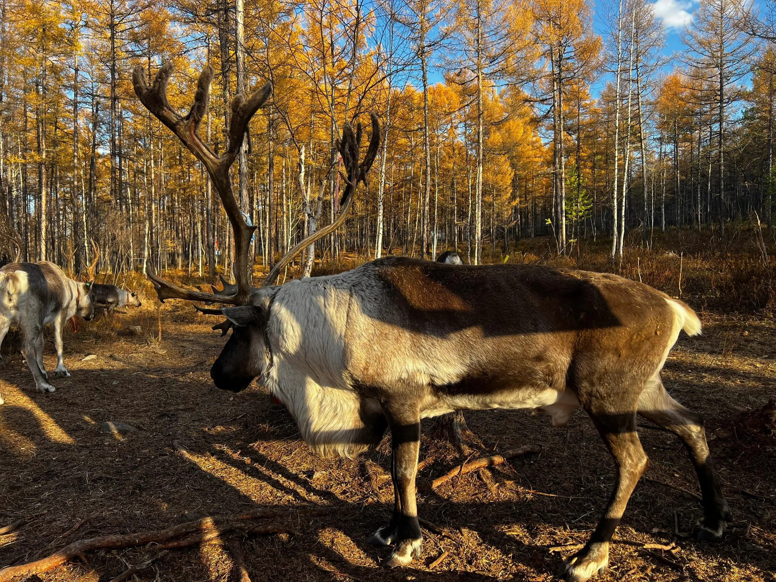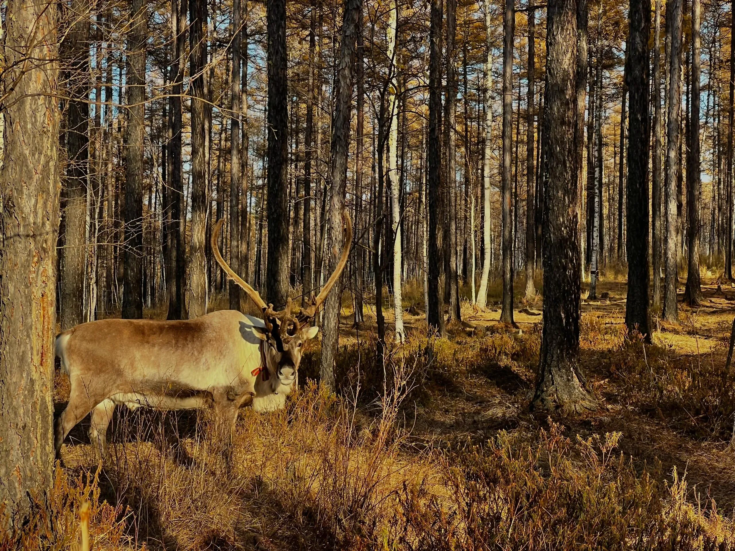 补给完毕后,我们继续北上前往漠河。离开满归镇不久,秋色开始变得萧条。在更北方,温暖阳光的秋天被寂寥的寒冷所取代。途中, 我们路过了一个驯鹿部落,这是我第一次见到真正的驯鹿 ,让我想起了《额尔古纳河右岸》中的描写,以及它们作为鄂温克族人的好助手和森林精灵的形象。