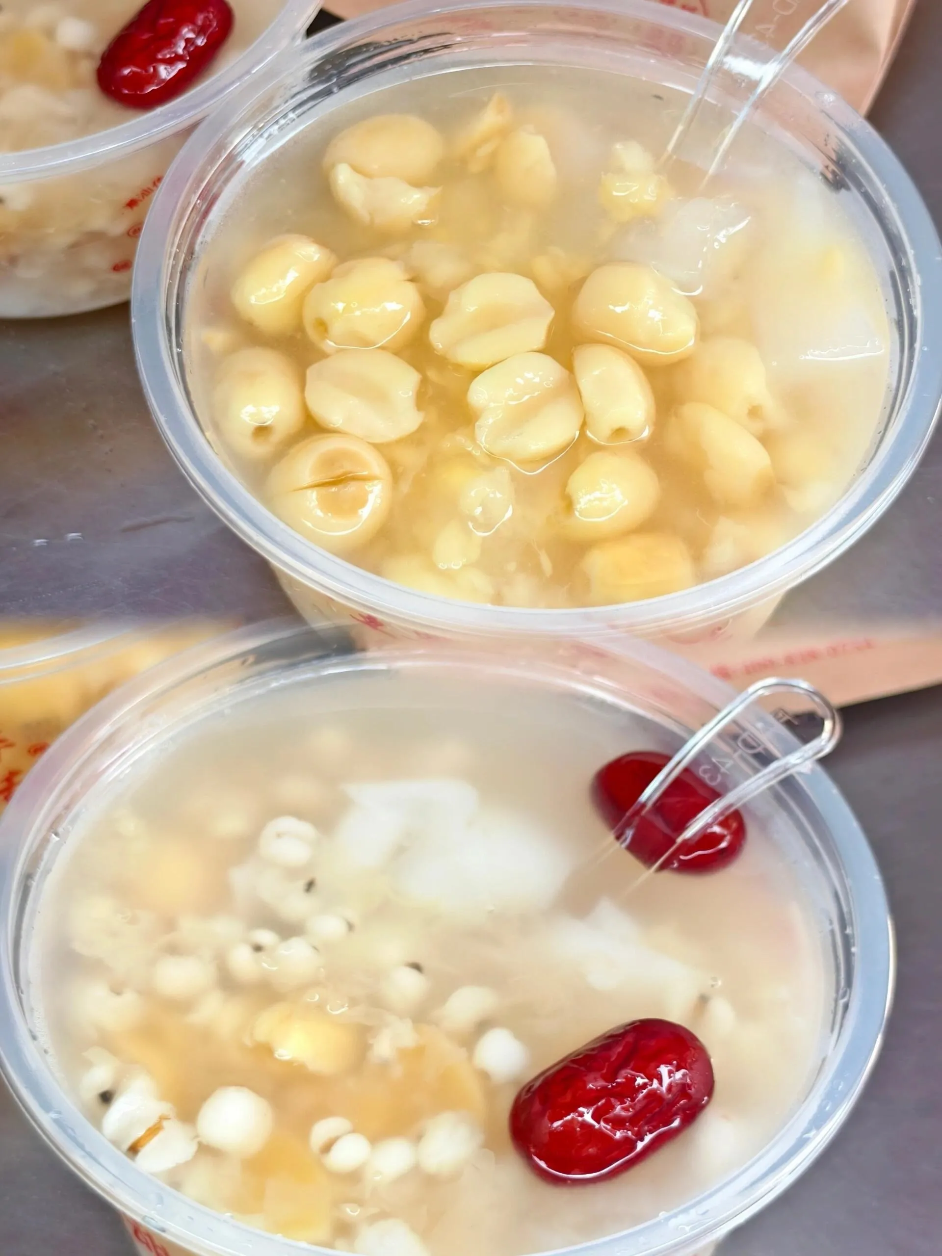 接下来来到龙眼南北路商圈。这里有许多网红美食店,如细姨甜汤和潮禧记的联名店。五果汤和绿豆爽都很清爽可口,店里的炸鸡翅更是美味。