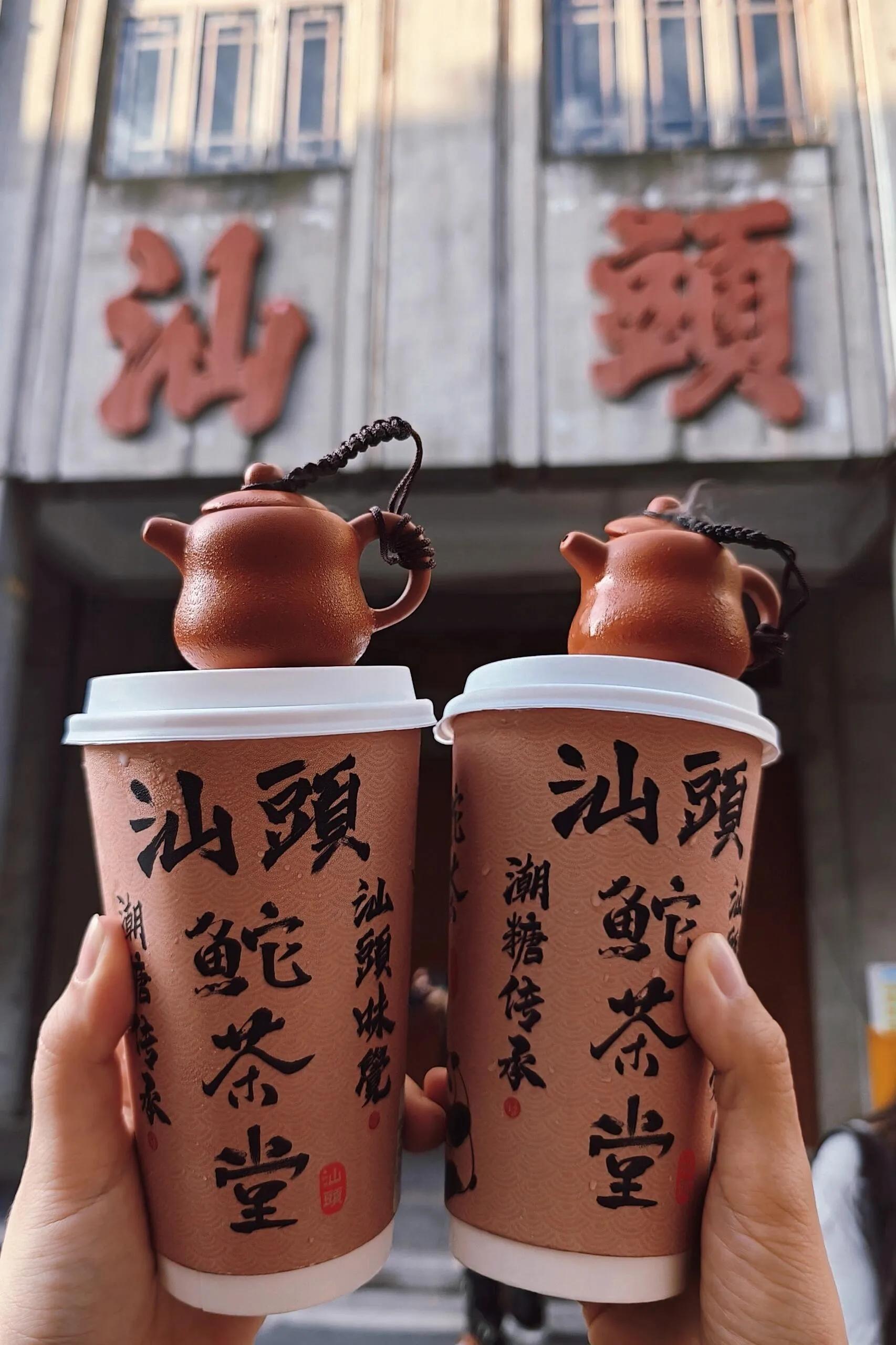 首先来到𬶍茶堂,这家茶饮店就在汕头旅社的斜对面。除了固定的茶壶饮品,其他饮品加8元就可以获得同款小茶壶,非常适合拍照。