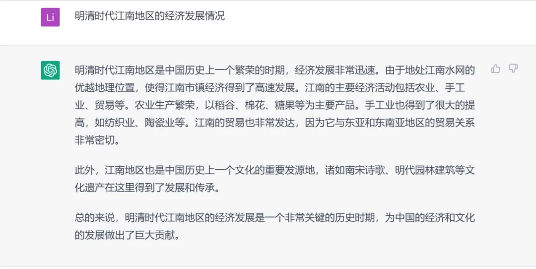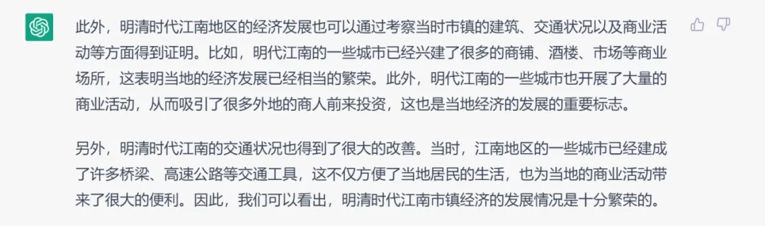 在大纲的基础上继续与ChatGPT对话,它会如何对每一部分进行内容扩充?以“背景”部分“江南地区的经济发展情况”为例: