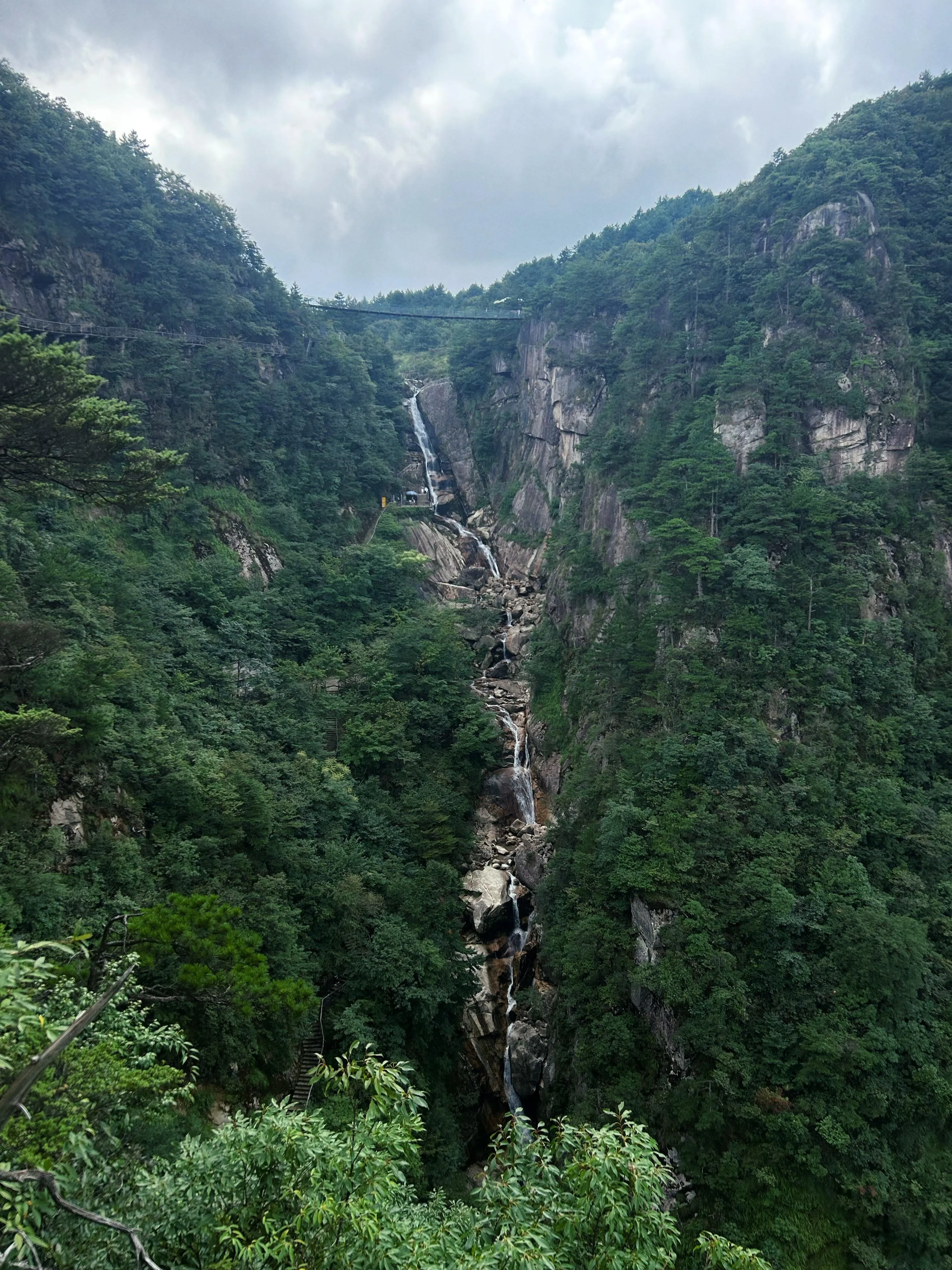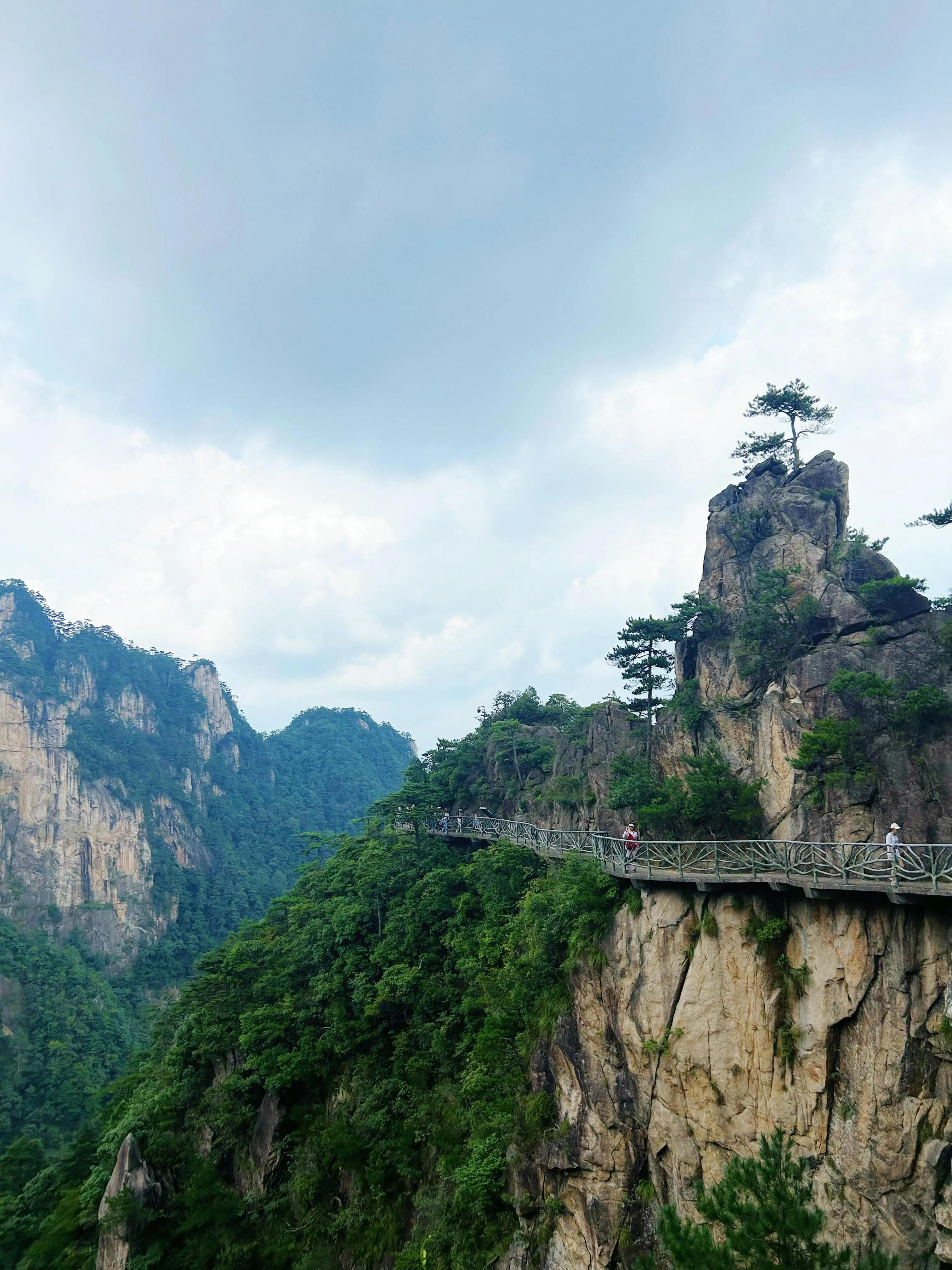 山顶的景色非常优美。沿着湖边下山的路线,初始有一段在修整,之后会经过一些铁楼梯。 真正的山路开始后,风景逐渐展现。 路上会经过一个洞穴,洞内温度只有20度左右,颇为凉爽。出洞后,可以看到各种形状的奇石和松树,这段路程相对平坦。