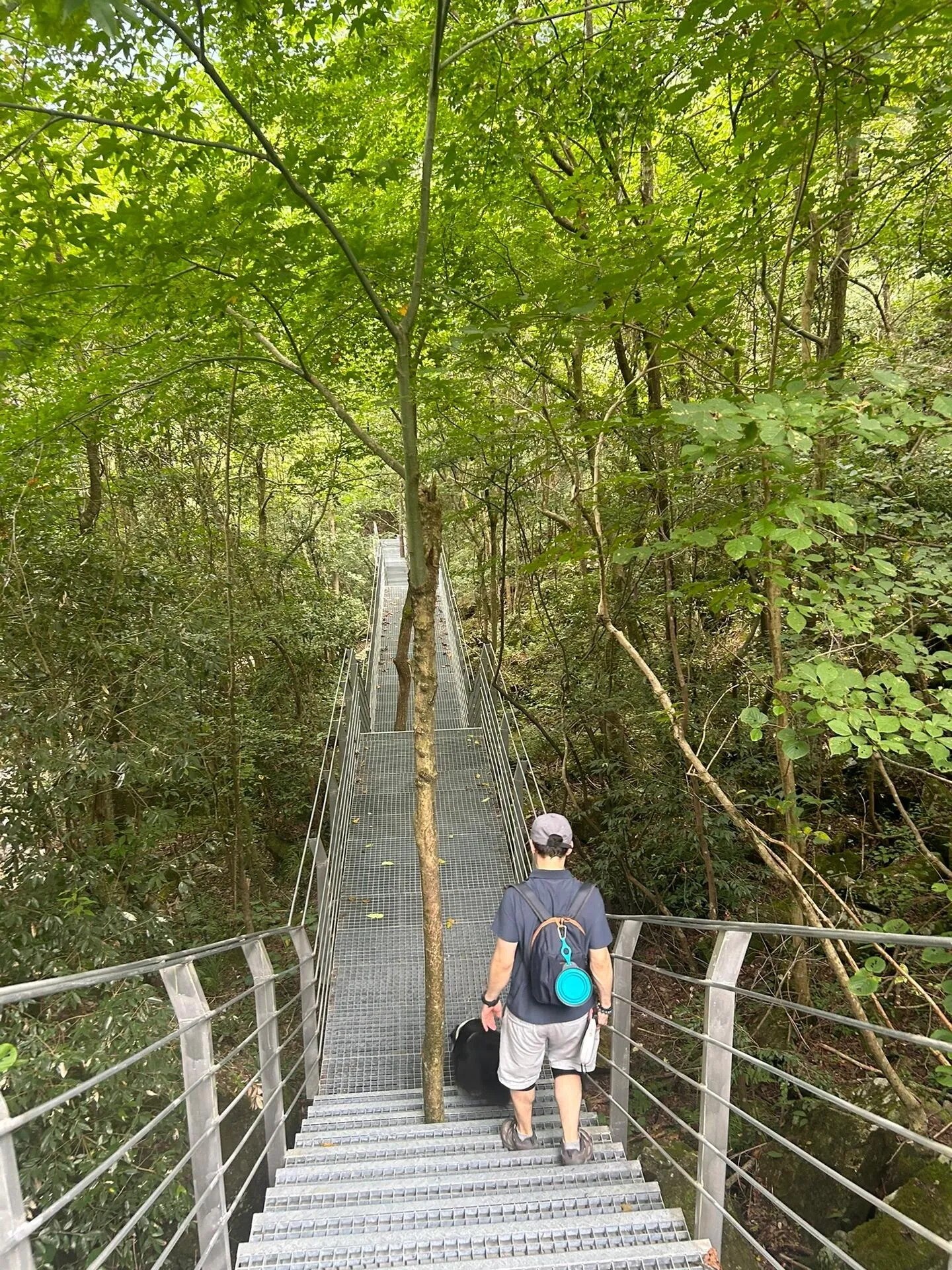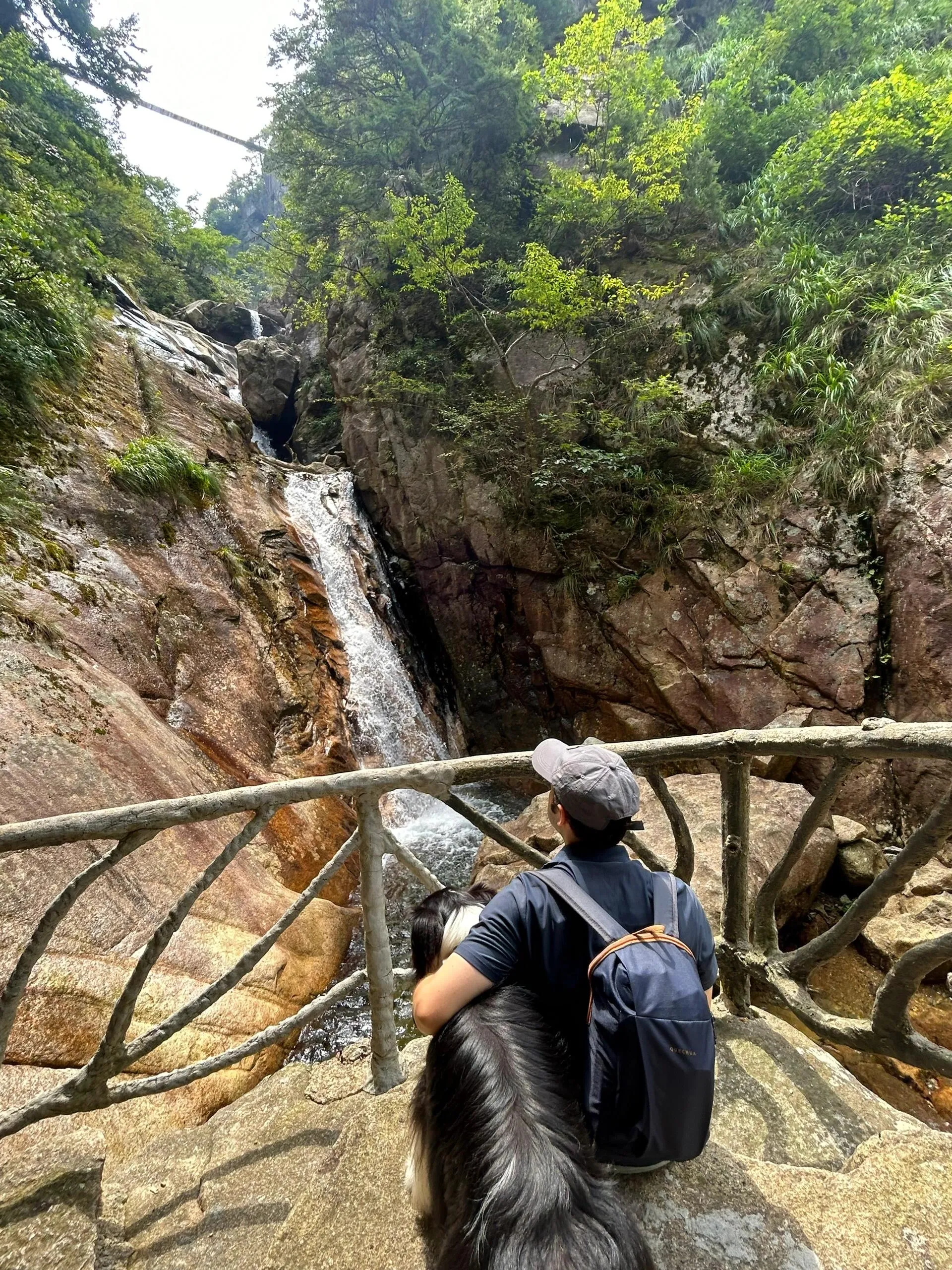 到达瀑布区域就要开始下山了。 下山路程约需两小时,对于小型犬来说可能会有些吃力,因为楼梯较多。后半段有铁质路面,建议给狗狗穿上鞋子以防止不适。山下有溪流可以玩水,但如果还需要乘坐景区巴士,可能需要考虑是否让狗狗下水。