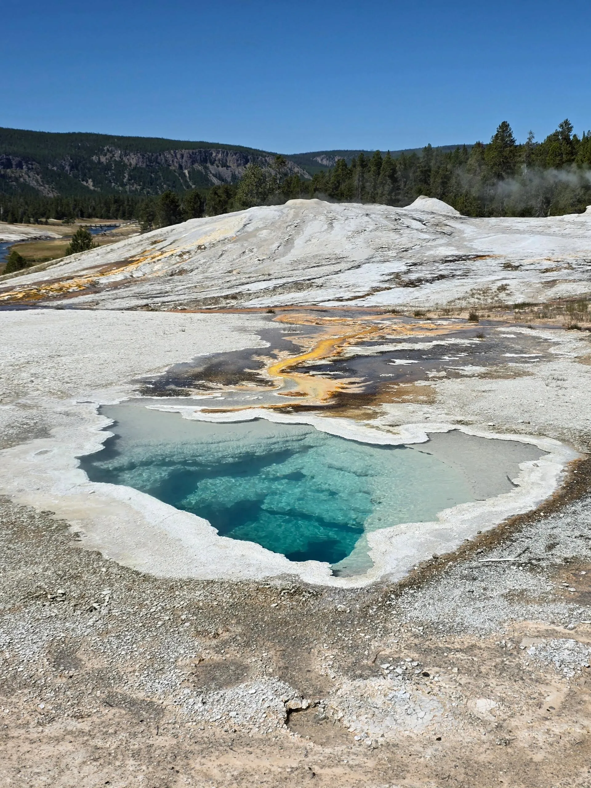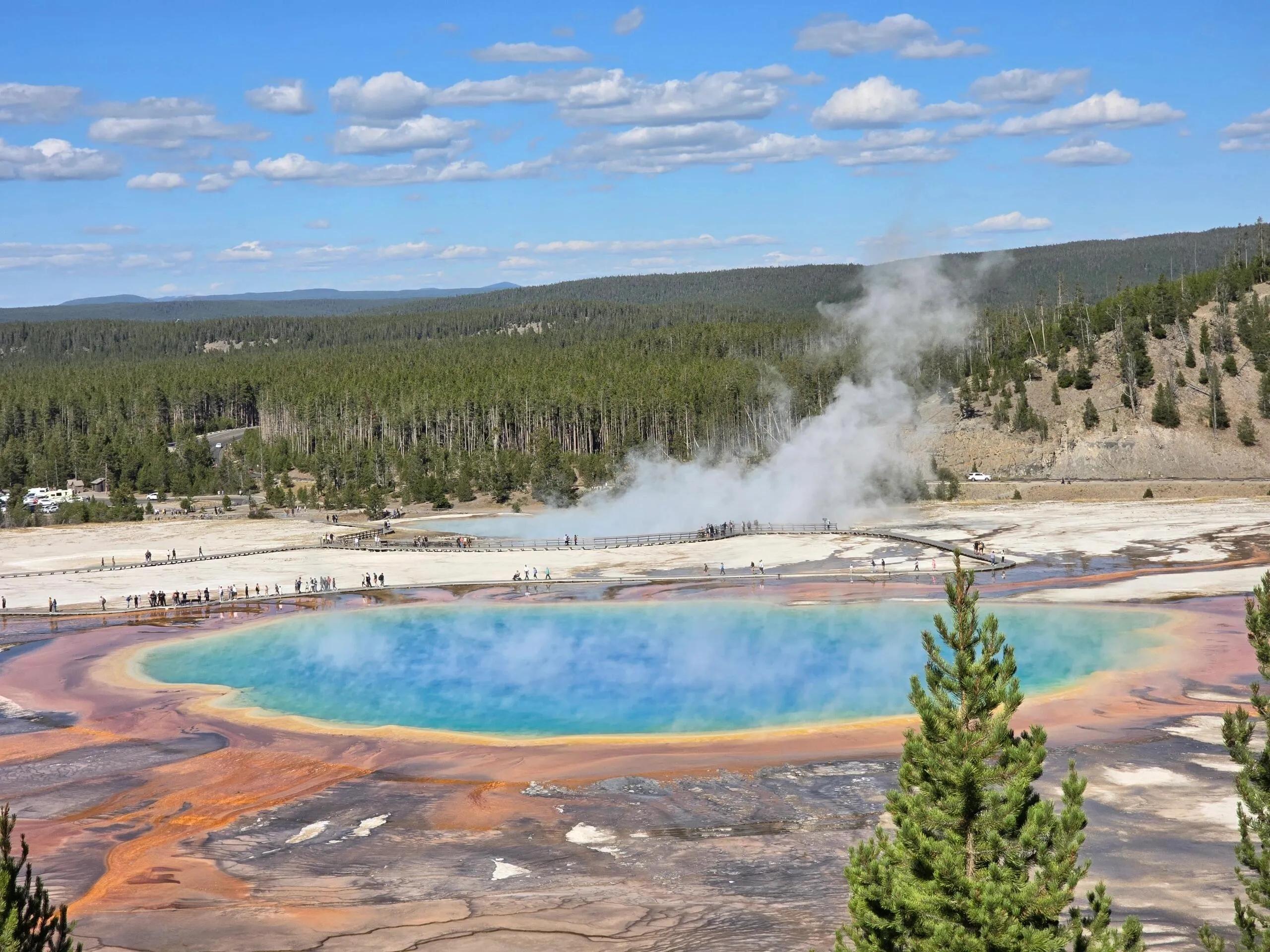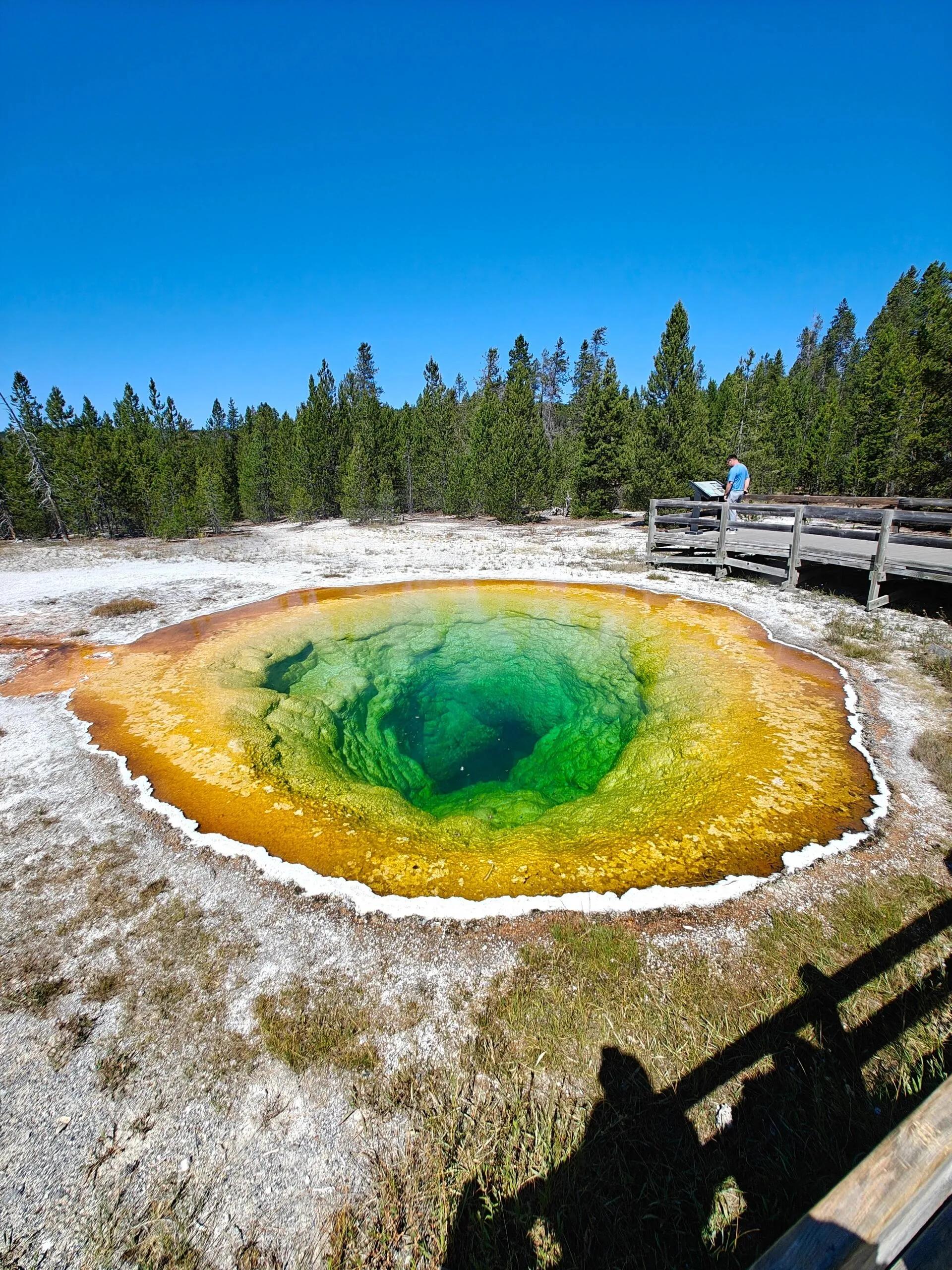 接下来 前往牵牛花池 ,沿途还能欣赏到众多间歇泉和温泉。往返步行大约40分钟,景色优美。 午餐在老忠实客栈解决后,前往大棱镜 。建议先在Fairy Fall停车场停车,然后走一小段trail到达观景台,可以俯瞰大棱镜全景,景色壮观。之后还可以到近距离的大棱镜栈道参观,虽然当天有雾,无法看到全貌,但仍然令人印象深刻。