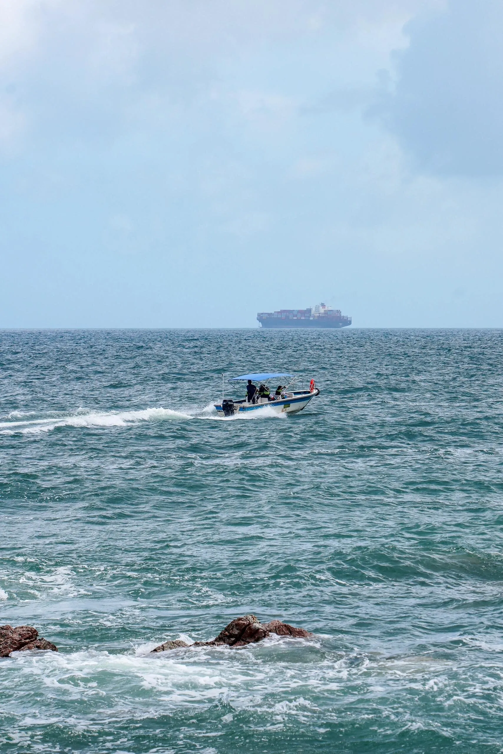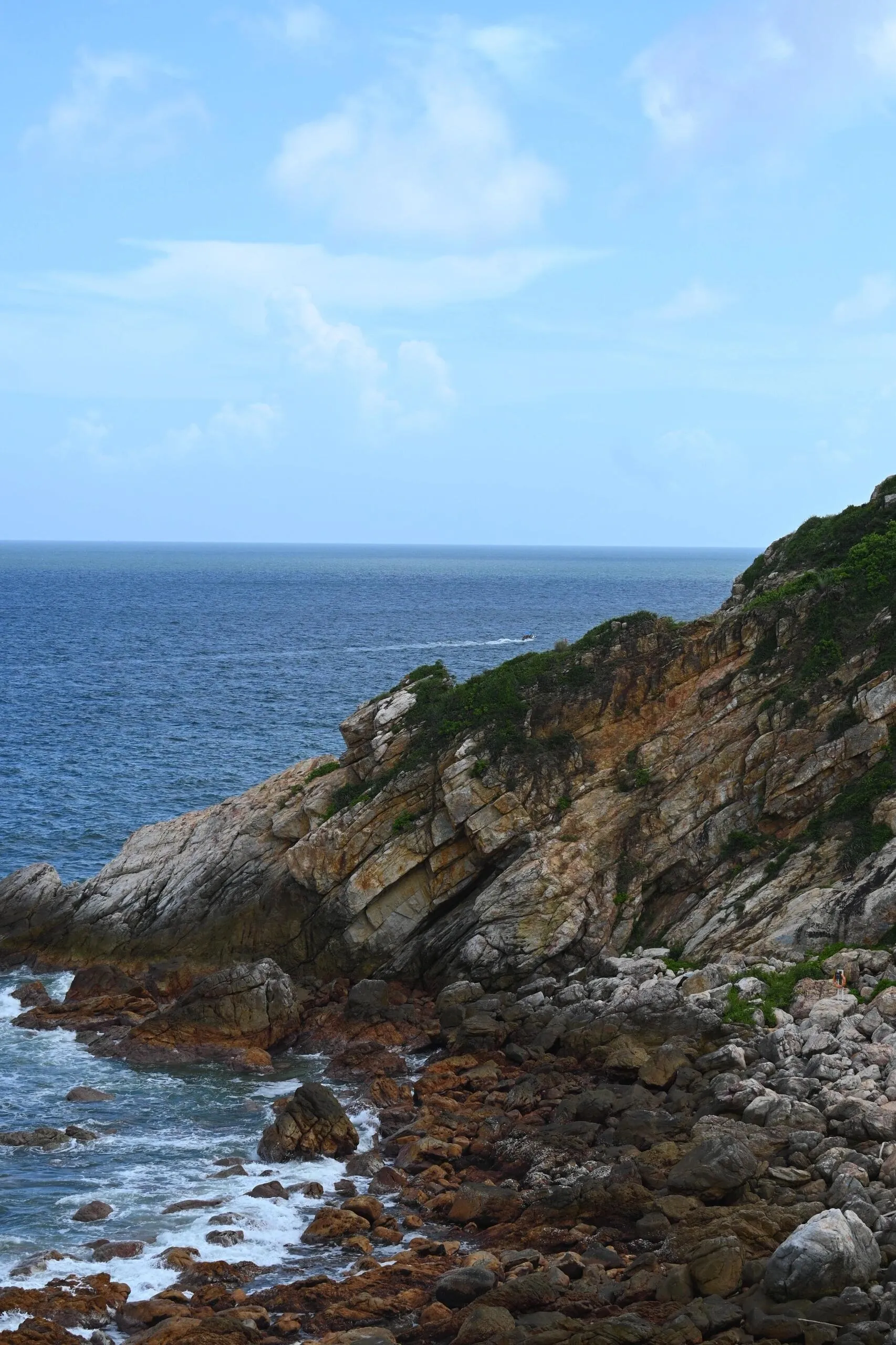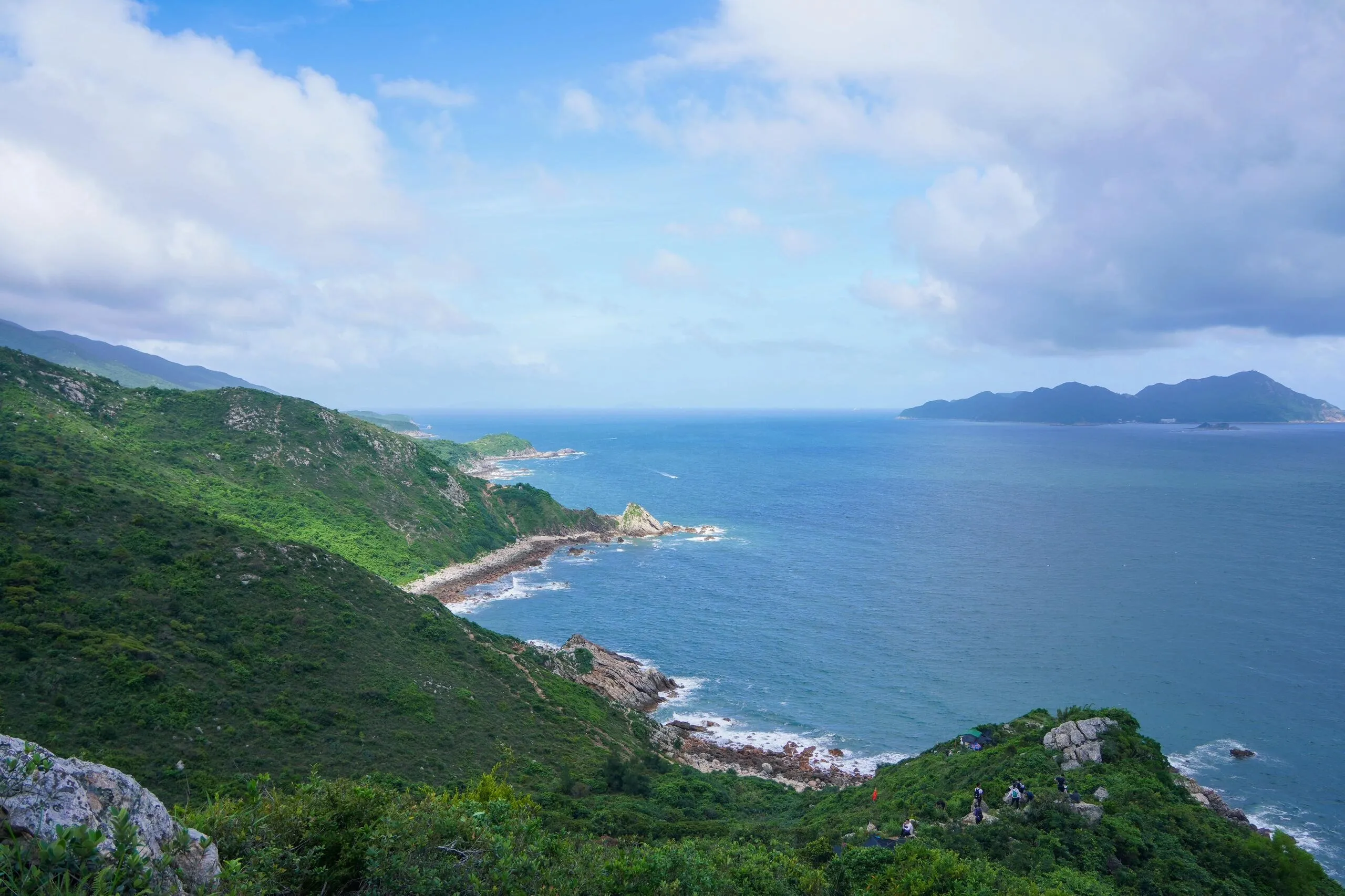 具体路线是从东涌社区工作站出发,先走一段水泥路才能到达海岸线,然后沿着海岸线的礁石一直走,期间需要翻过5座山。在最后一座山的山顶,可以选择坐接驳车下山,也可以继续徒步下山,大约还需20分钟左右才能到达终点。