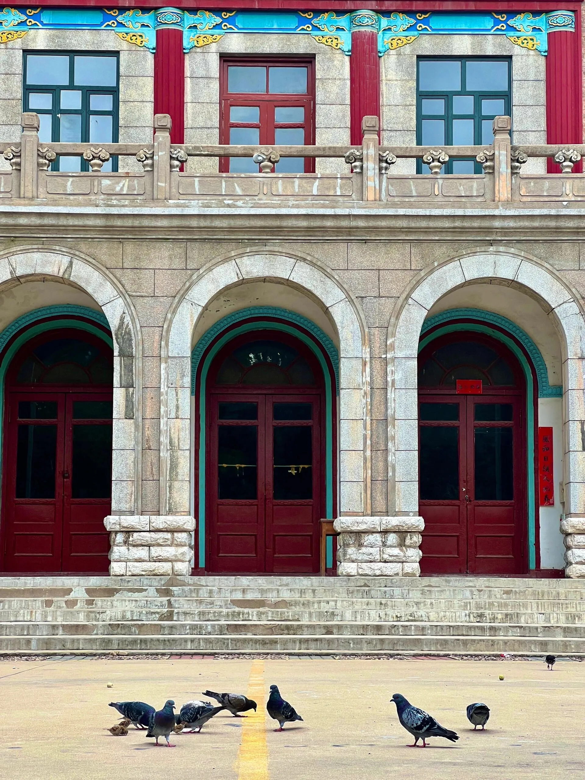 礼堂前的广场上,成群的鸽子依旧在此栖息 。游客可以带些碎馒头或面包来喂食鸽子,还能与它们合影留念,画面温馨有趣。