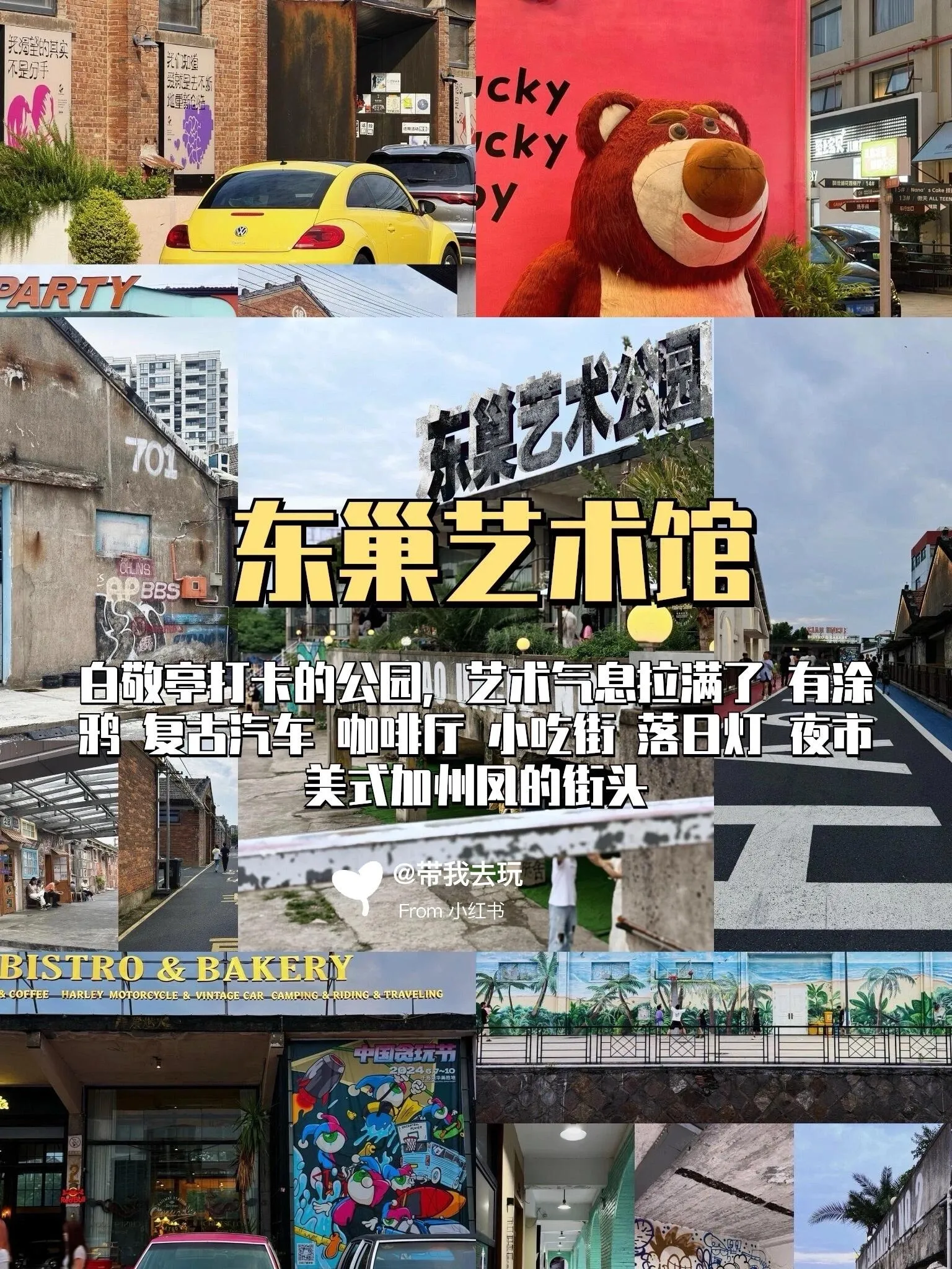 东巢艺术公园是一个充满艺术气息的地方。这里有涂鸦墙、复古汽车、咖啡厅、小吃街等,充满了美式加州风。傍晚时分,还有免费试吃的落日夜市,非常热闹。