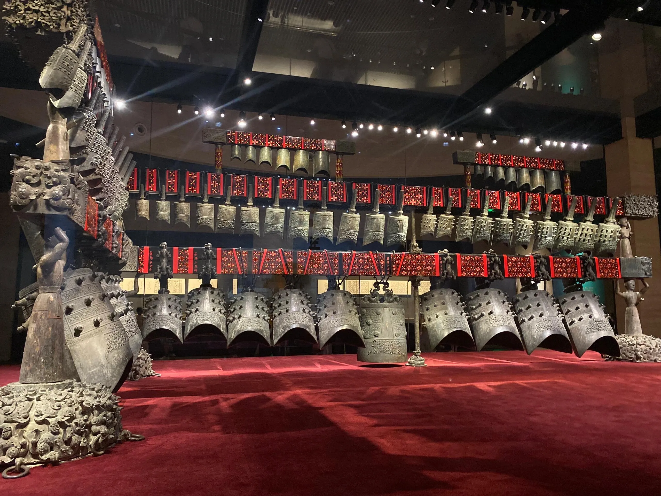 湖北省博物馆成立于1953年,馆藏丰富,拥有24万余件藏品。 其中十大“镇馆之宝”包括郧县人头骨化石、石家河玉人像、崇阳铜鼓、越王勾践剑、曾侯乙编钟、曾侯乙尊盘、虎座鸟架鼓、彩绘人物车马出行图、云梦睡虎地秦简和元青花四爱图梅瓶。虽然有些藏品因外出展览而未能展出,但整体参观体验仍然非常震撼。