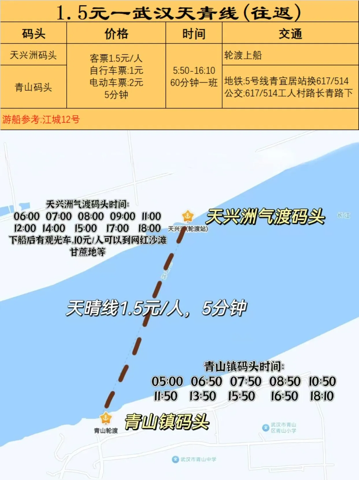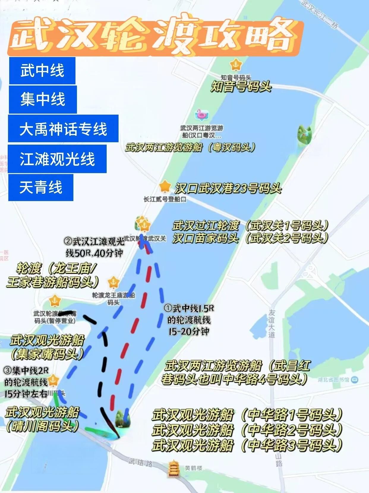无论是想要欣赏武汉的江景,还是体验当地的水上交通,这些轮渡线路都是不错的选择。特别是在傍晚时分,乘坐轮渡欣赏日落,既经济实惠又能领略武汉独特的江城魅力。