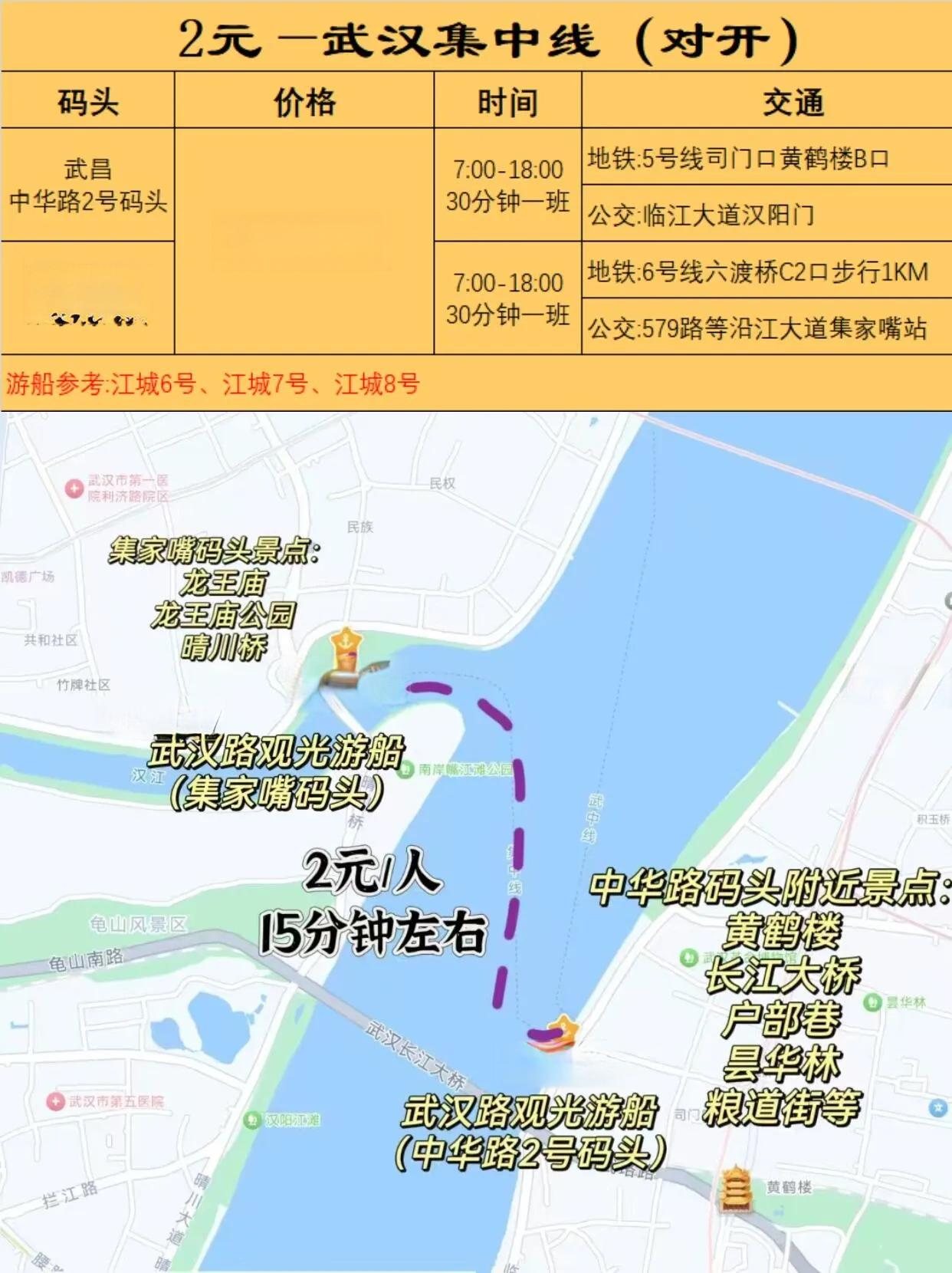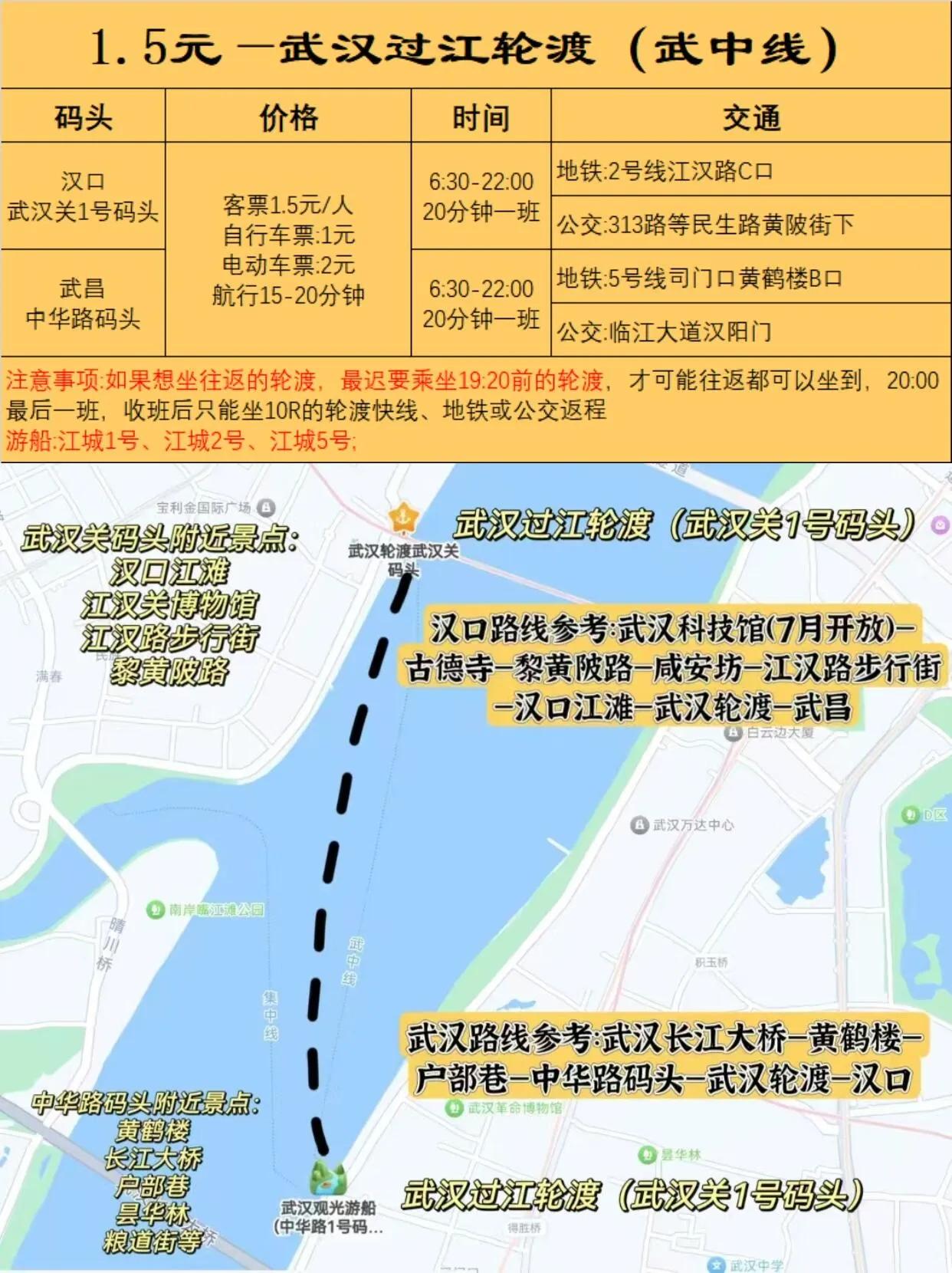 武汉的傍晚天气开始转凉,这意味着1.5元的日落轮渡又可以重新体验了! 武汉轮渡共有5条线路 ,其中【武中线】连接了江汉关和黄鹤楼,是一条非常值得推荐的路线。不过需要注意的是,在淡季时人流较少,体验会更好,而旺 在淡季时人流较少,体验会更好 体体验。