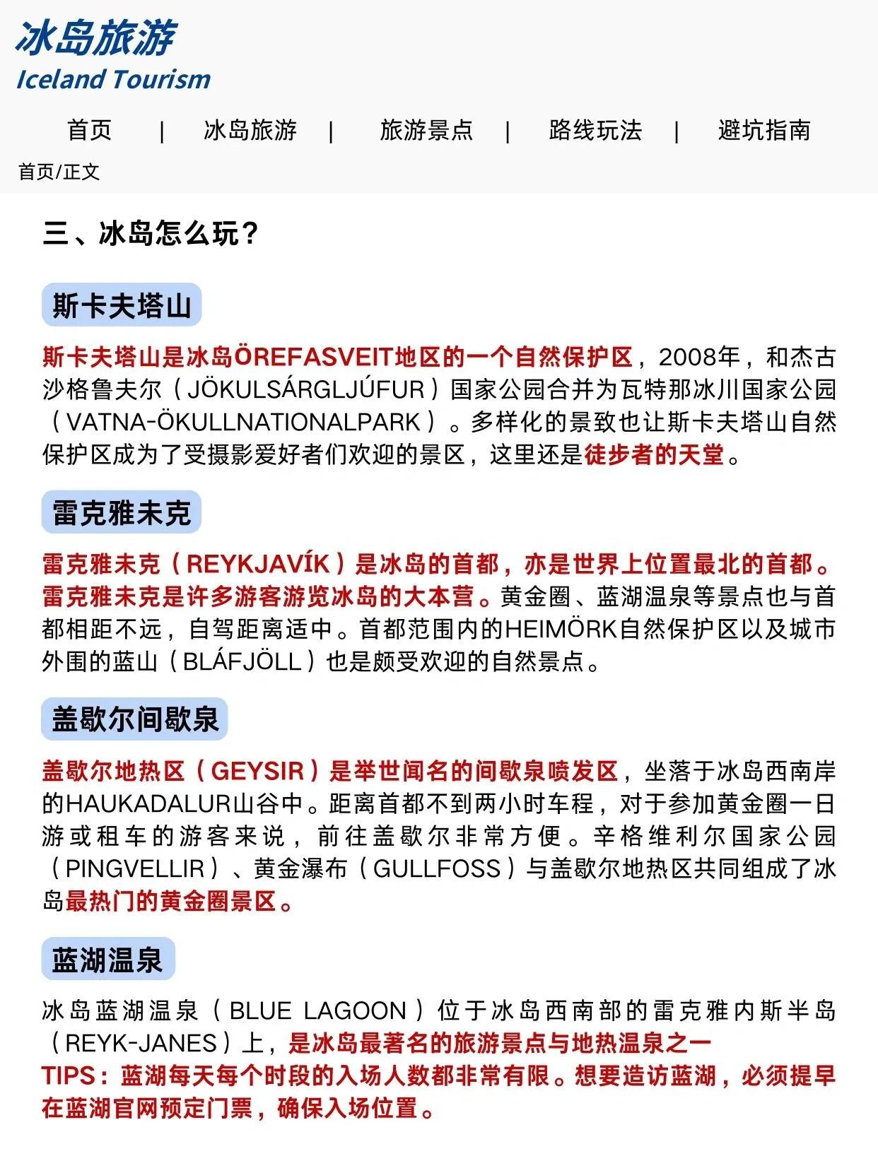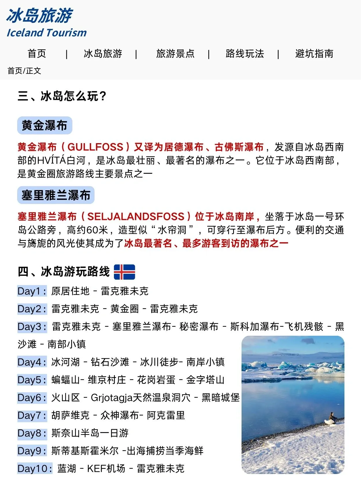 对于首次到访的旅行者,可以考虑参加冰岛全景10日游,行程如下: