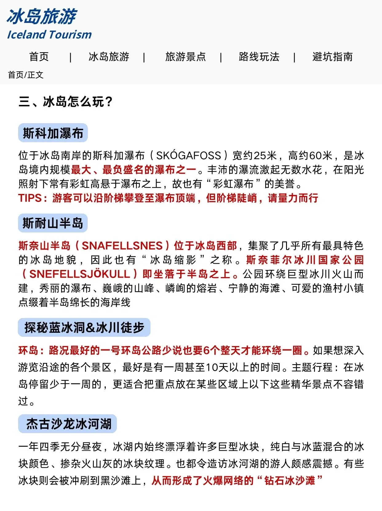 冰岛是许多人梦寐以求的旅行目的地,这个神奇的国度不仅有绚丽的极光,还有火山、冰川、温泉等独特的自然风光。以下是冰岛的主要景点推荐和行程建议,希望能为计划前往冰岛的旅行者提供参考。