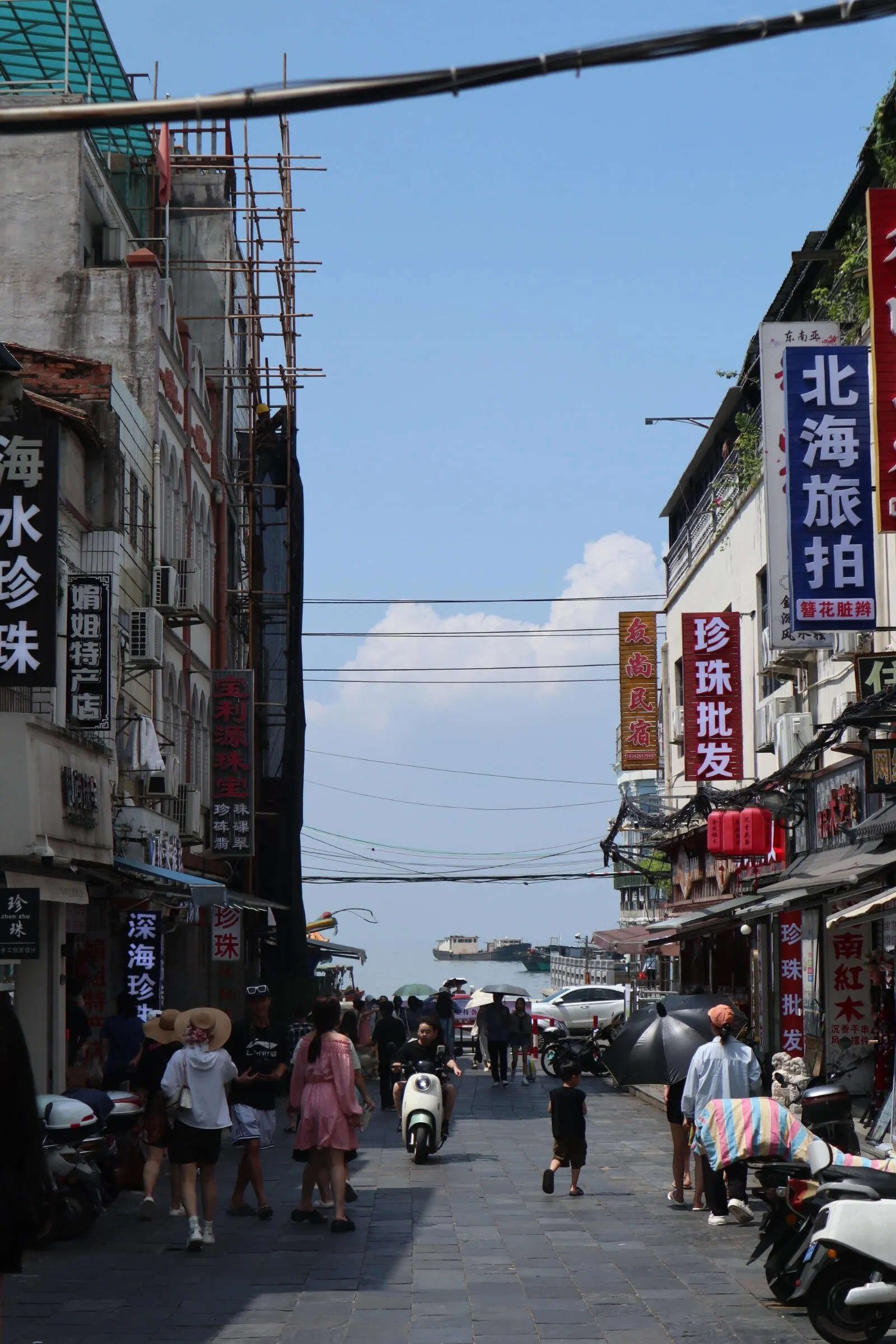 接下来的行程包括北海老街、海上观光栈道和冠头岭。北海老街有一条通往大海的路很有特色,值得一看。海上观光栈道位于北部湾附近,是一条适合骑行的美丽路线。下午三点多骑车前往冠头岭,距离较远,骑行时间约半小时。冠头岭每天只有200个预约名额,未预约进入需要支付10元电动车费用。这里的日落景色非常美丽。