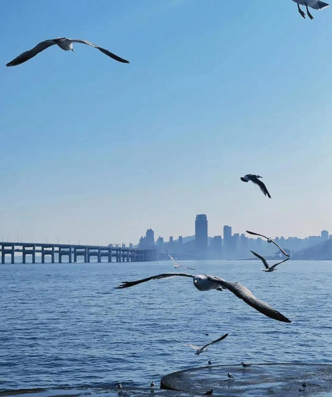 星海广场是欣赏海景的绝佳地点。这里可以看到著名的星海跨海大桥,桥上车流不息,与波光粼粼的海面形成鲜明对比。热闹与宁静并存,上空还有海鸥盘旋,景色十分优美。