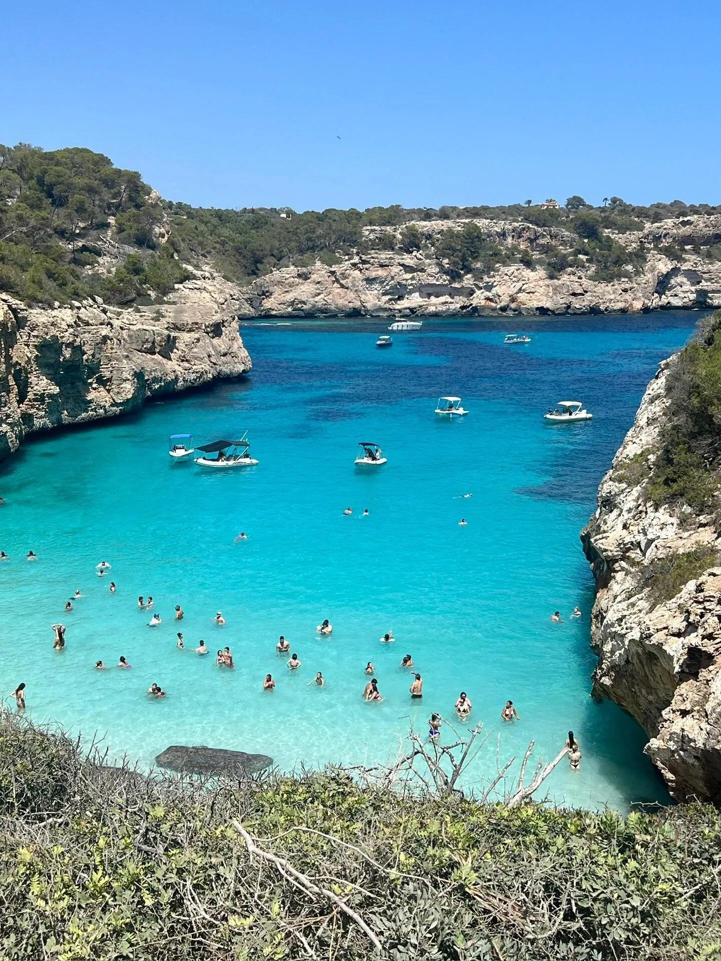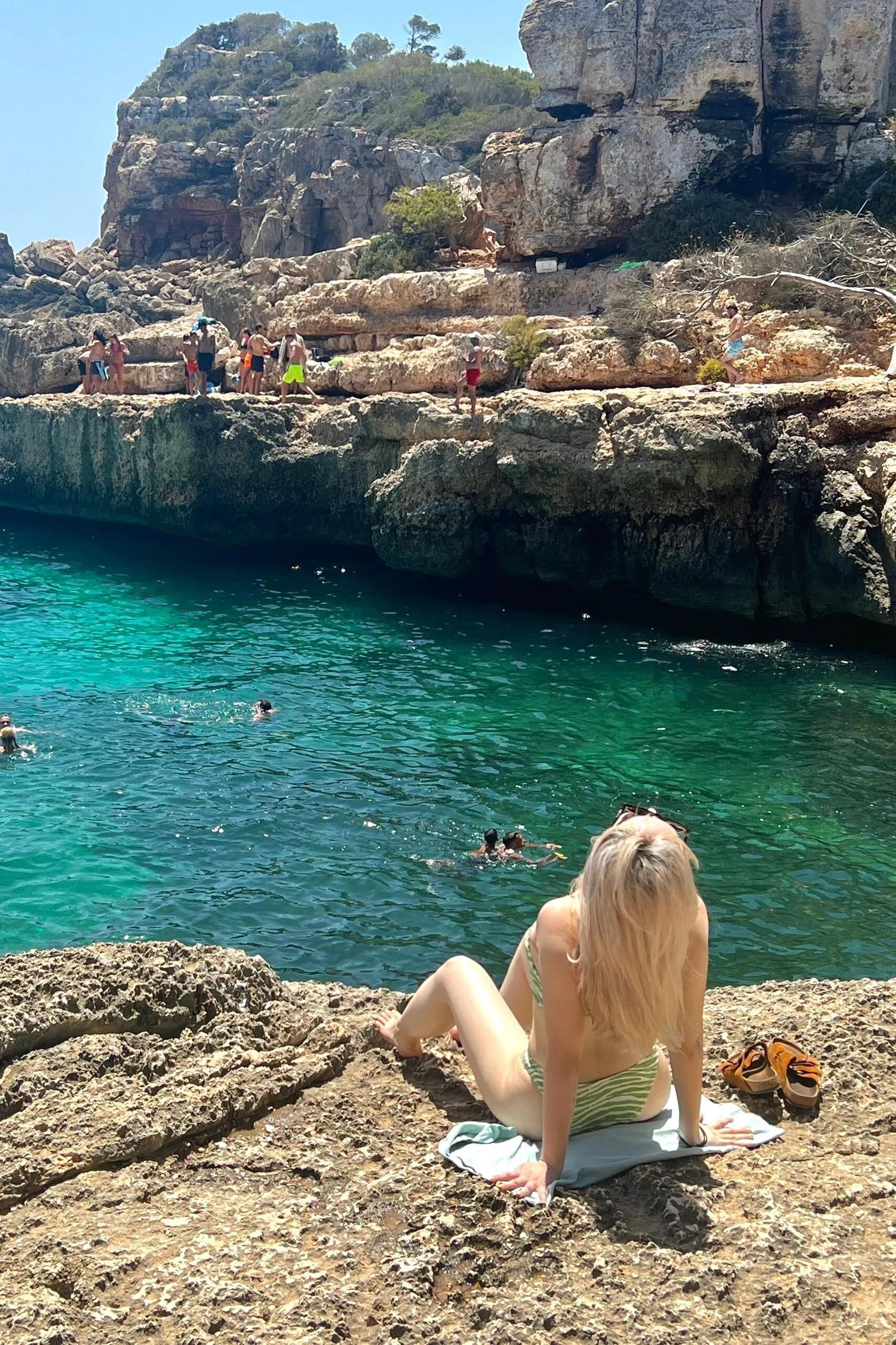 旅行开始时,我们去了最网红的S'Almonia和Cala del Moro。果冻海确实美得像果冻,但沙滩位于悬崖下,爬起来相当困难。不得不佩服小红书里穿着仙女裙拍照的美女们。如果喜欢轻松躺平,我更推荐岛东侧的果冻海,比如Cala Agulla,那里还可以租到舒适的沙滩椅。
