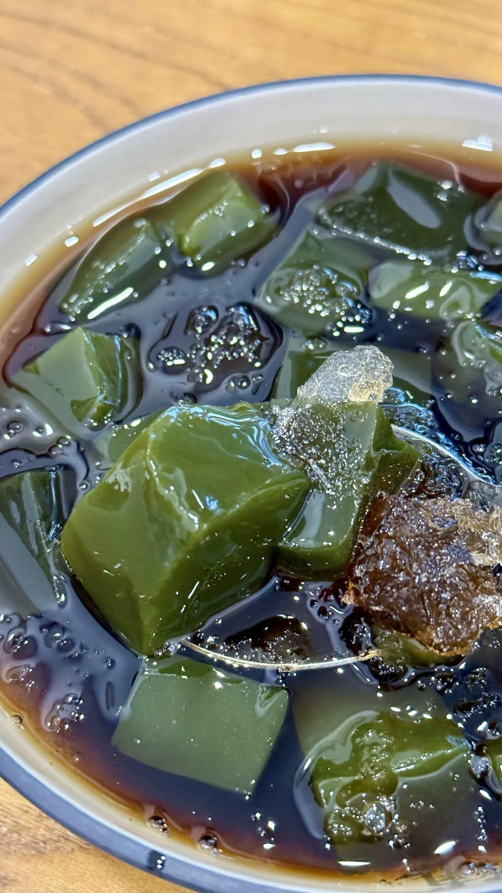 推荐仙人豆腐(5元),是绿仙草冻配冰渣红糖水,清凉消暑。红糖水香甜,让人忍不住喝光碗底。冰渣凉粉(4元)也不错,红糖汤底很香。椰奶清补凉(10元)刚开业时味道堪比陈记,但最近去吃发现小料种类变少了,椰奶味也变淡了,暂不推荐。高峰期可能没座位,生意太好了。