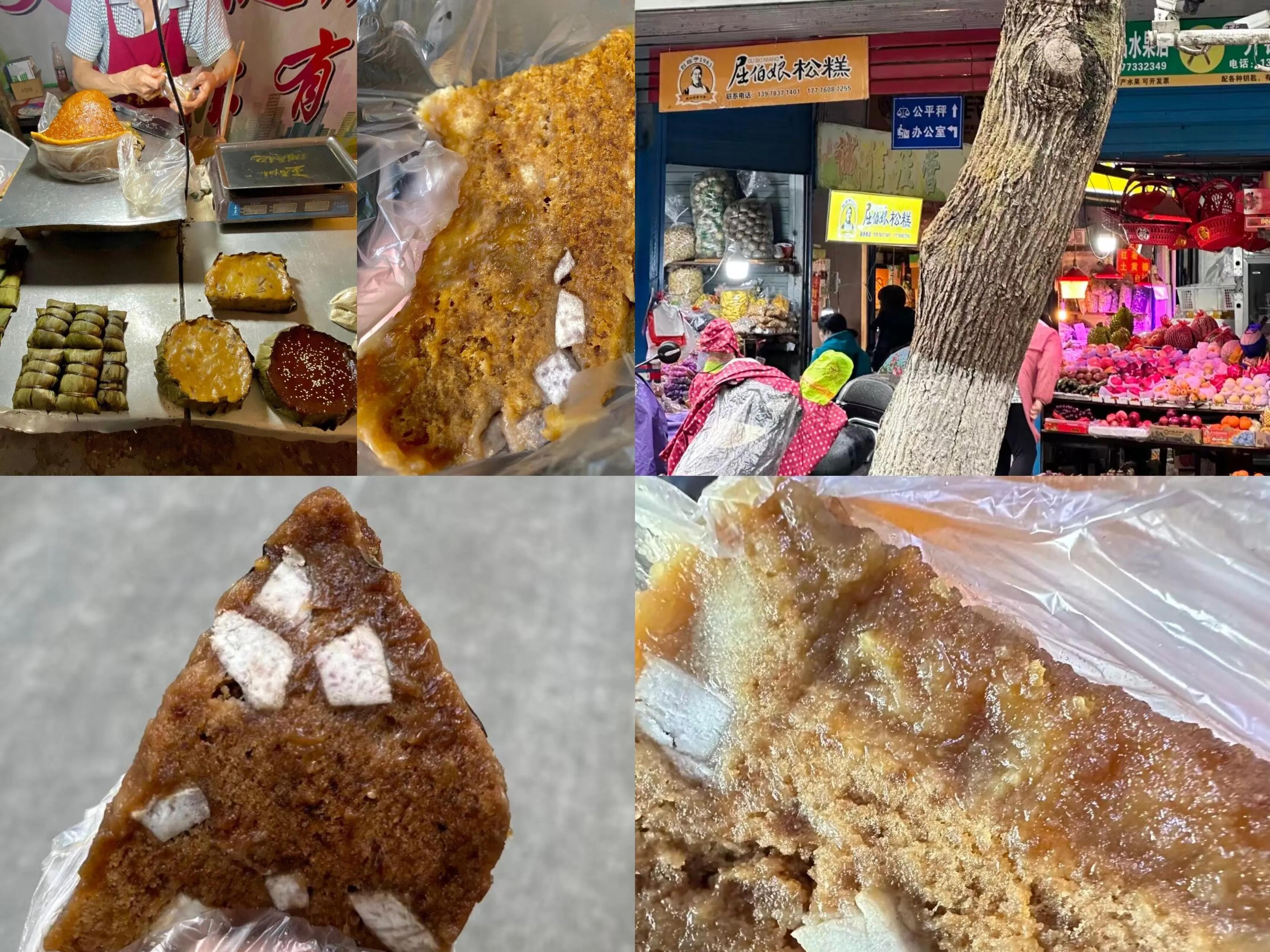 这是桂林的特色代表,本地人常把松糕当作蛋糕或年货。必吃的是红糖松糕(10元/斤),糯叽叽的口感让人欲罢不能。跟老板娘说要3块钱的,称好再付款。甜味适中,夹层是粉糯的荔浦芋头,外层的红糖霜更是绝妙。生意火爆,下午可能就卖完了,建议趁热吃,不宜过夜。咸松糕需要提前电话预定,整个起卖。此外还有年糕、粽子等售卖。提醒大家适量食用,糯米吃多了容易肚子疼。