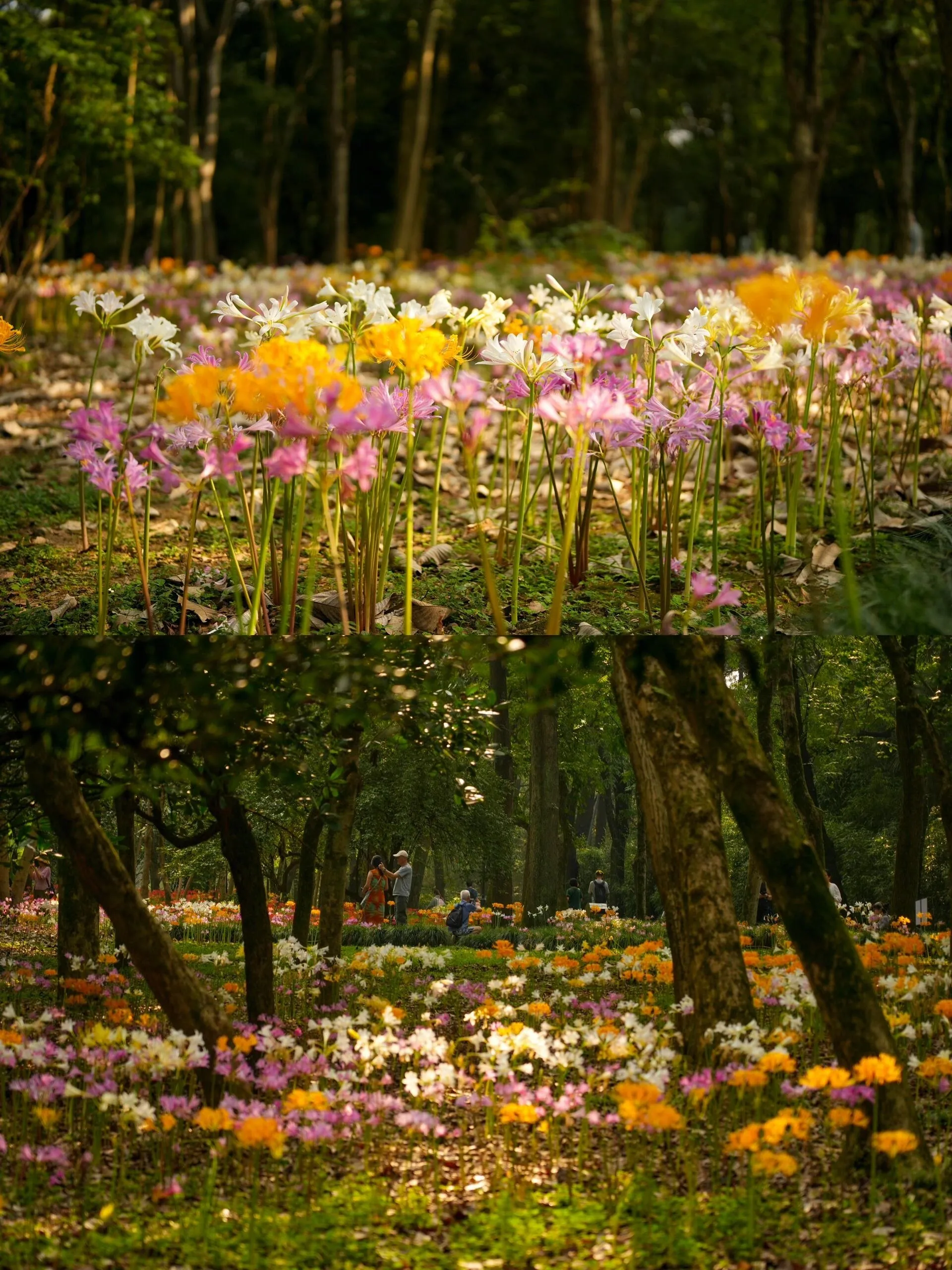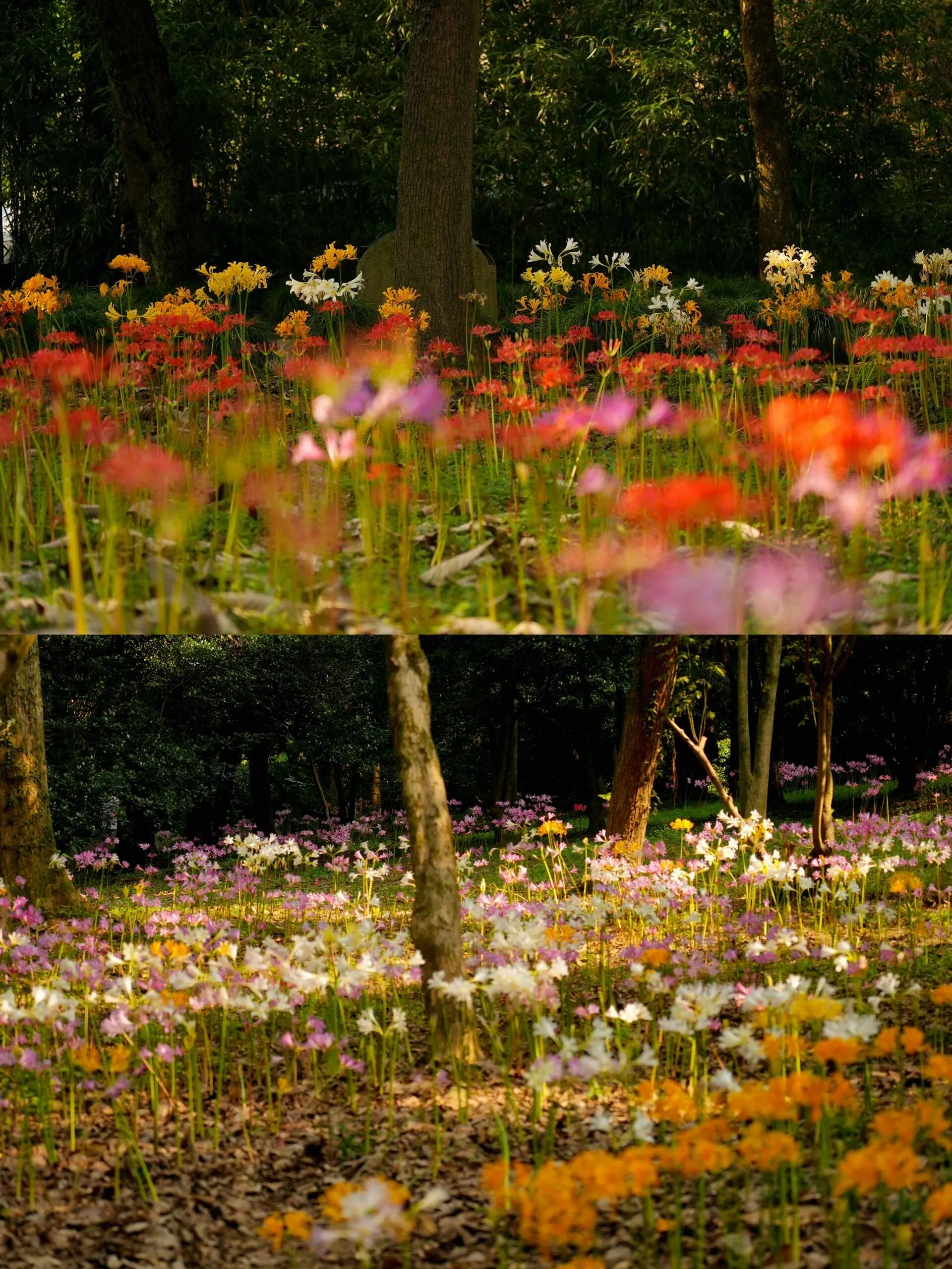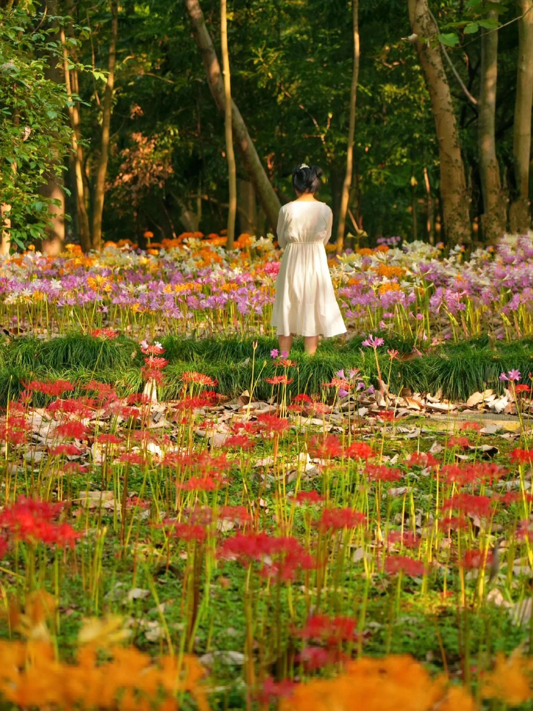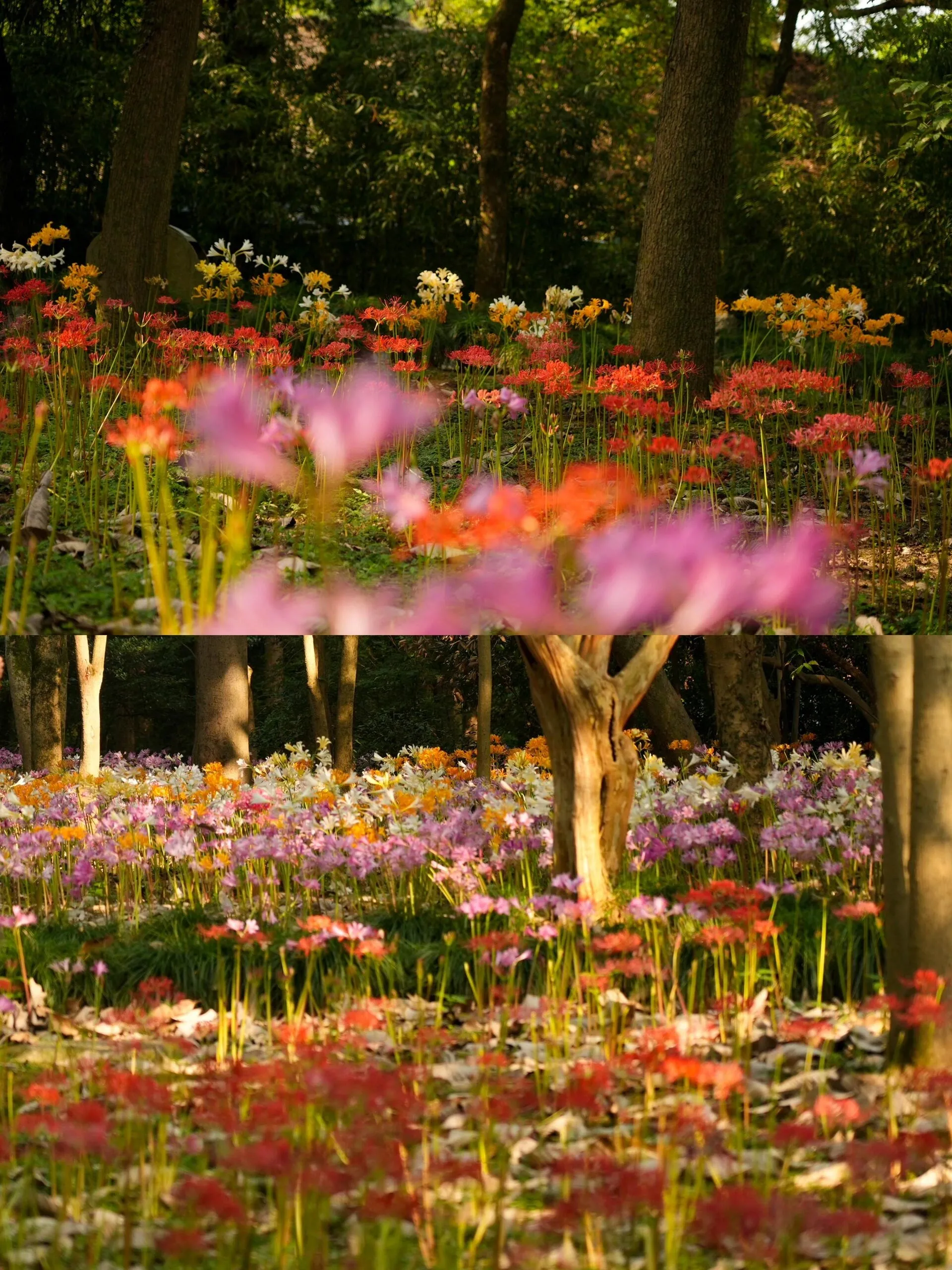 在夏末初秋之际, 杭州植物园的大片石蒜花悄然盛放 ,顶流回归,彼岸花正当时。 今年除了传统的红色,还有少见的黄、粉、白、紫色 ,清晨的阳光穿过绿荫,落在五彩斑斓的花朵上,宛如现实版莫奈花园。