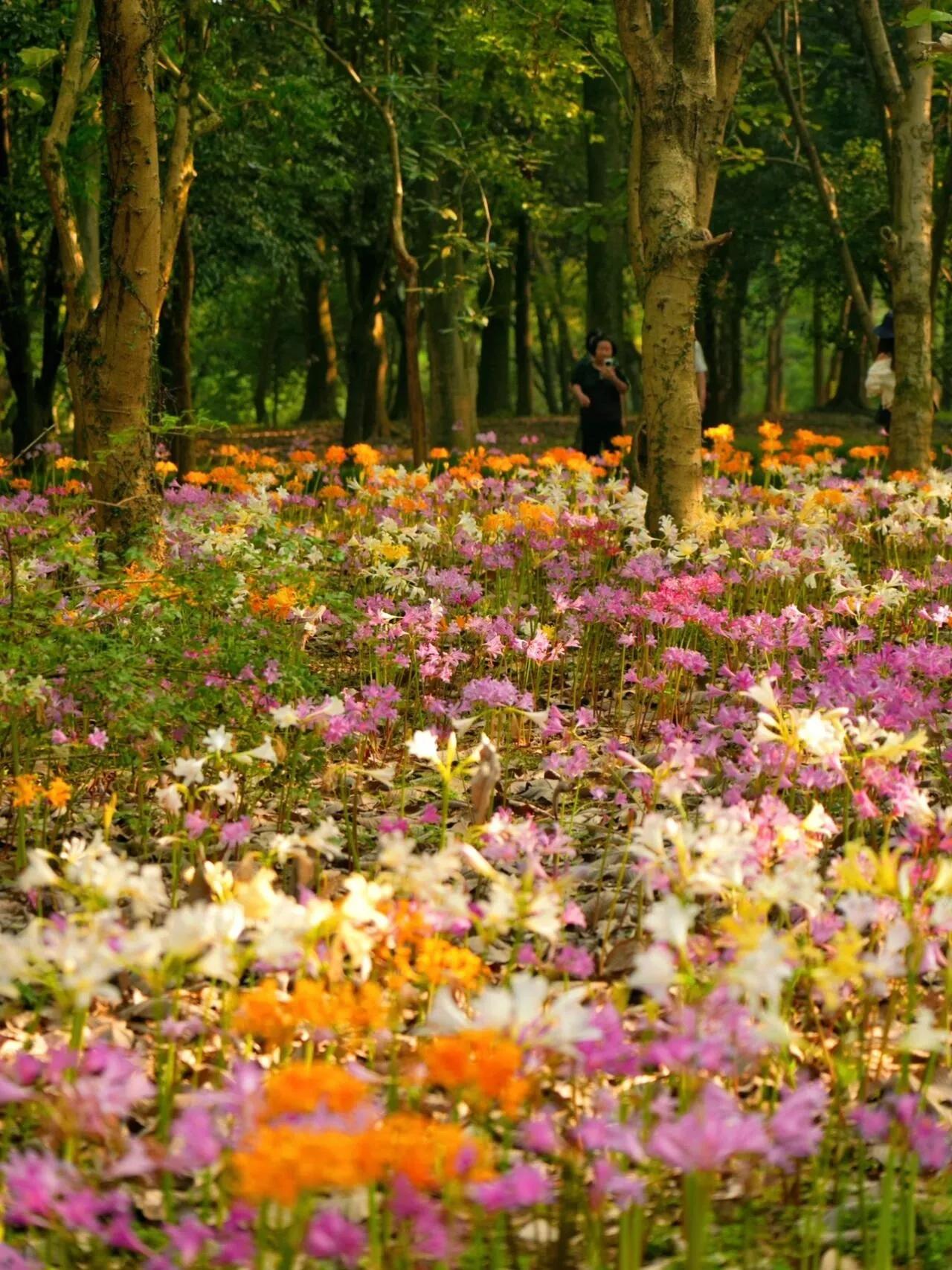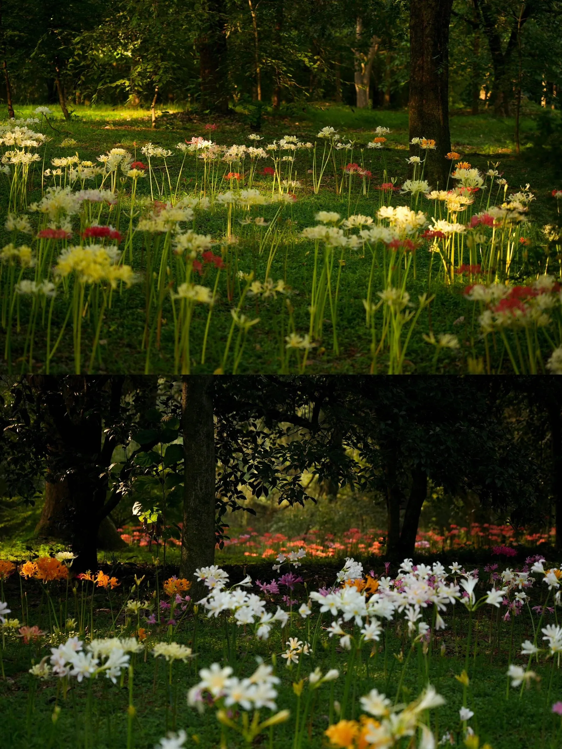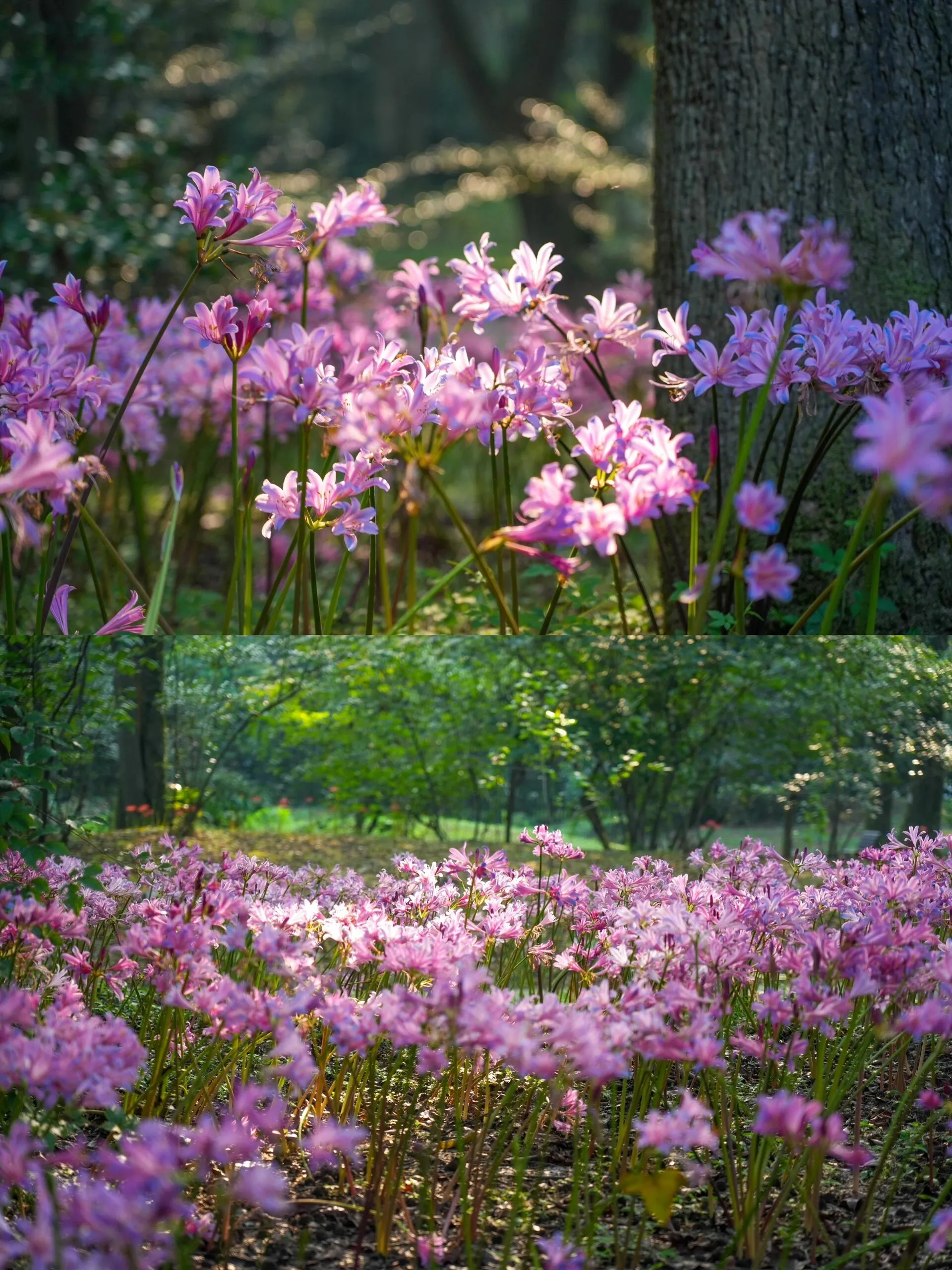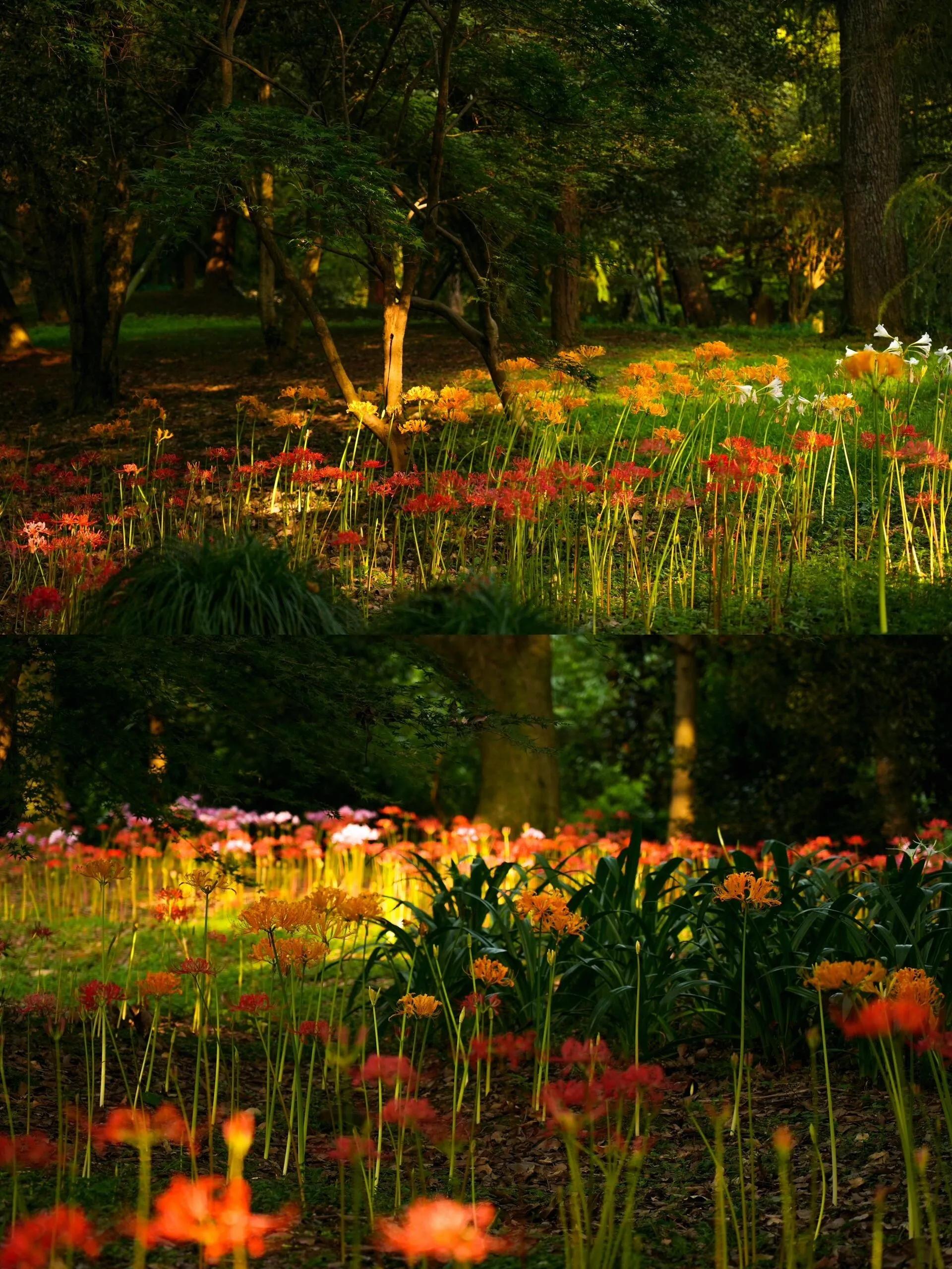 在夏末初秋之际, 杭州植物园的大片石蒜花悄然盛放 ,顶流回归,彼岸花正当时。 今年除了传统的红色,还有少见的黄、粉、白、紫色 ,清晨的阳光穿过绿荫,落在五彩斑斓的花朵上,宛如现实版莫奈花园。