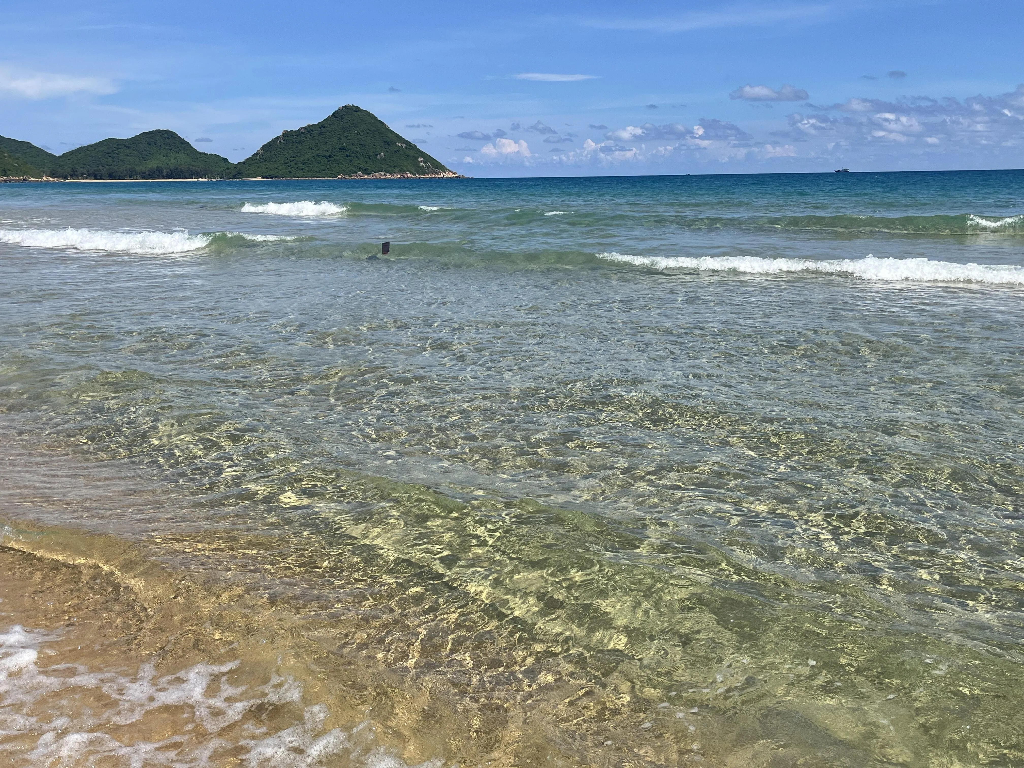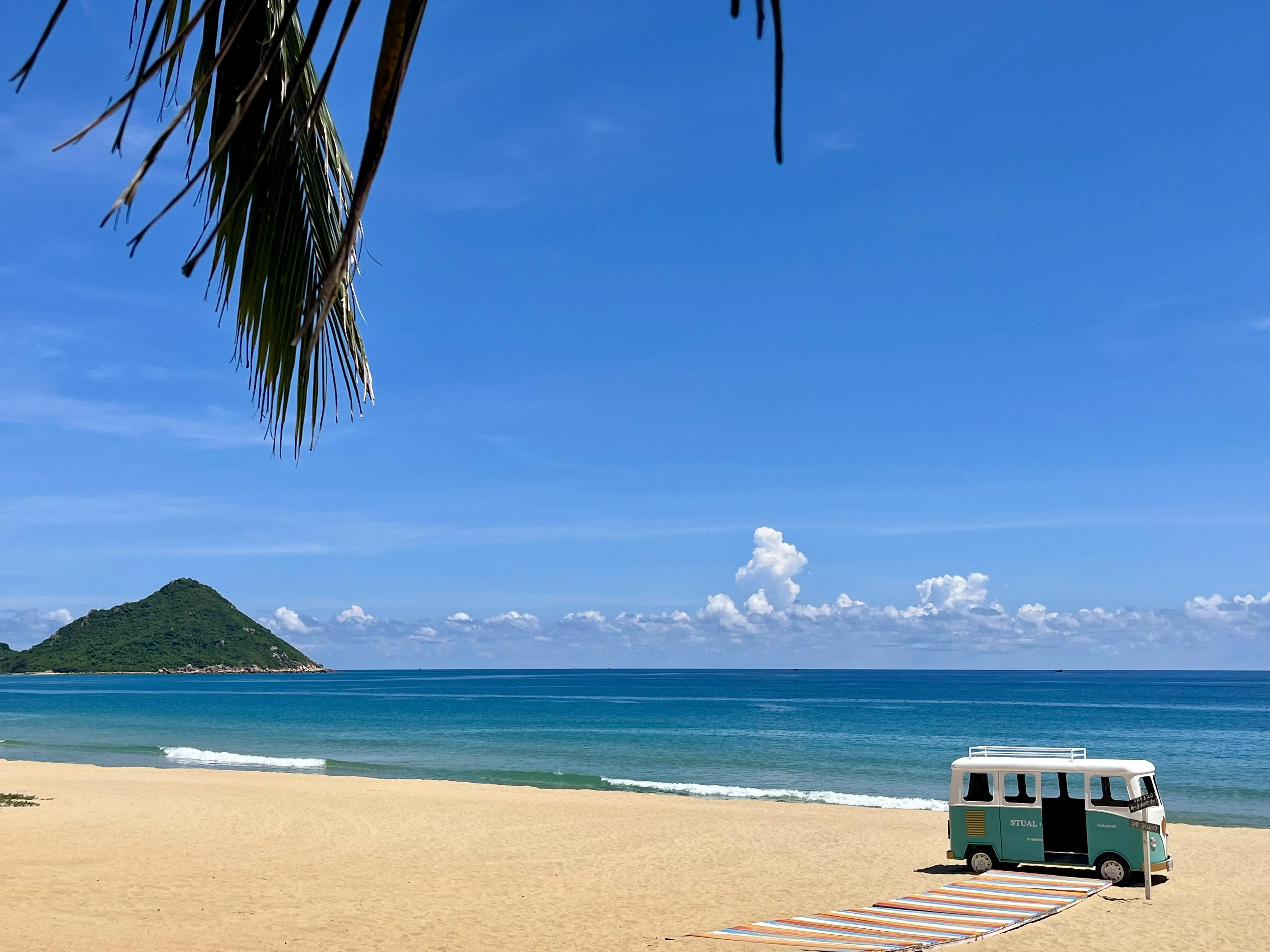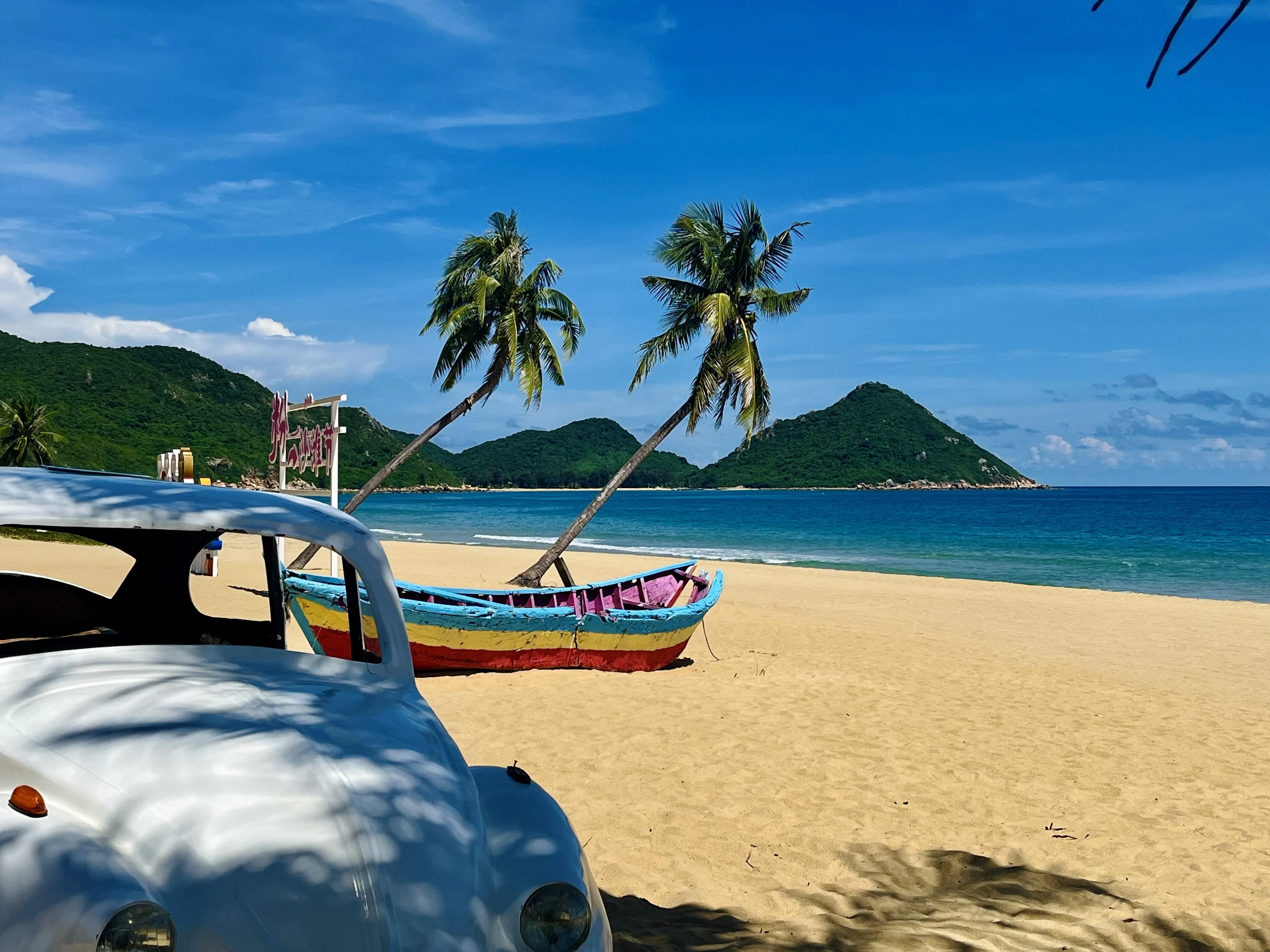 接着乘船再次登上猴岛,然后换乘观光车前往呆呆岛。这段山海之路的景色令人叹为观止,大约15-16分钟的车程让人心满意足。呆呆岛人少景美,海水清澈,是东线前五个城市中海景最美的地方之一。岛上还有几辆小车,很适合拍照留念。