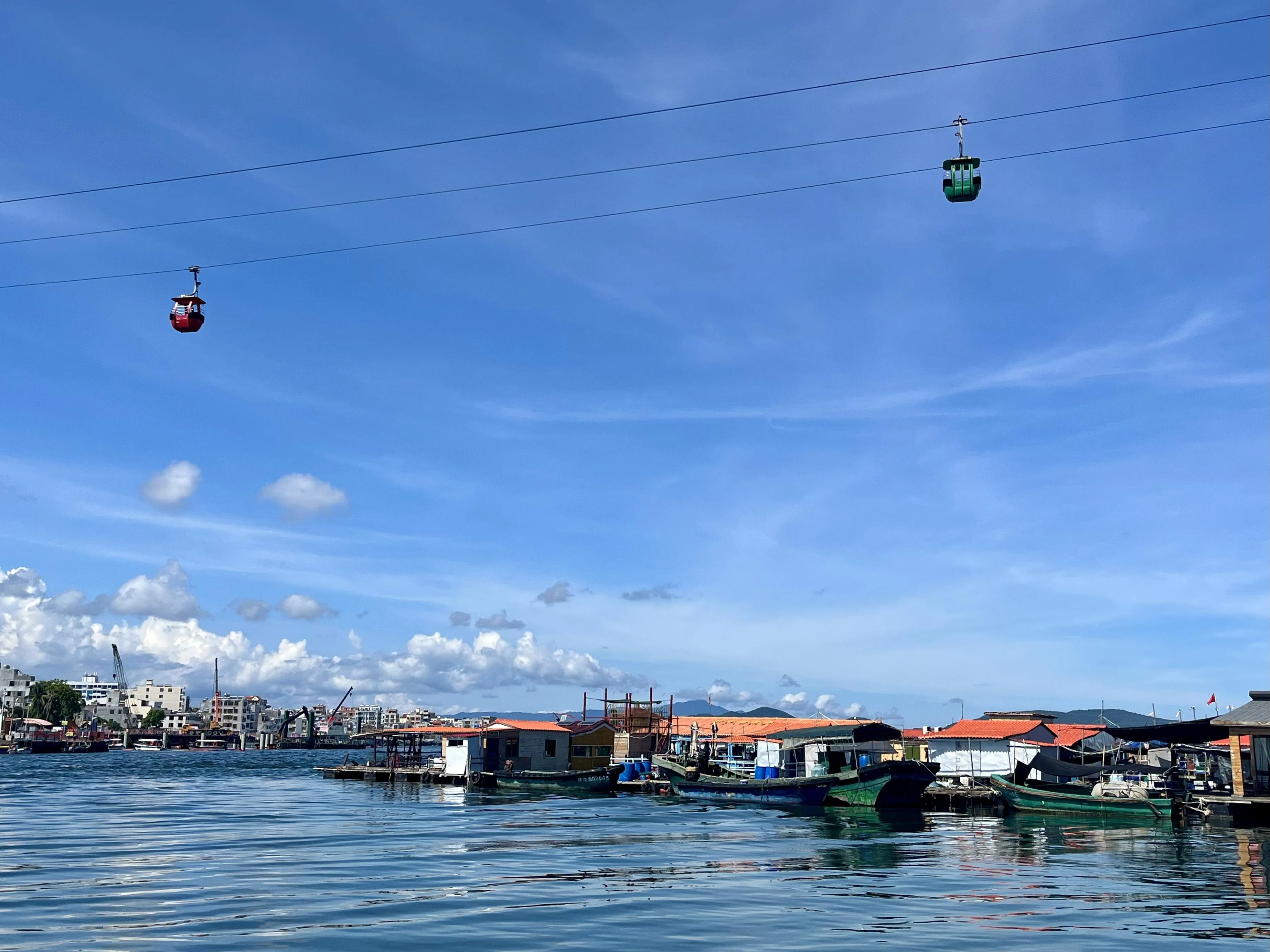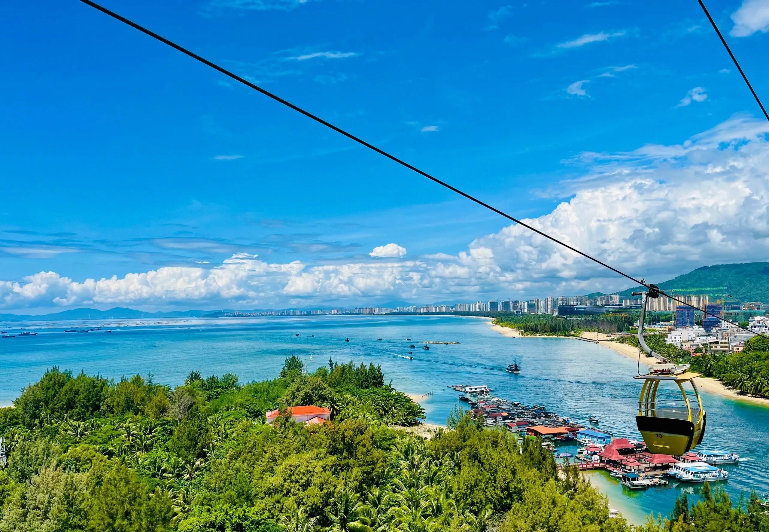 首先是乘坐缆车进入猴岛。虽然天气预报显示可能有雷阵雨,但实际上是个阳光明媚的大晴天。从缆车上俯瞰蛋家鱼排,海水清澈见底,景色格外迷人。高处的凉爽更是让人心旷神怡。