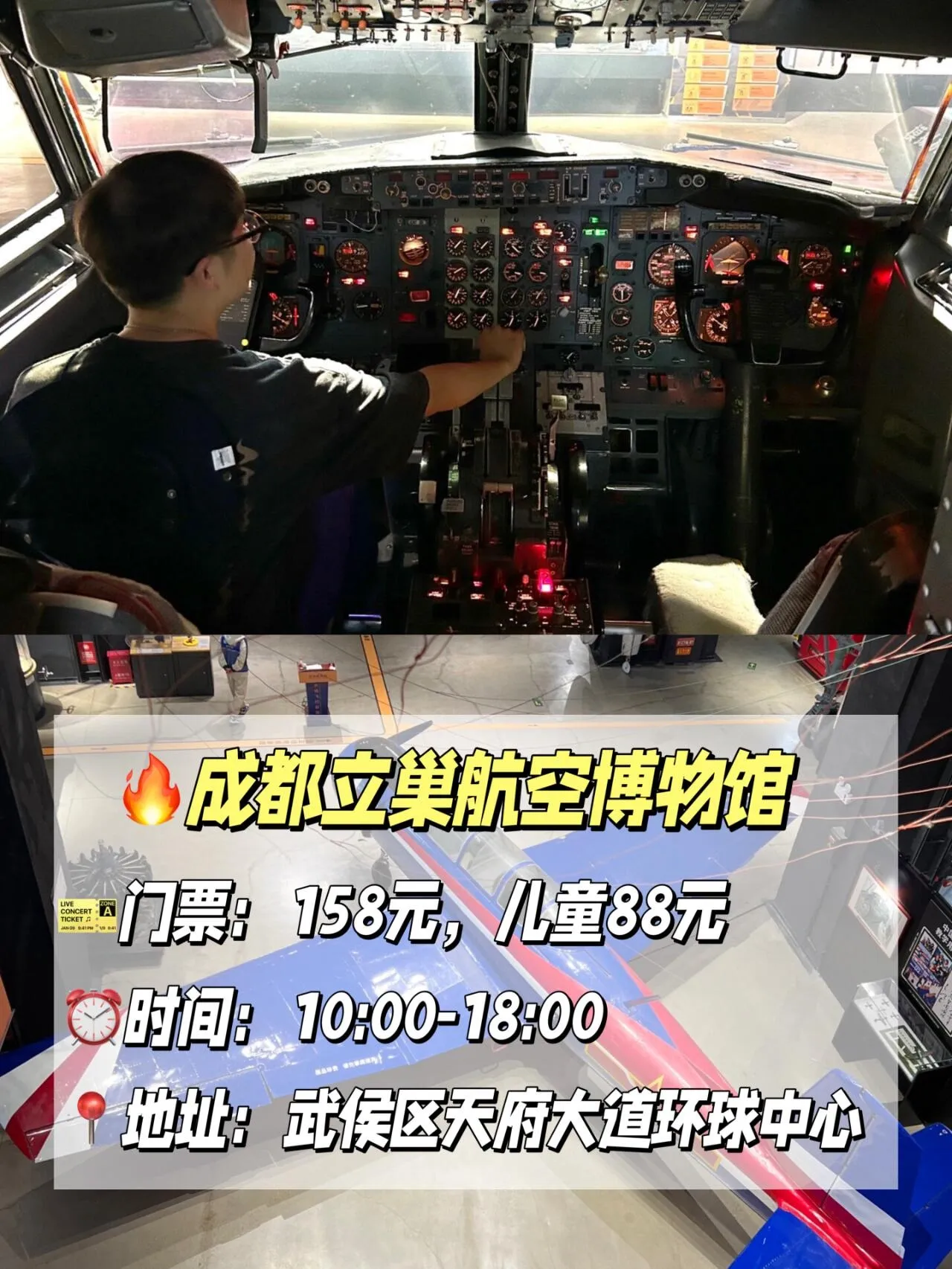 成都立巢航空博物馆:门票价格为1.1米以下儿童免票,儿童票88元,成人票158元。位于地铁锦城广场A出口附近,开放时间为10:00-18:00。