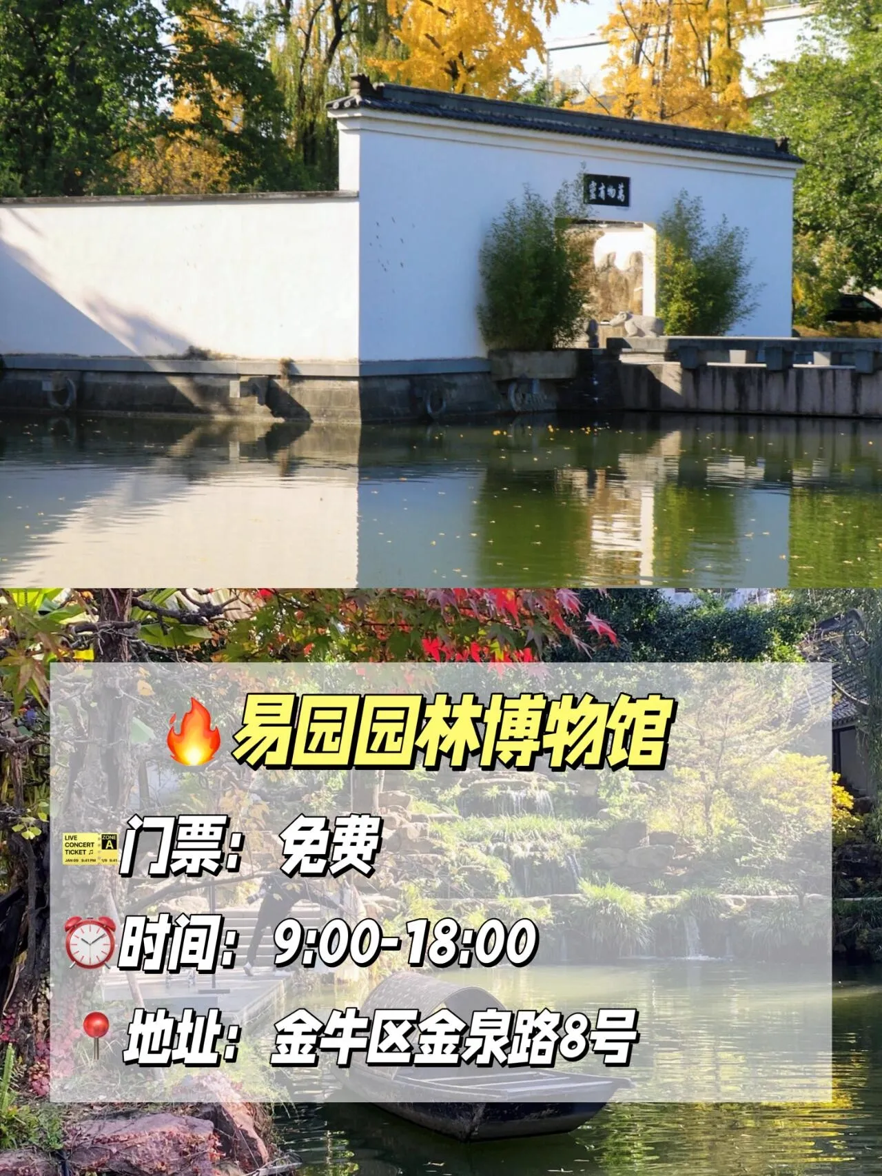 易园园林博物馆:免费参观,展示蜀风汉韵、川派园林和古蜀金牛坝历史文化。地址在成都金牛区金泉路8号,园区内有停车场。可以将其与天府艺术公园蜀园、天府美术馆和天府人文艺术图书馆组成一条文化游览线路。