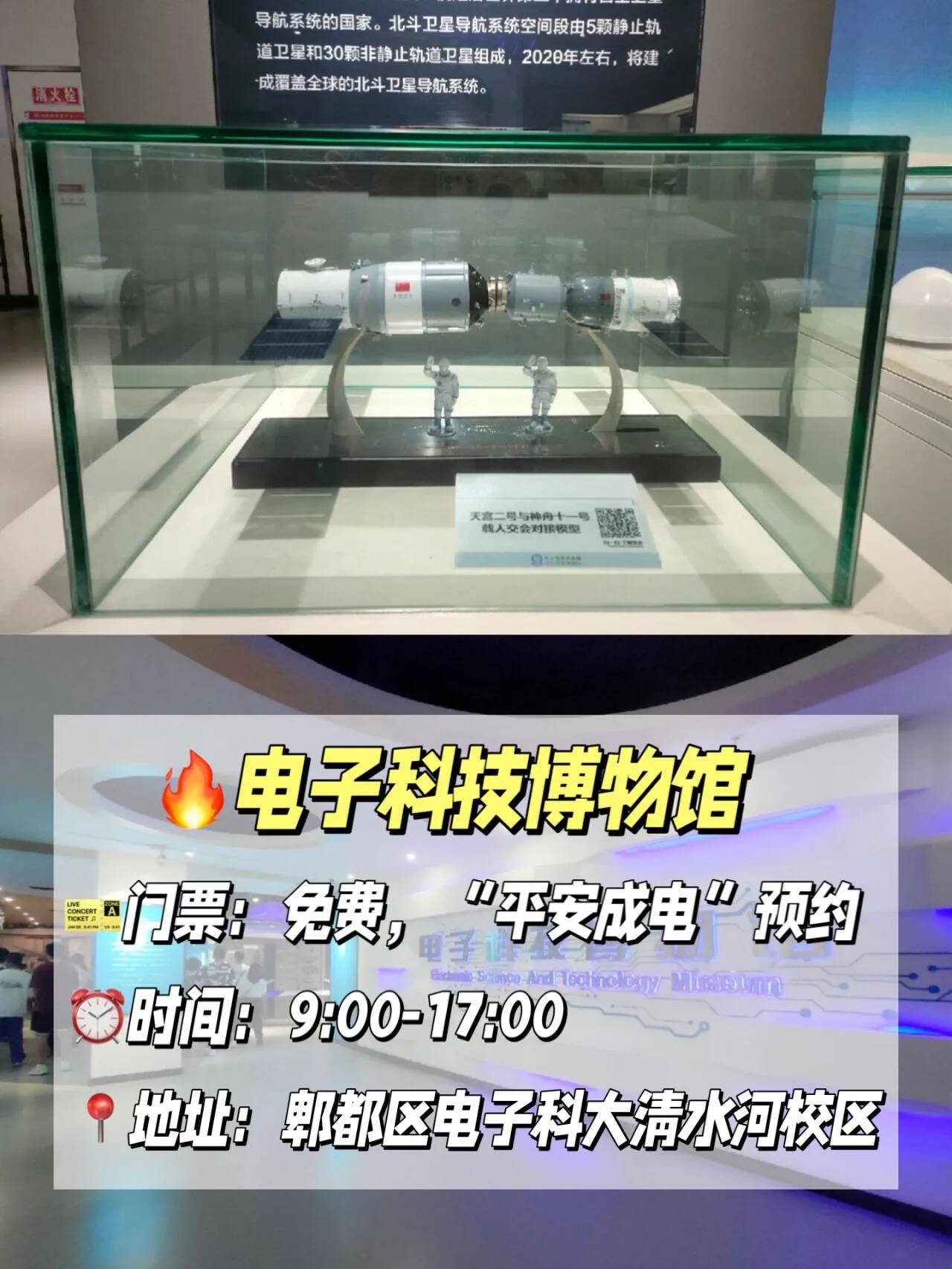 电子科技博物馆:位于电子科技大学清水河校区,展示通信、通讯和电子硬件。需通过“平安成电”公众号预约进校。交通便利,有轨电车2号线可直达。开放时间为上午9:00-12:00,下午14:00-17:00(1:30后停止进馆)。