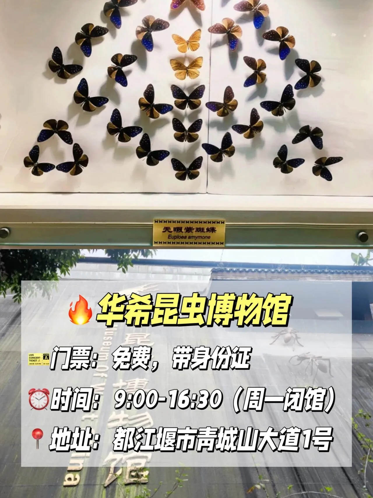 成都华希昆虫博物馆:免费参观。交通方式为乘坐地铁2/6号线至犀浦站,然后乘火车36分钟到青城山站,最后步行20分钟即可到达。