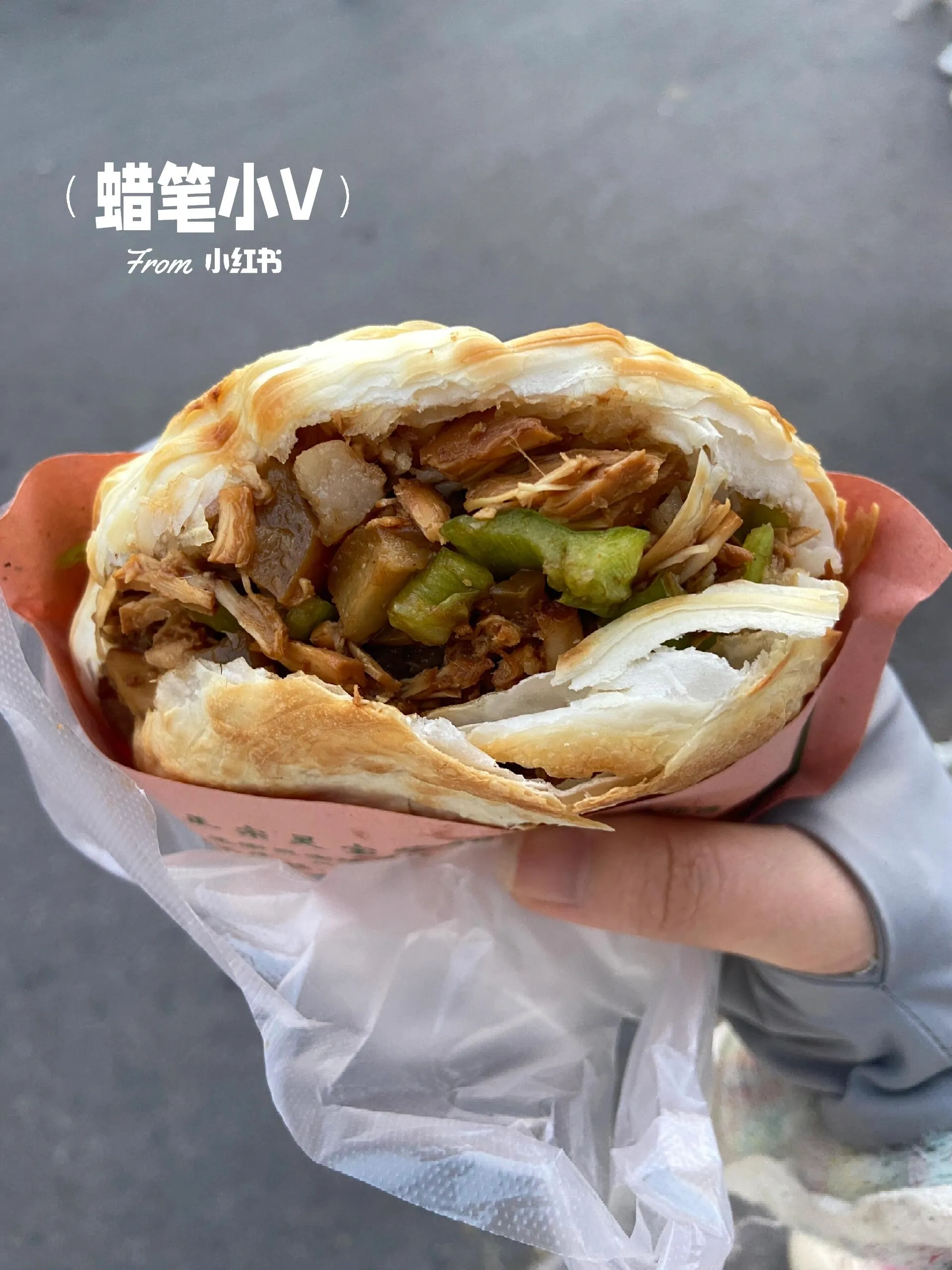 5-10元。酥皮肉夹馍,外皮千层酥脆。里面加的肉多,有肥有瘦。
