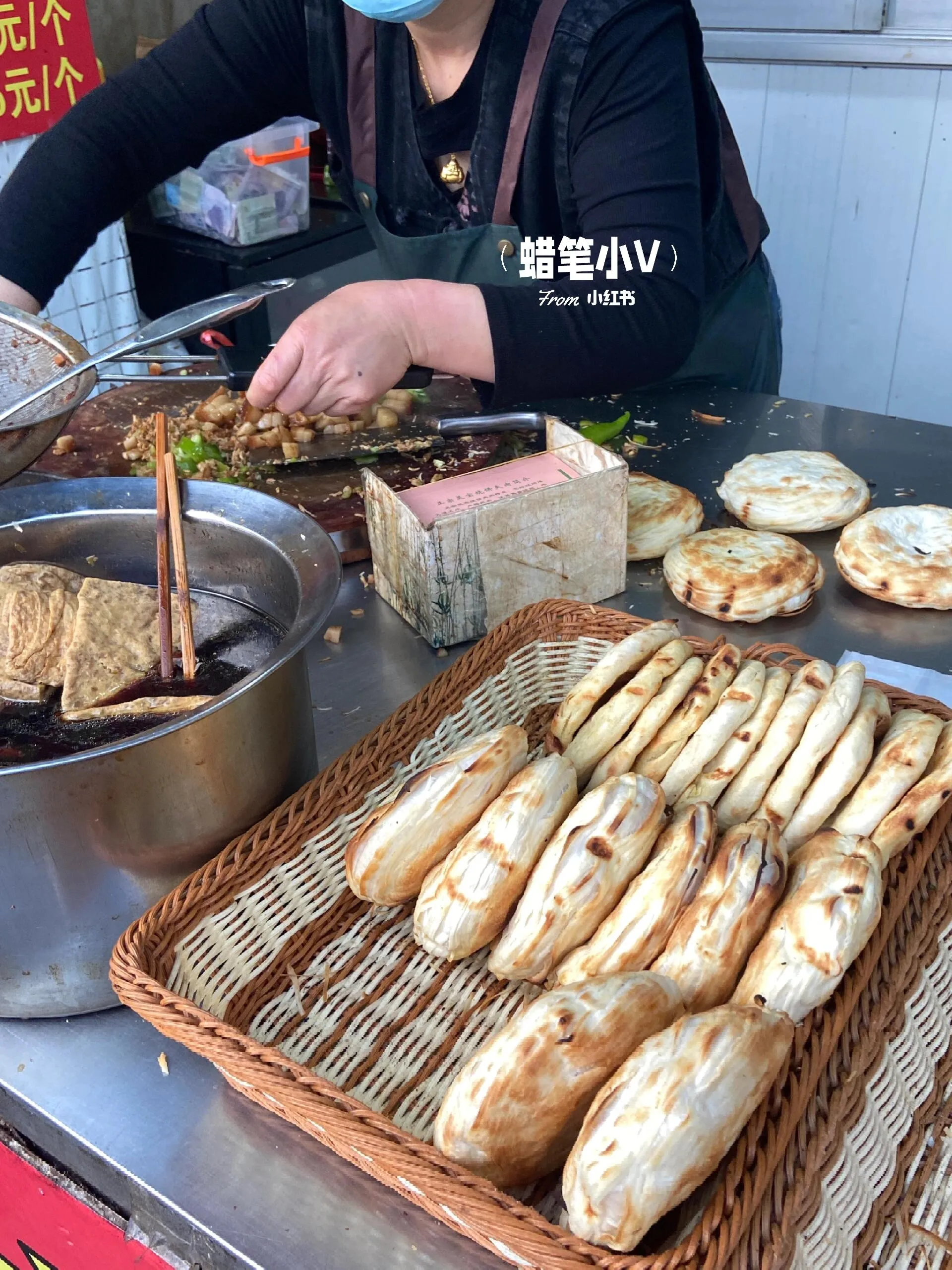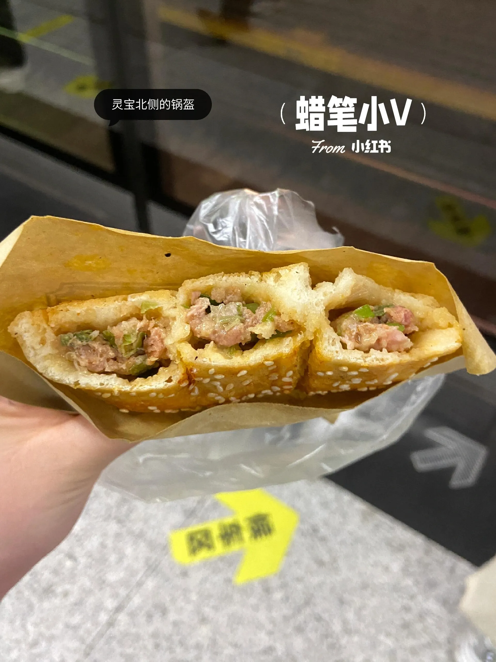 团购价3.8元。在灵宝肉夹馍旁边,推荐鲜肉锅盔。刚出炉时热呼呼的,加了很多肉。外皮烤得酥脆香甜,里面软软的,肉馅还有葱花,很香。