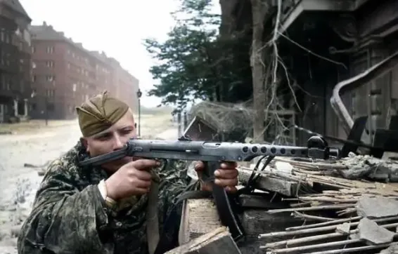 画面中左数第二个士兵手中拿着缴获的德国MP-40冲锋枪,是战斗的见证。