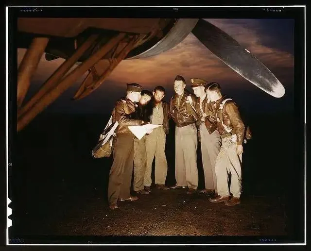 战斗人员在乘坐YB-17轰炸机,从弗吉尼亚起飞前接到最后指令