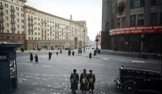 画面中苏军士兵正在街头巡逻,虽然此时的莫斯科一片宁静