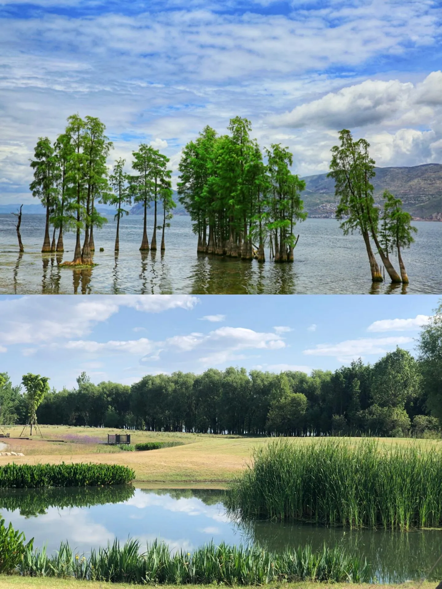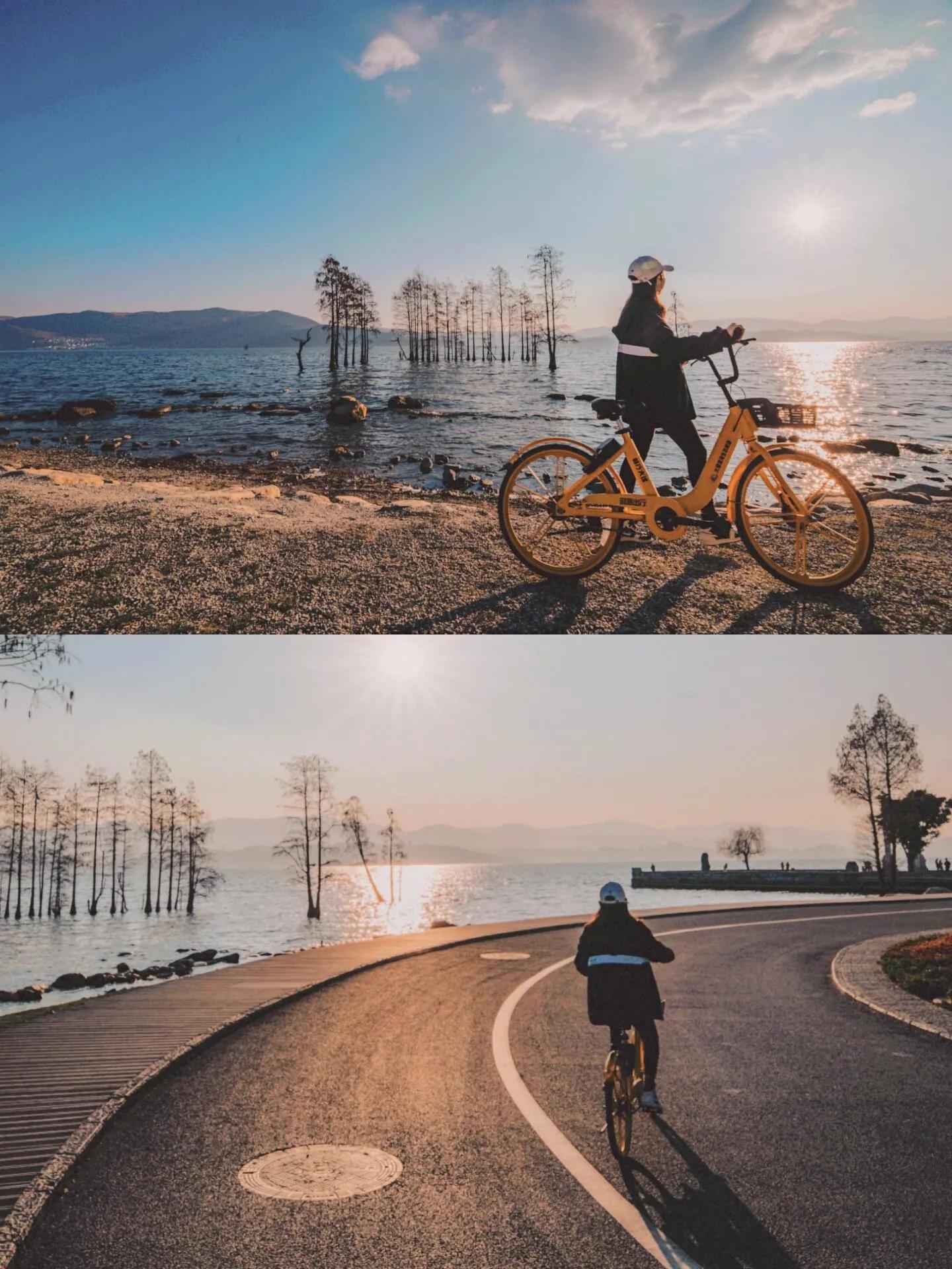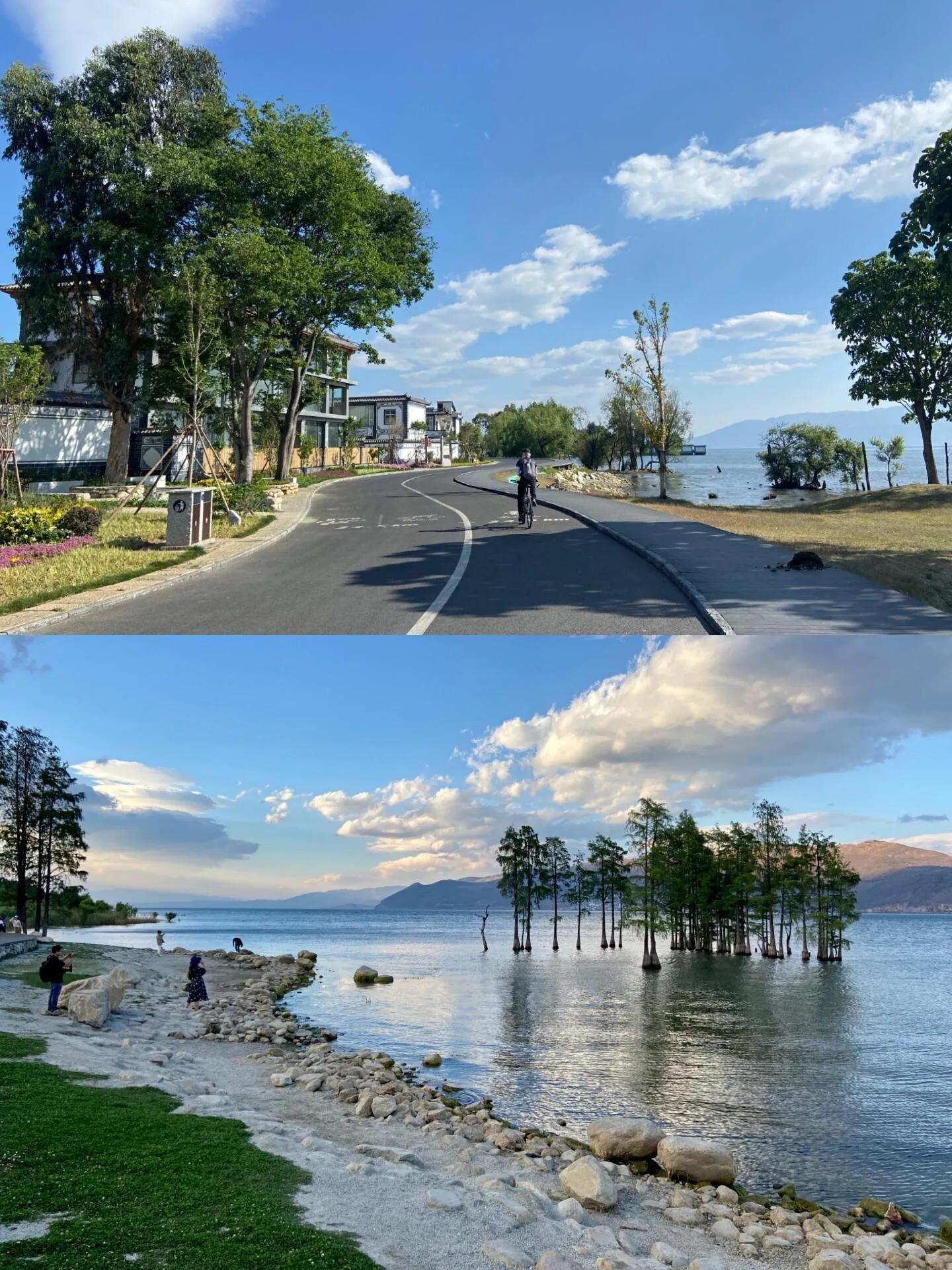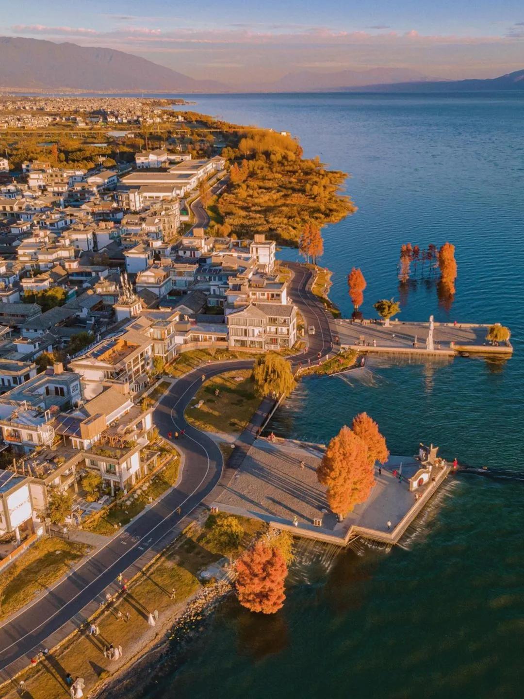 洱海边除了蓝海绿草,还有许多生长在浅滩里的杉树,尤其是在秋冬时节变红,景色十分优美,随手拍照都很好看。