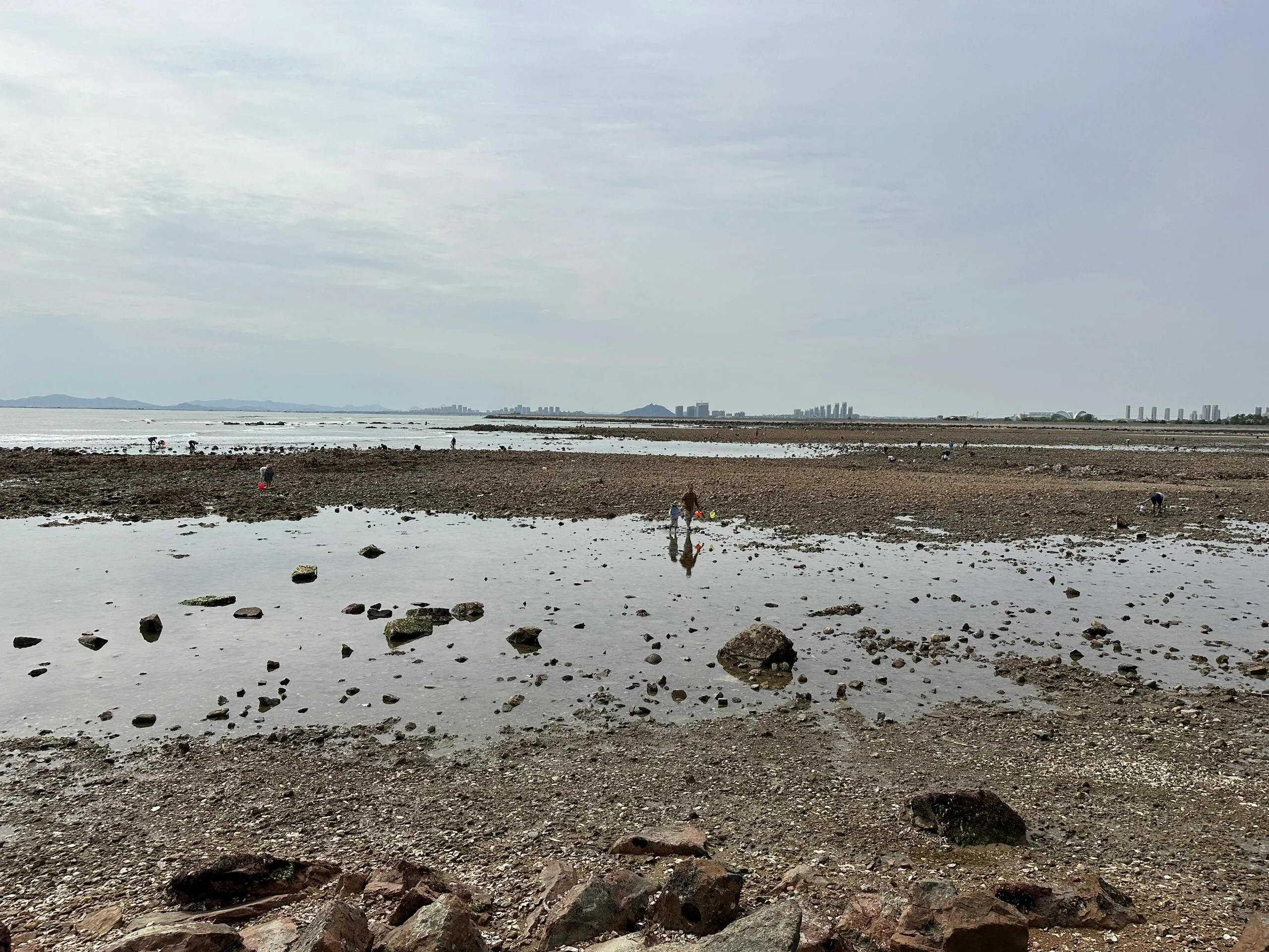 退潮后会露出礁石,水里有很多小鱼、小螺和生蚝