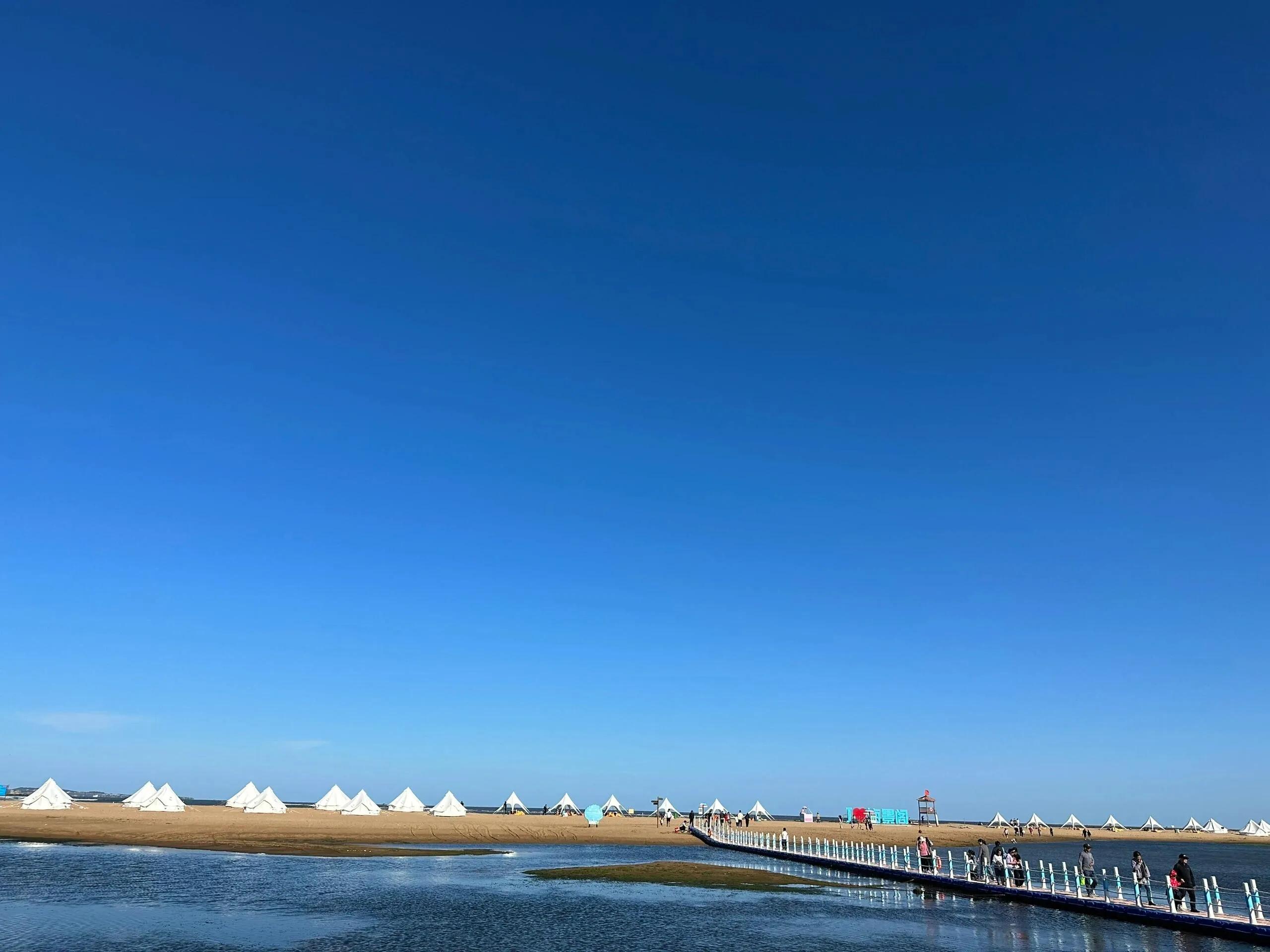 。从小浮桥过去,成人20元/位,儿童免费。付费后会得到一件荧光绿小马甲。赶海时可以跟着当地专业人员(穿橙色马甲)学习。抓蛏子的方法是先用小锄子把表层沙子铲平,找到扁型或8字型的小洞,然后往洞上撒盐,蛏子就会冒出来。赶海后,小朋友还可以在沙滩上玩耍,大人可以休息看风景。