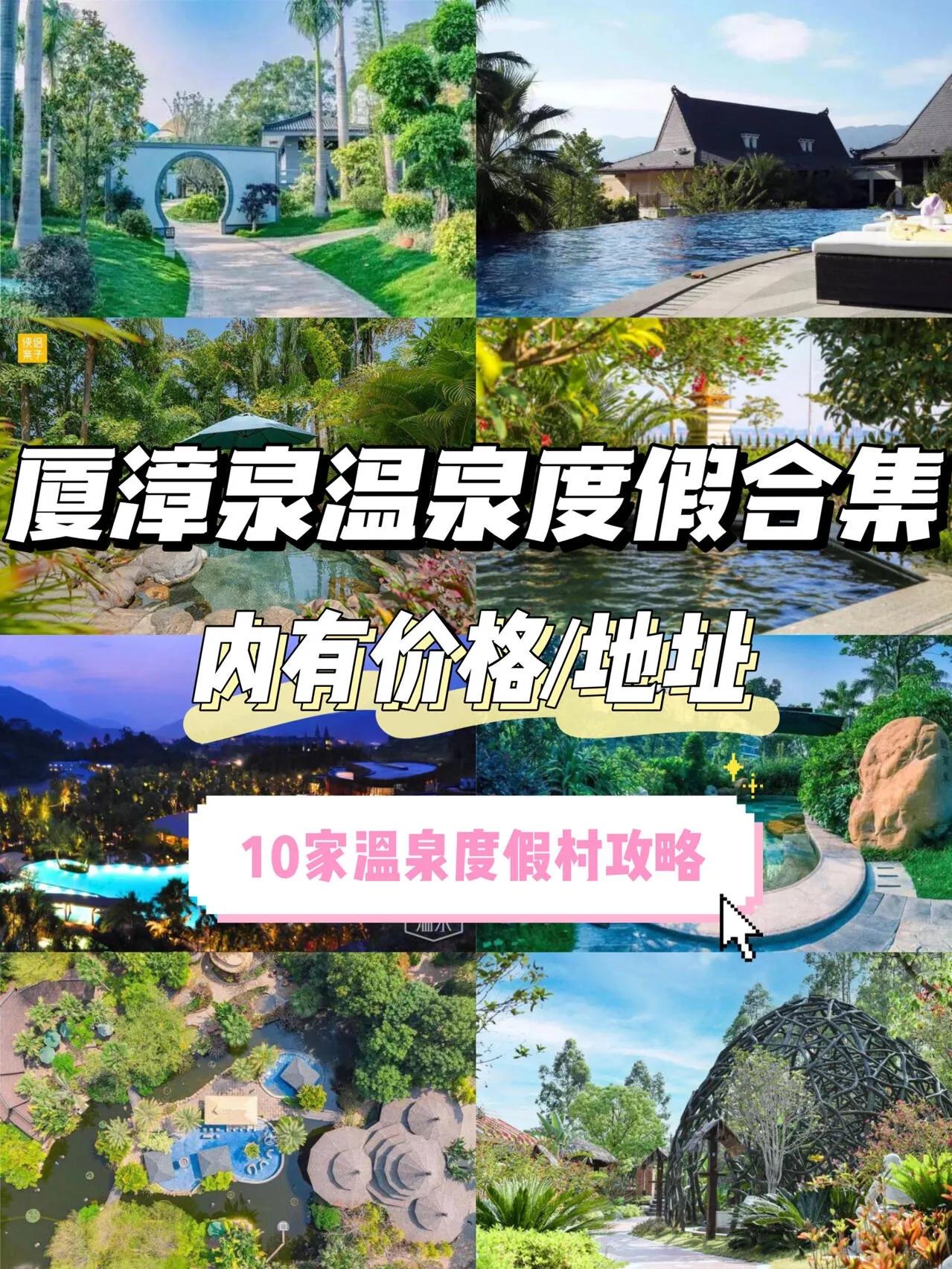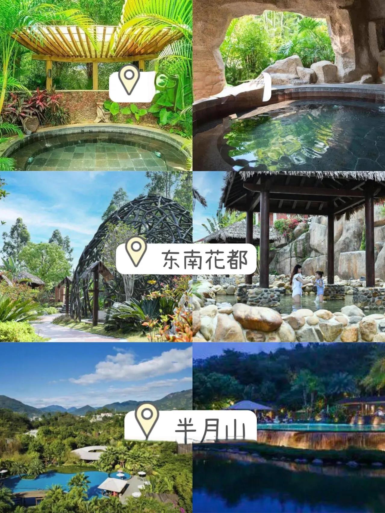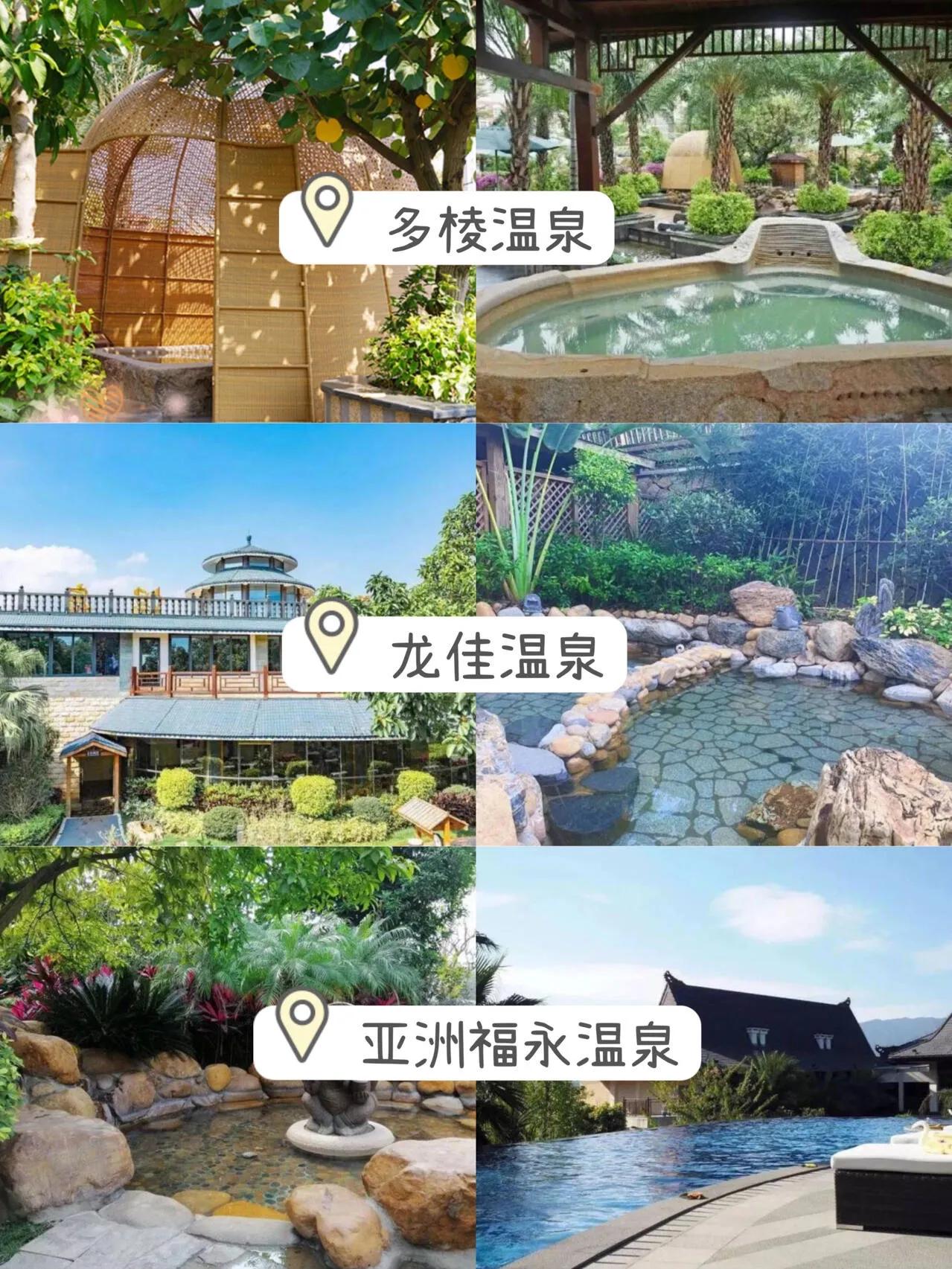龙佳生态温泉山庄:园区拥有36个露天温泉池,是3A级园林式生态旅游度假胜地。从厦门或漳州出发约20公里,交通便利。地址是漳州市台商投资区角美镇,温泉加水上乐园周末票98元,平日票88元。