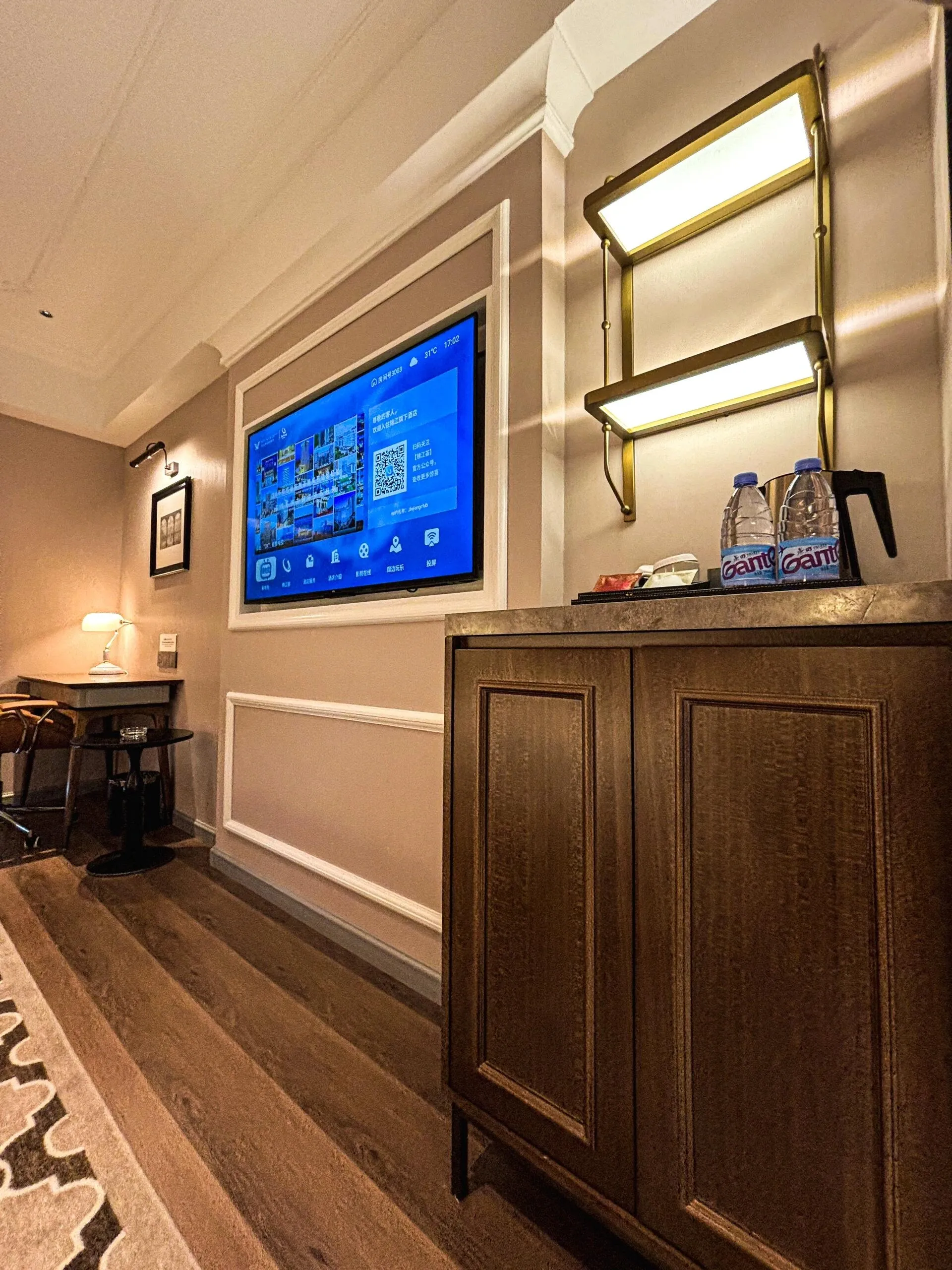 酒店内部采用欧式装修风格 ,实木地板和沙发彰显优雅,办公桌也采用实木材质,质感十足。超大投屏电视带来震撼的视觉体验,品牌矿泉水免费续杯,贴心周到。