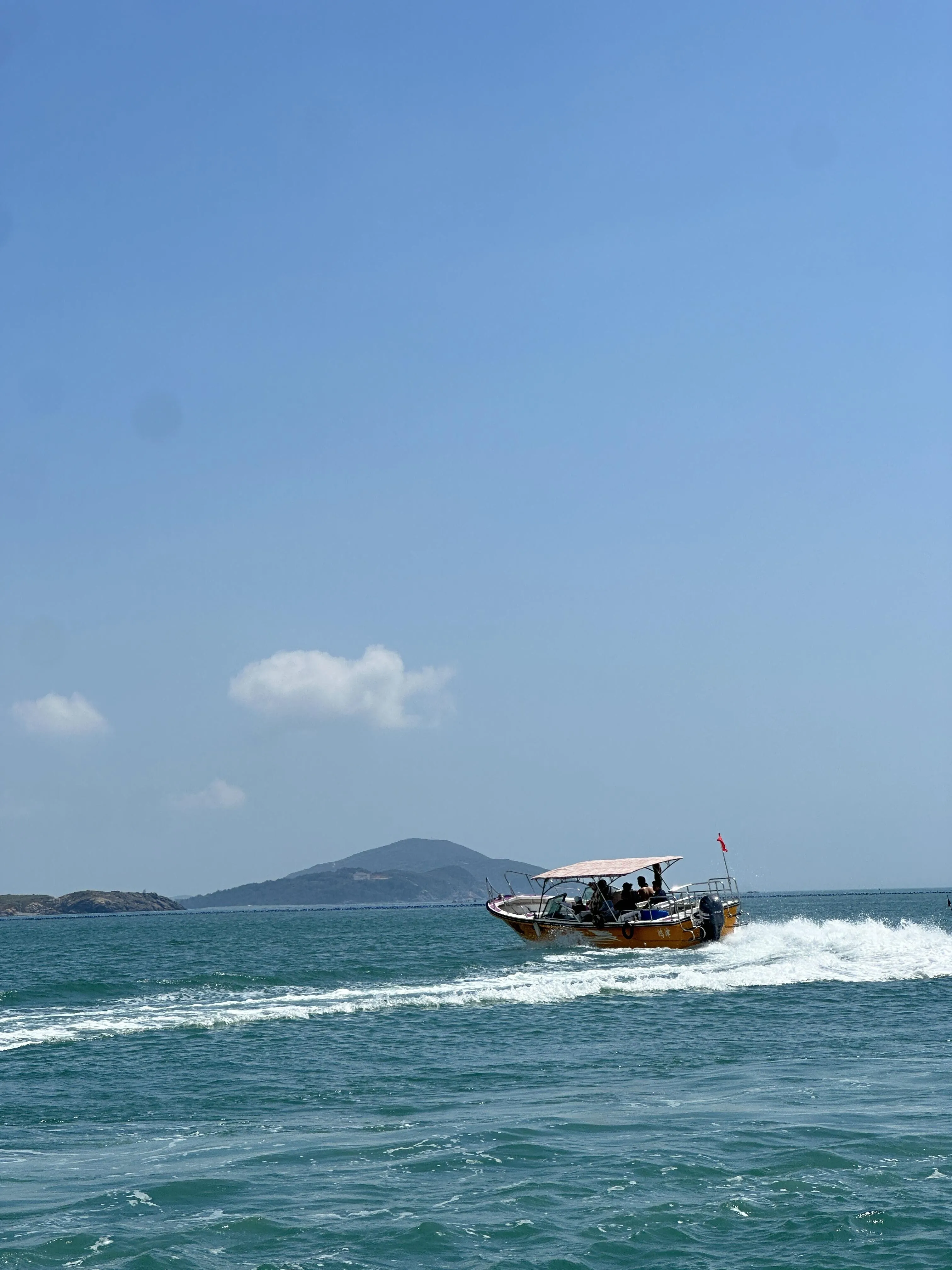 睡到自然醒,9点再访龙王头沙滩。白天有丰富水上项目,如摩托艇(200元/大小)、船(150元/两大一小),价格可议。