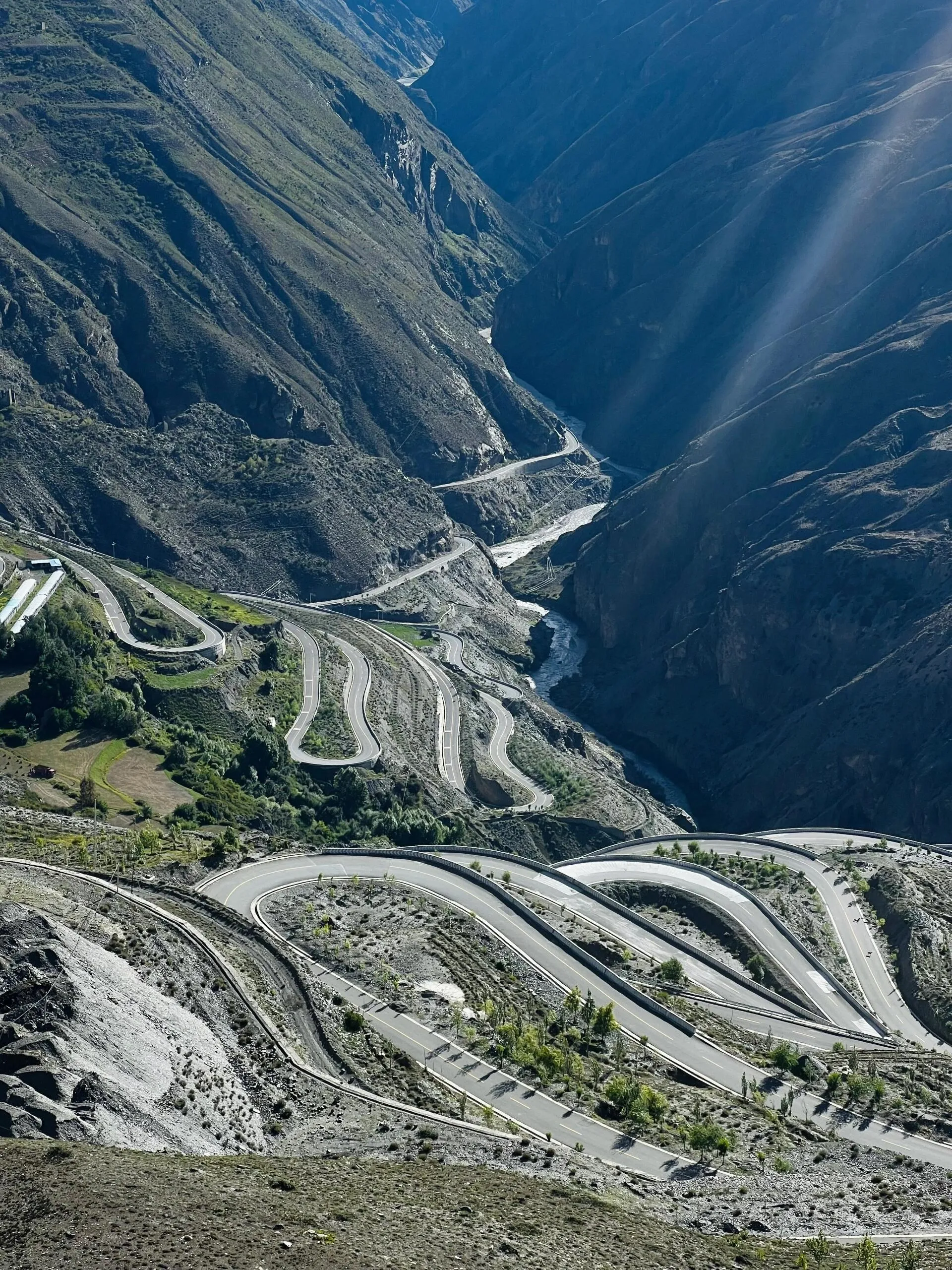 接下来是一段惊心动魄的峡谷骑行。海拔骤降2000多米,两侧是高达1000多米的陡峭山壁。石峰直插云霄,给人强烈的压迫感。峡谷中妖风呼啸,每个转弯都充满未知,仿佛置身于取经路上的狮驼岭。