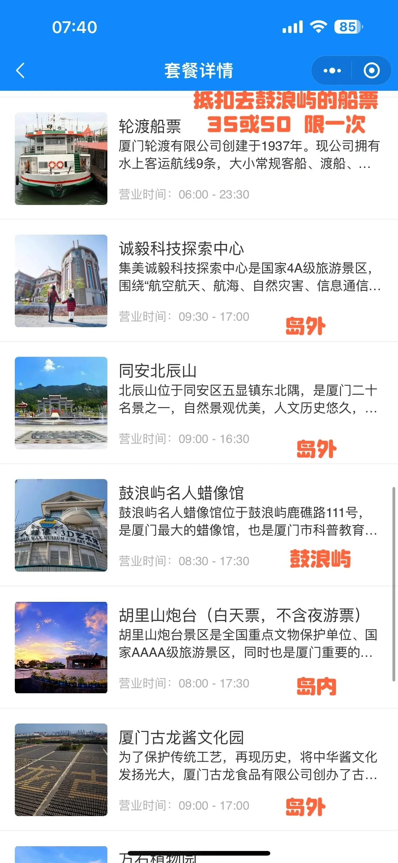 外地游客可以办理厦门旅游通卡,卡价200元,但可以抵扣鼓浪屿35元或50元船票一张。可以关注“厦门旅游通”公众号了解详细信息。通卡包含的景区(项目)比年卡少两个,皓月园和椰风寨海洋科普乐园不在通卡范围内,其他都包含,共22个免费项目。
