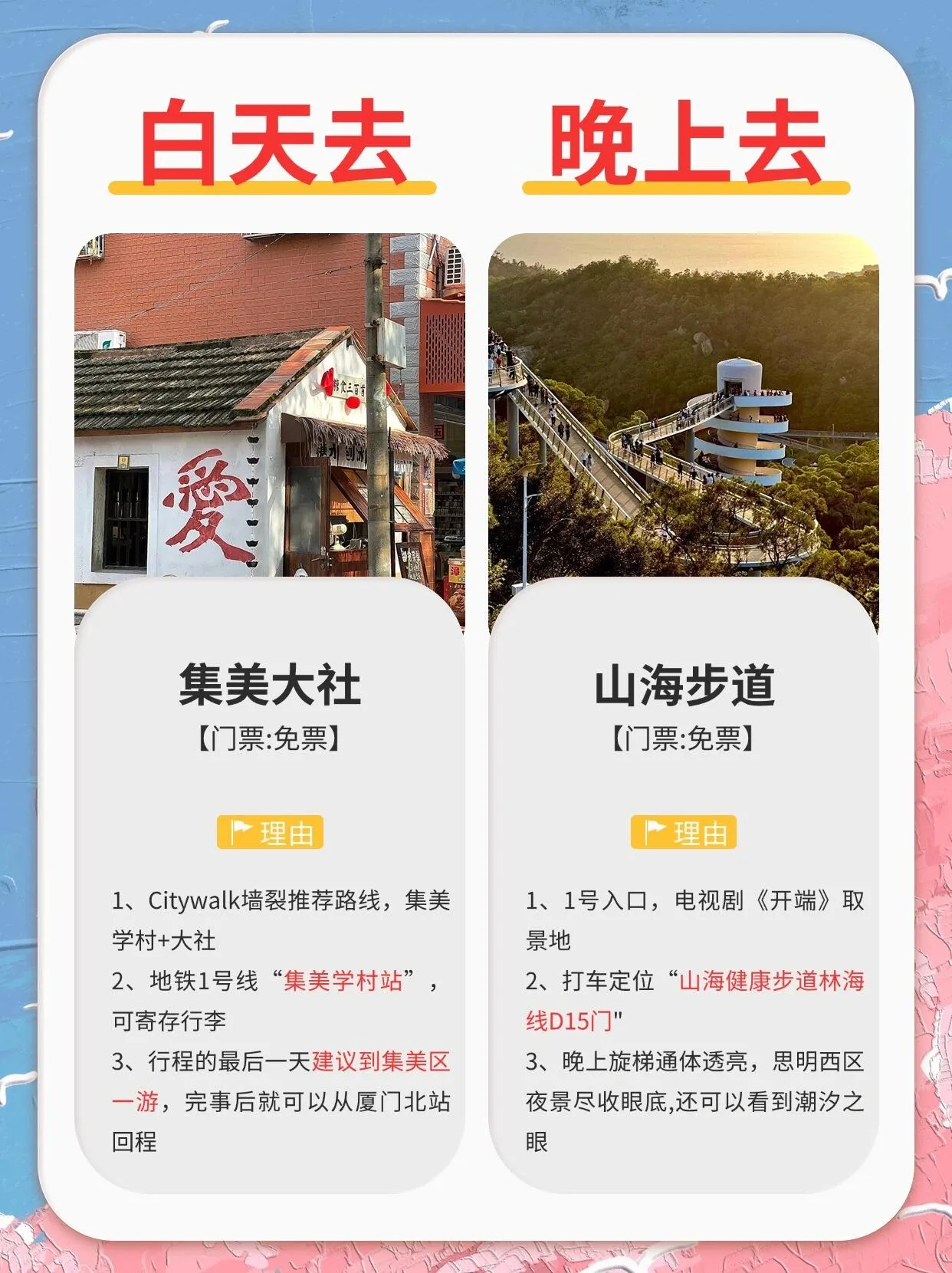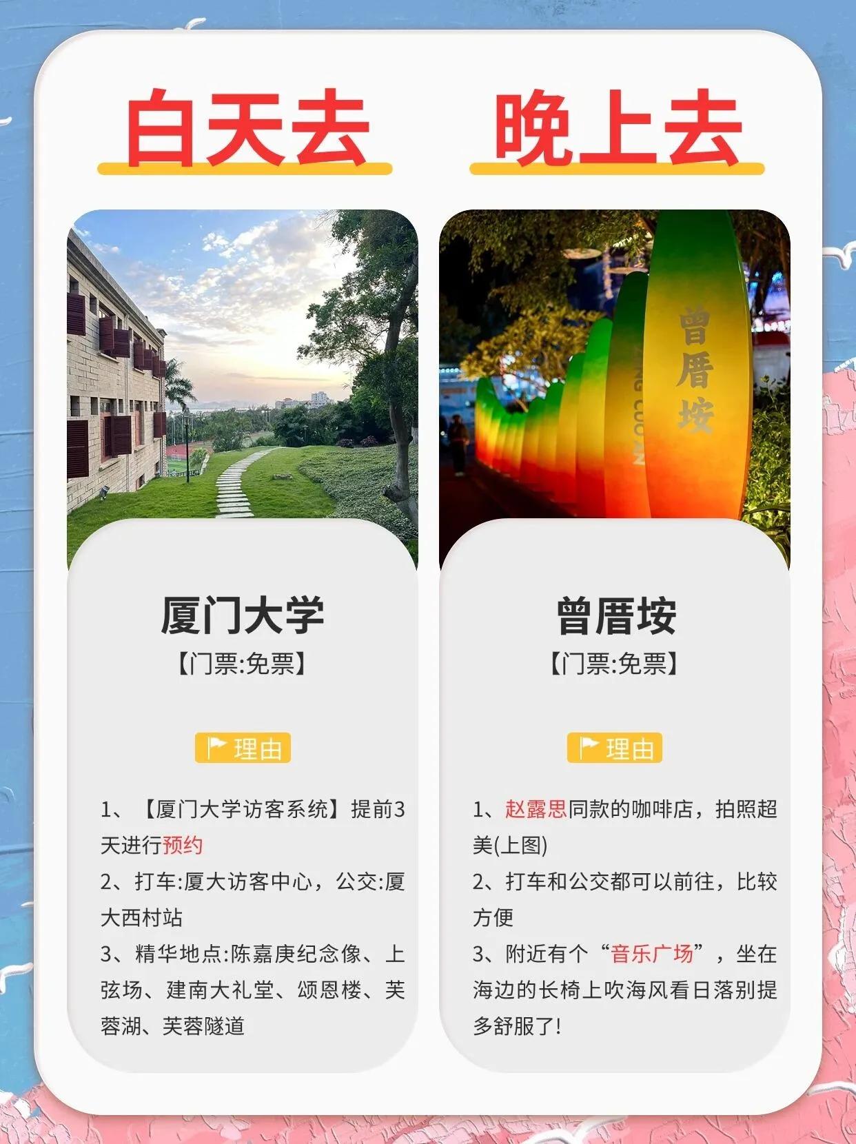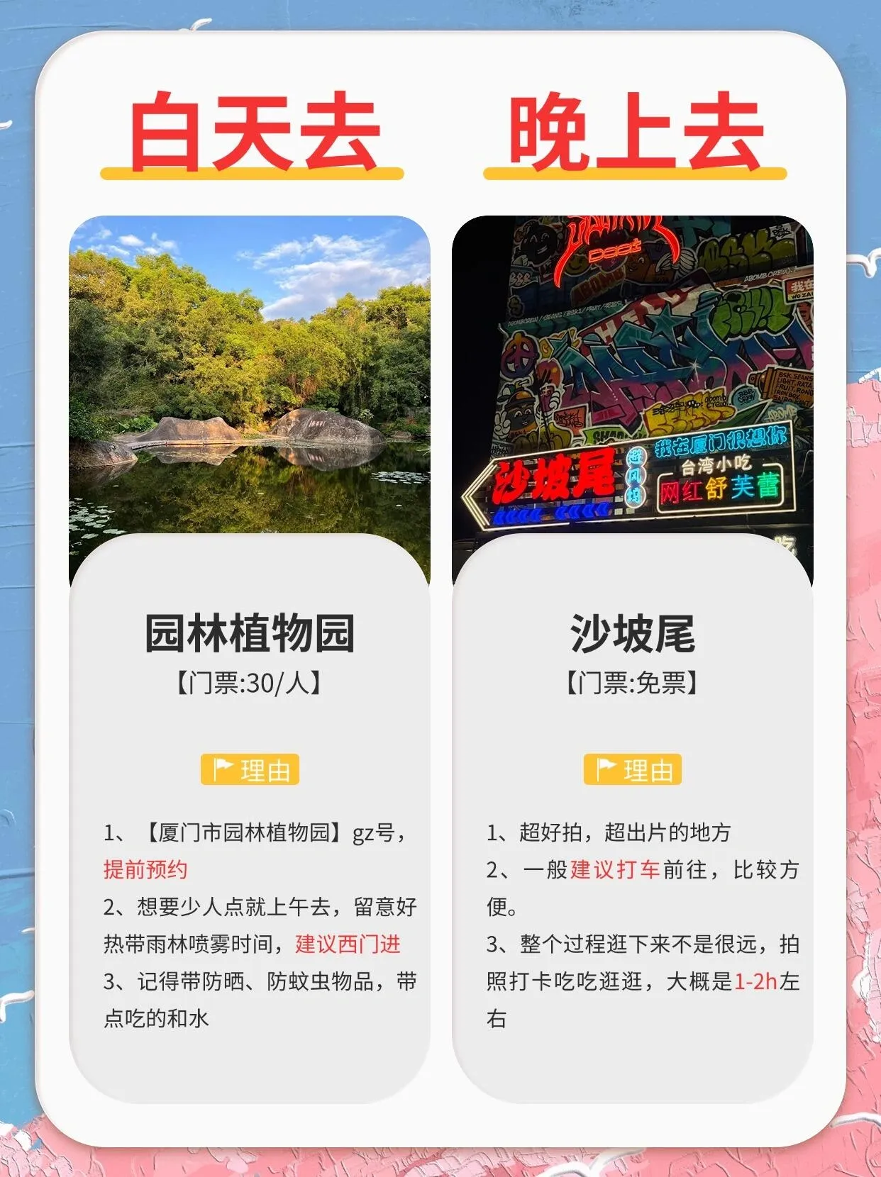 厦门市区:厦门植物园、环岛路、八市、沙坡尾、厦门大学、十里长堤(日落)、南普陀寺等。
