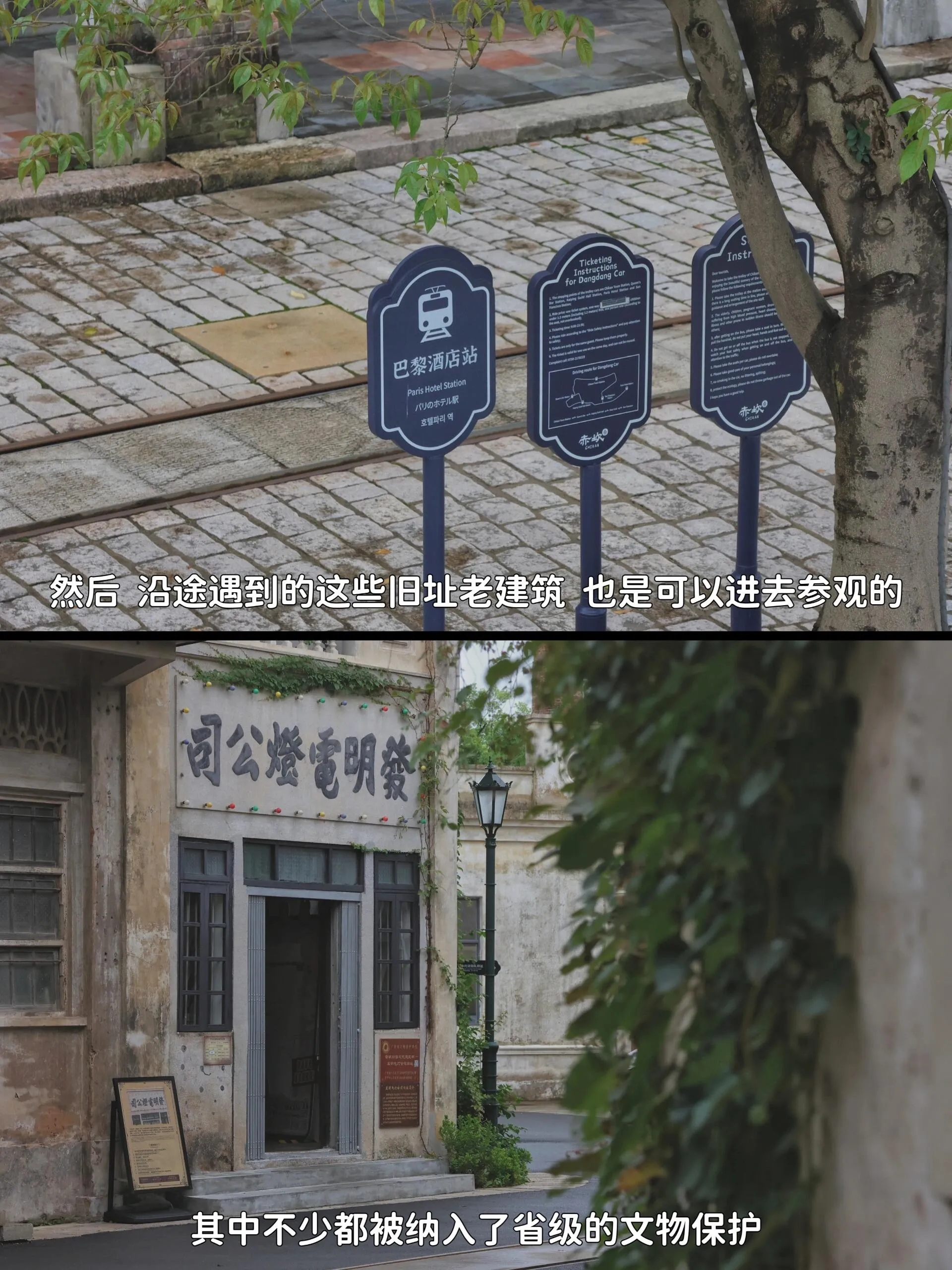 在赤坎镇站坐上铛铛车,车速慢悠悠转一圈接近半小时。会路过堤边,也会穿过民国风情的街巷,还会驶过一个开合式的红铁桥。可以从中间沿途的车站下来,走进去那些旧址老建筑里看看,比如巴黎大旅店旧址、开平灵通电话公司旧址、发明电灯公司旧址等。